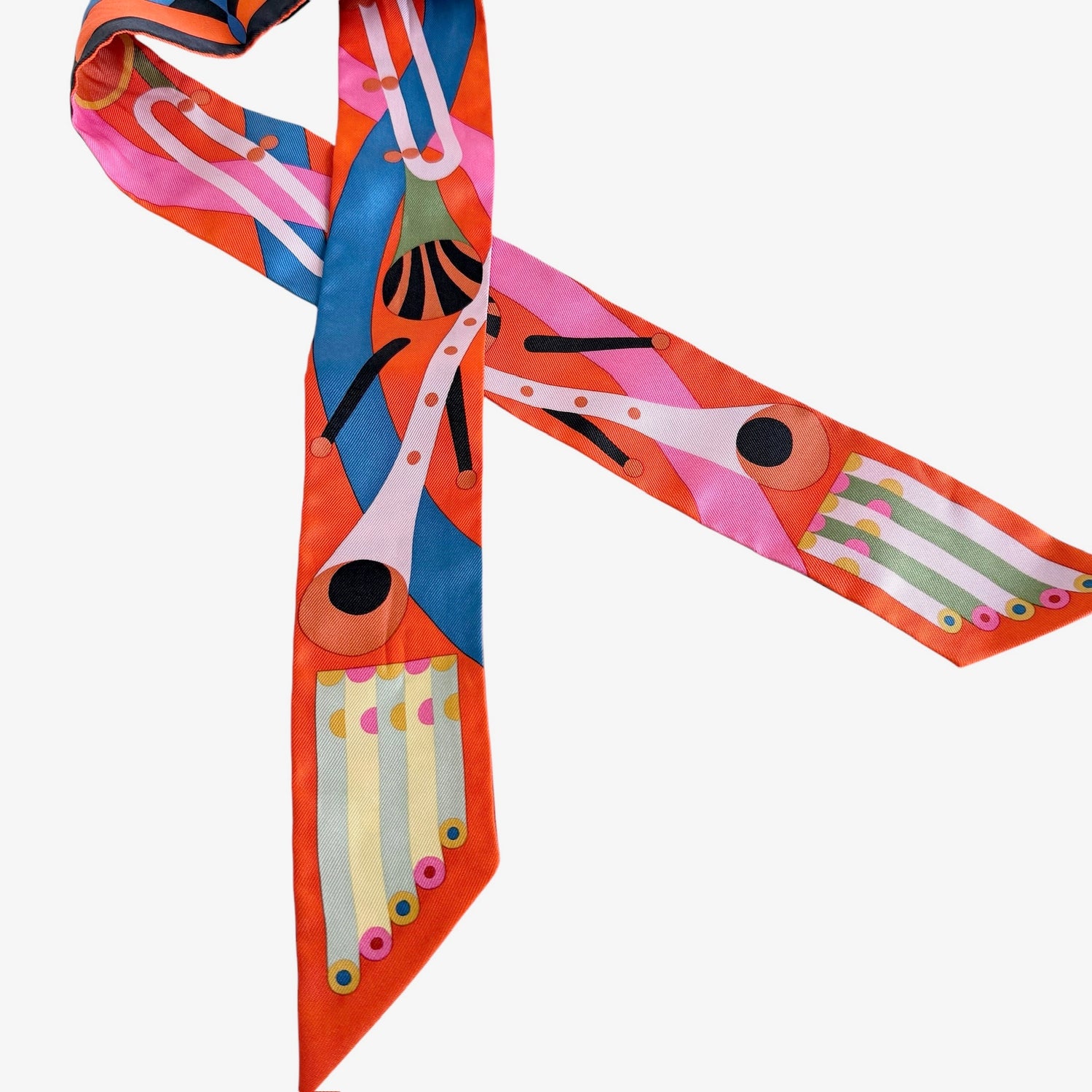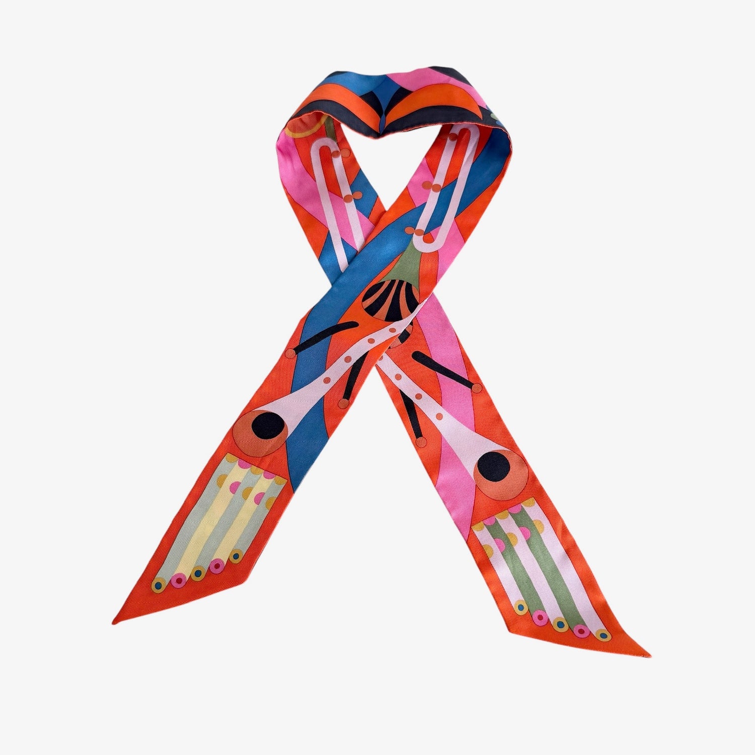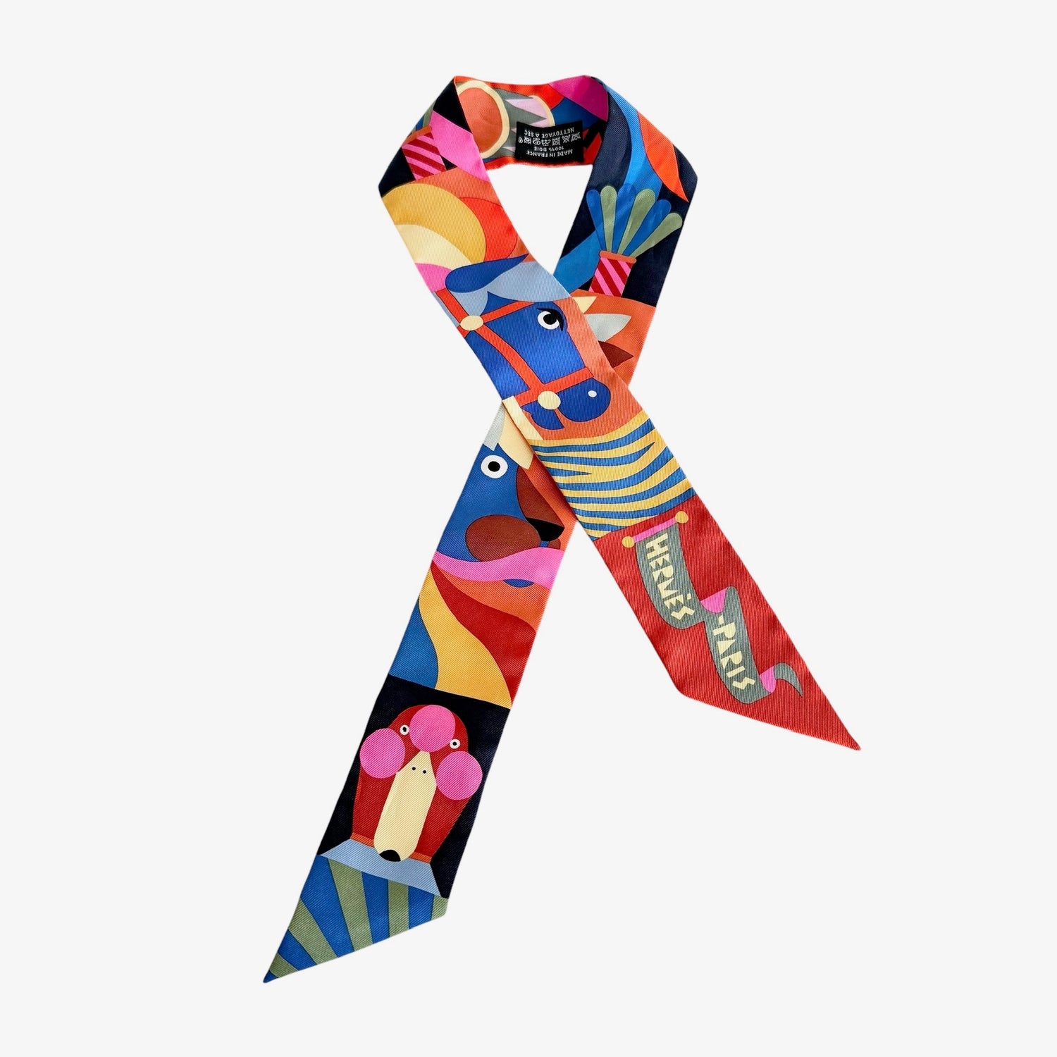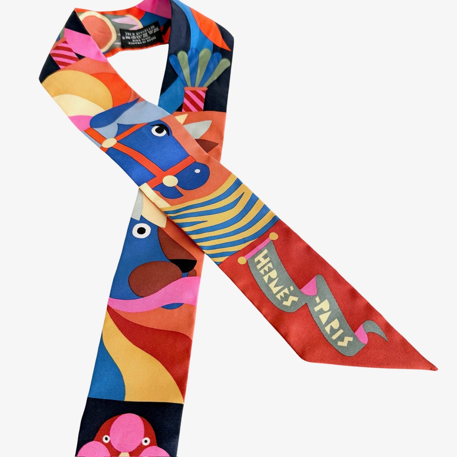 Hermes Twilly Scarf. Multicolor equestrian print. Hermes logo at tip.