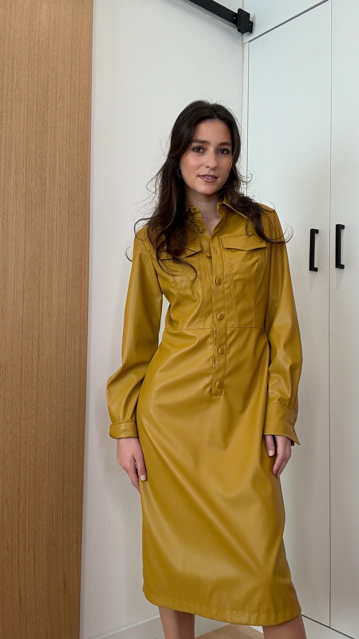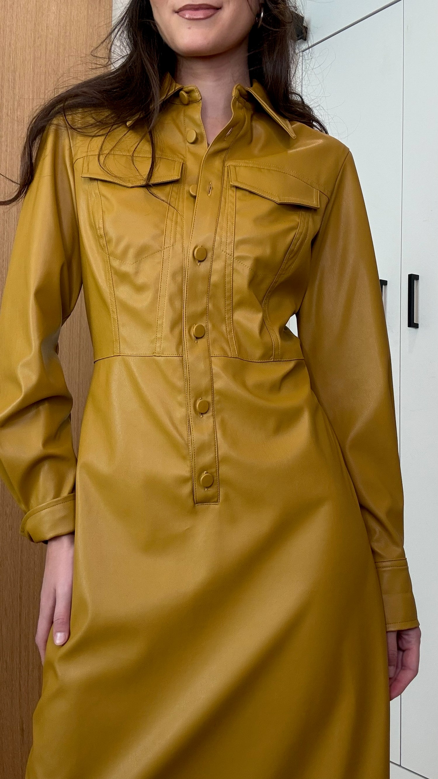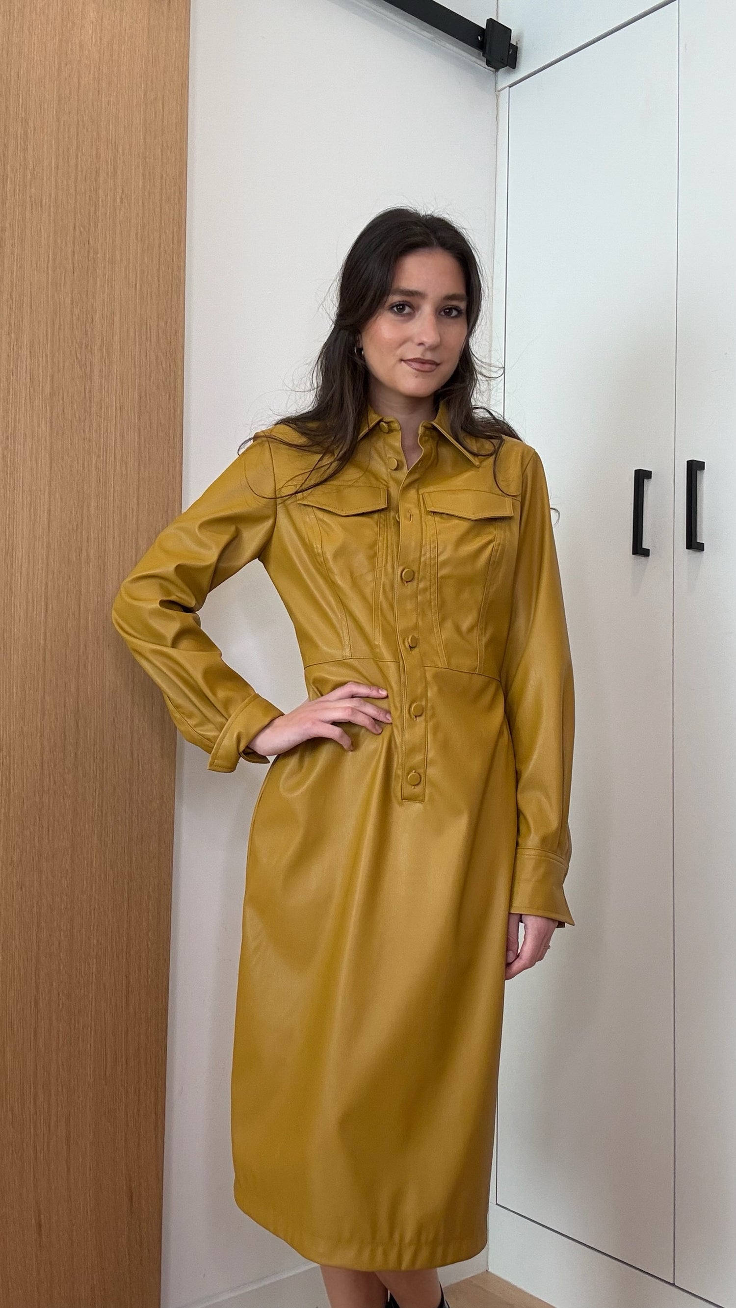 Rachel Comey faux leather dress. Beautiful mustard color. Buttons at front. Pointed collar. Designer size 2.