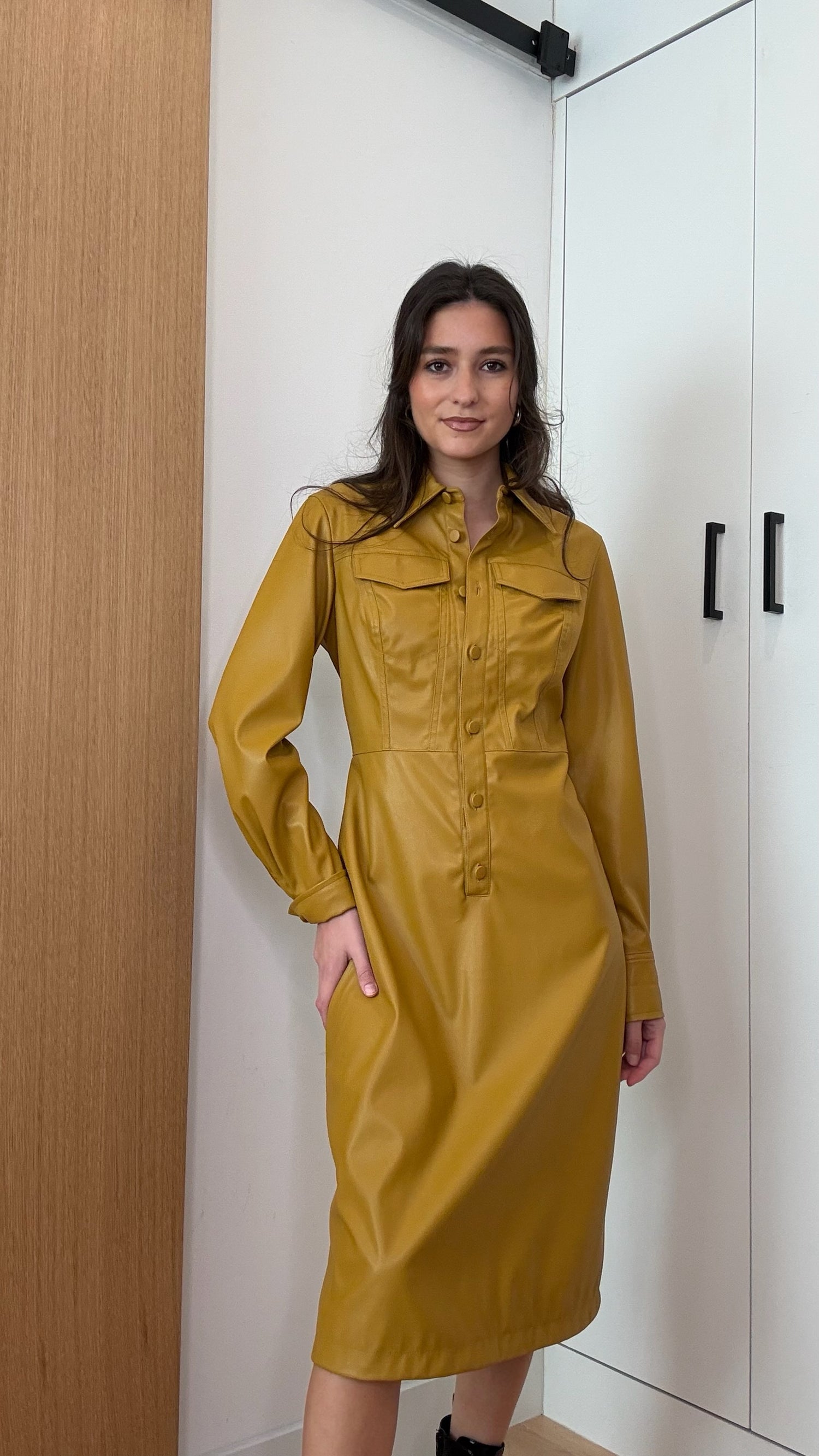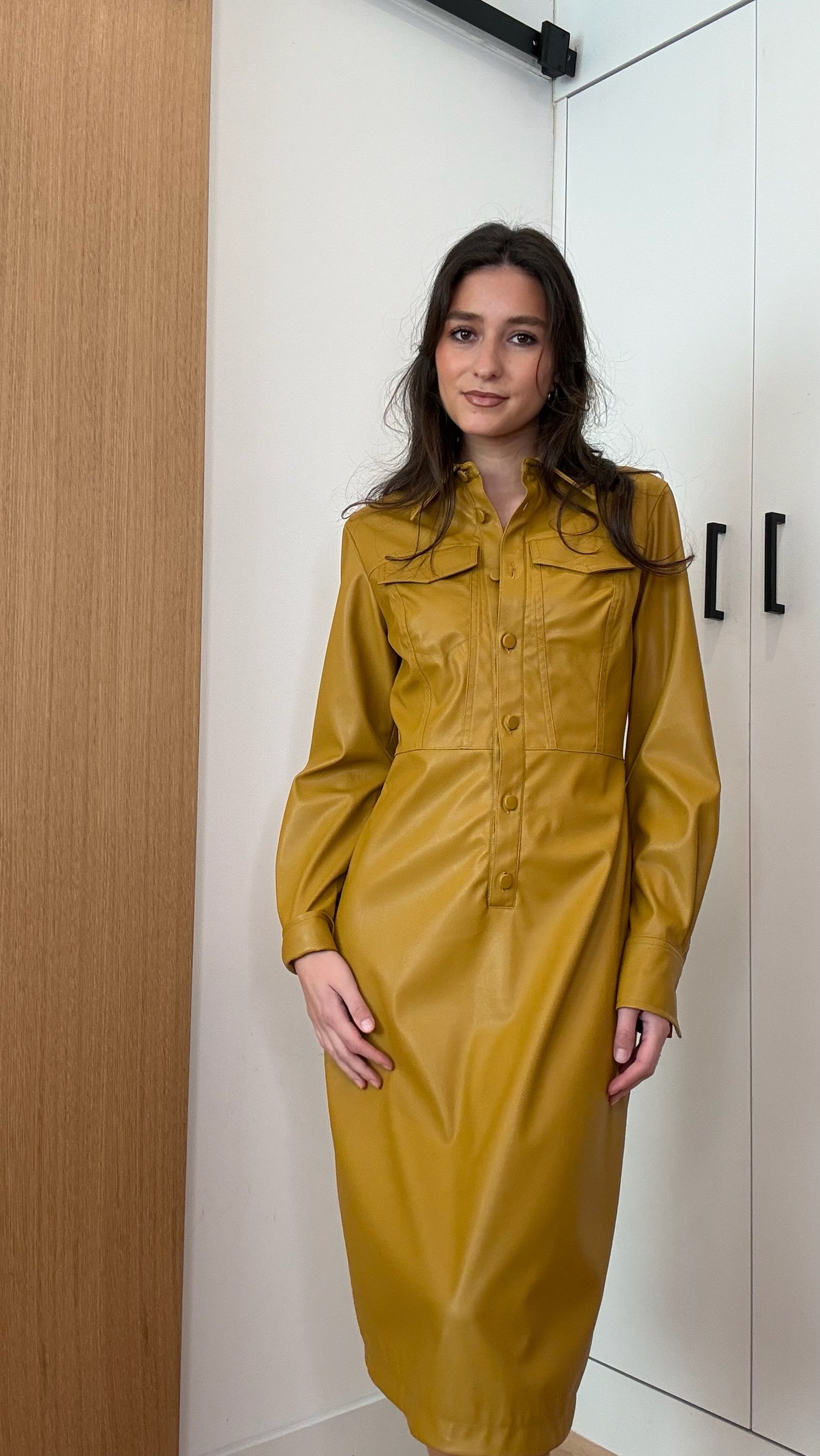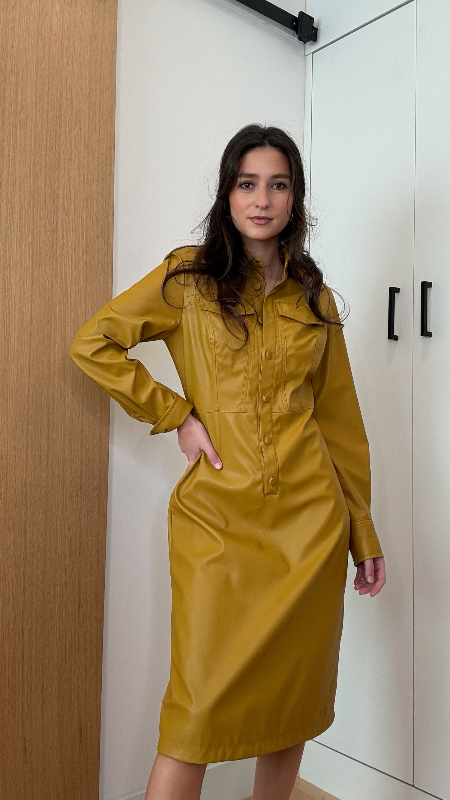 Rachel Comey faux leather dress. Beautiful mustard color. Buttons at front. Pointed collar. Designer size 2.
