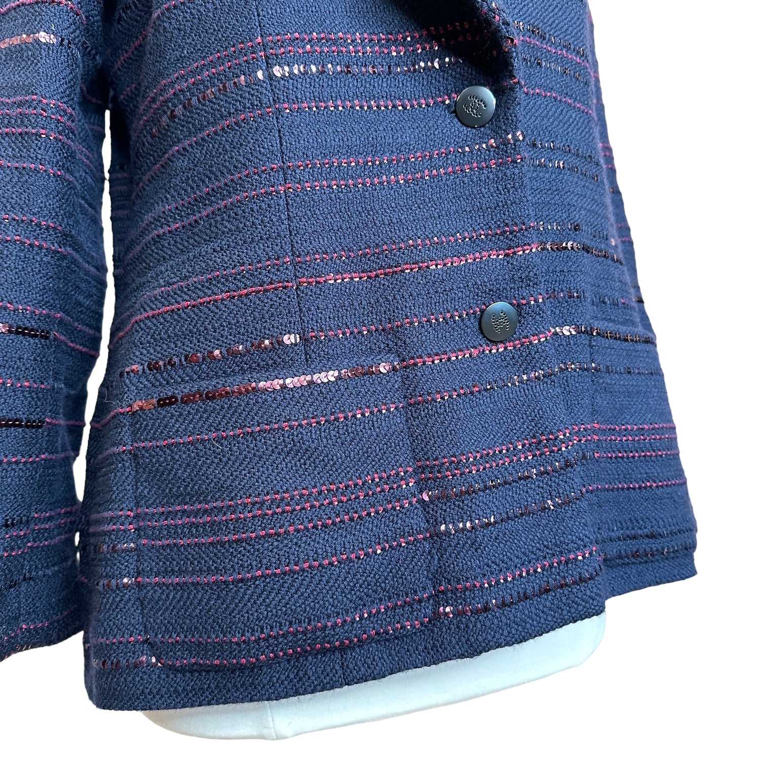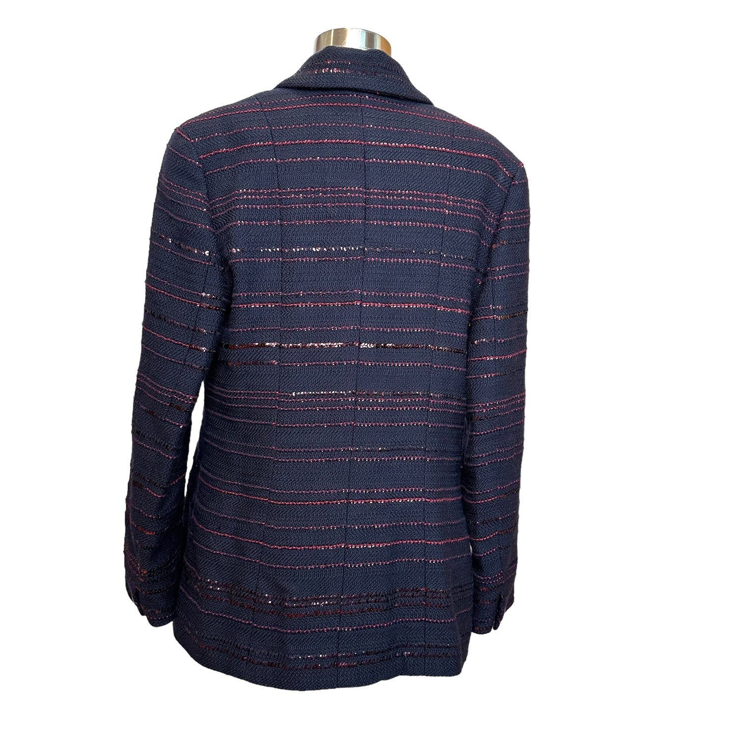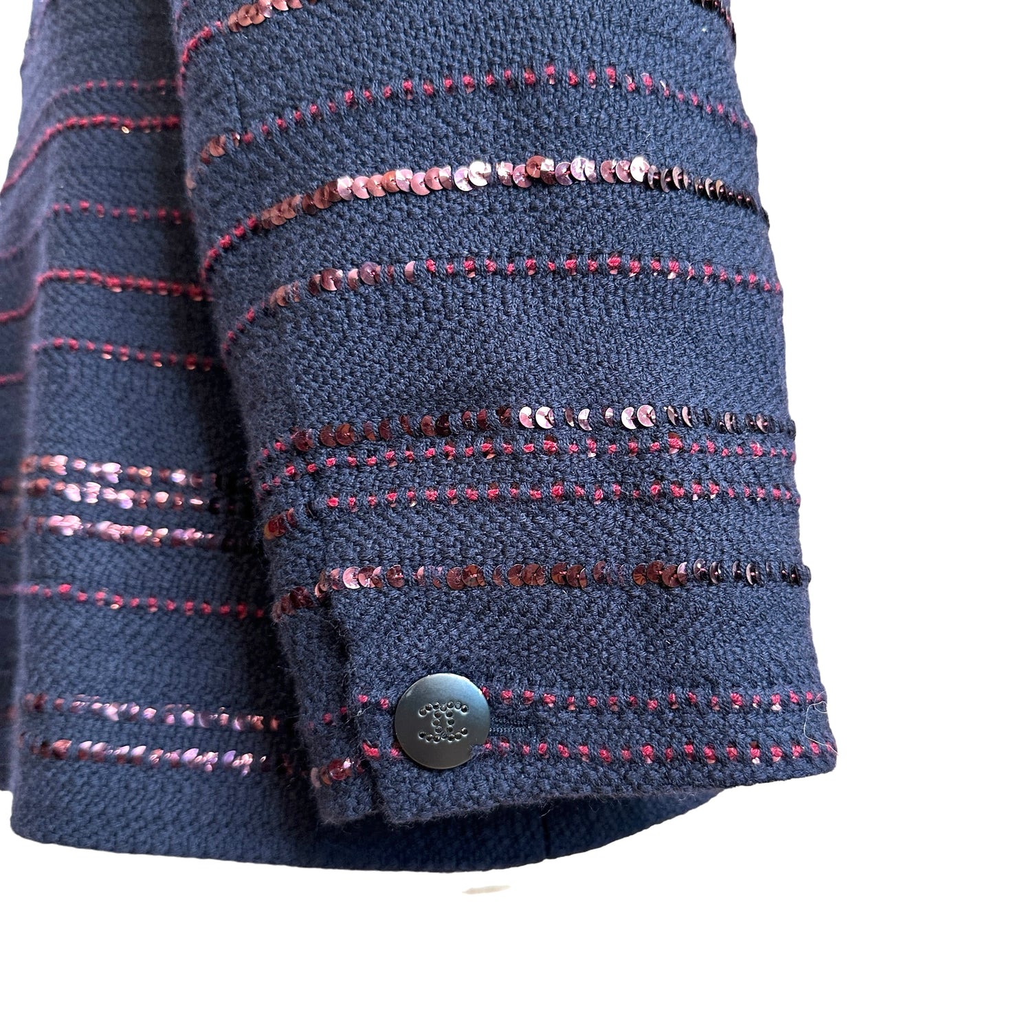 Chanel navy blazer with sequins threads. Fall 2000 collection by Karl Lagerfeld. Pointed collar. Gunmetal buttons with CC logo in mini crystals. Designer size 46.