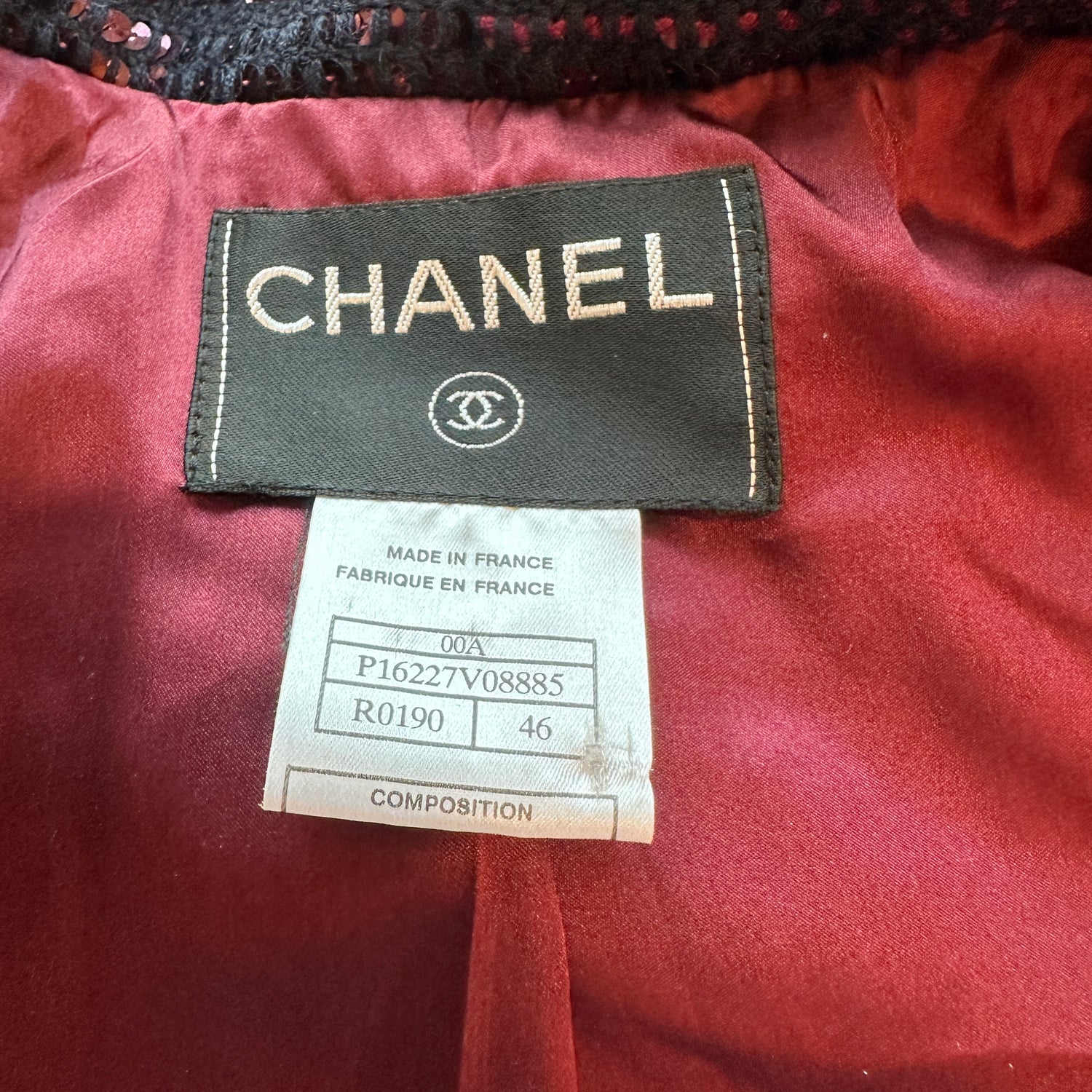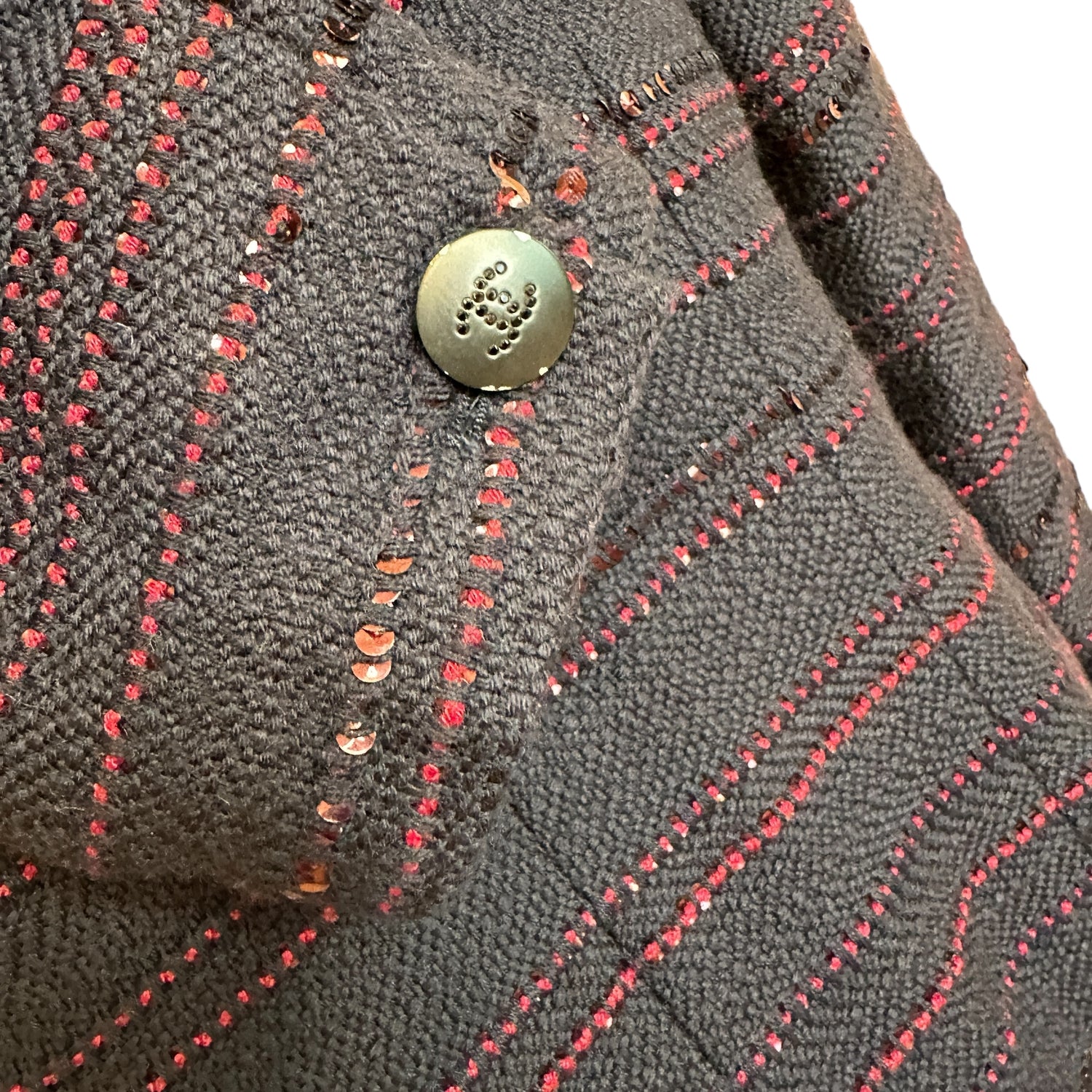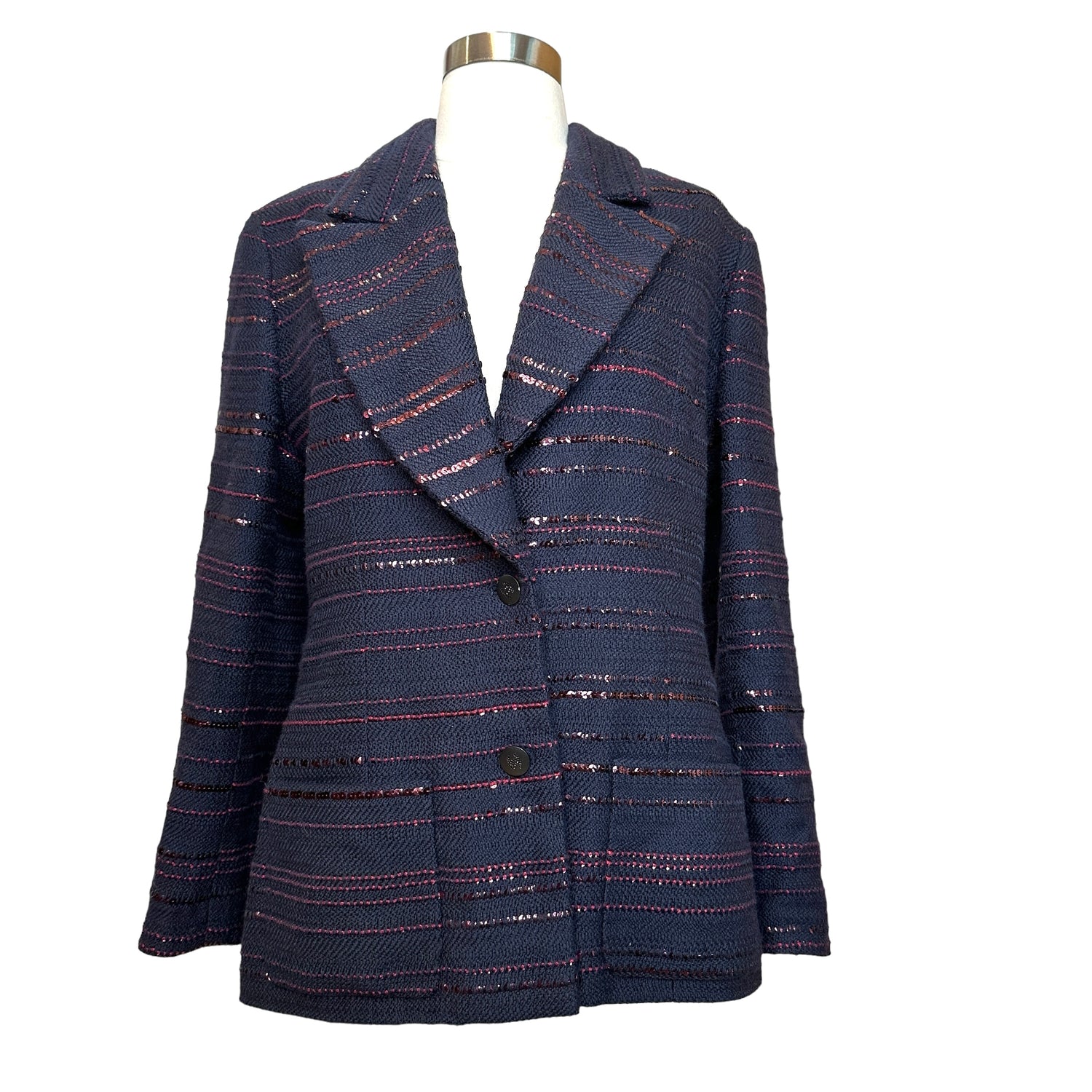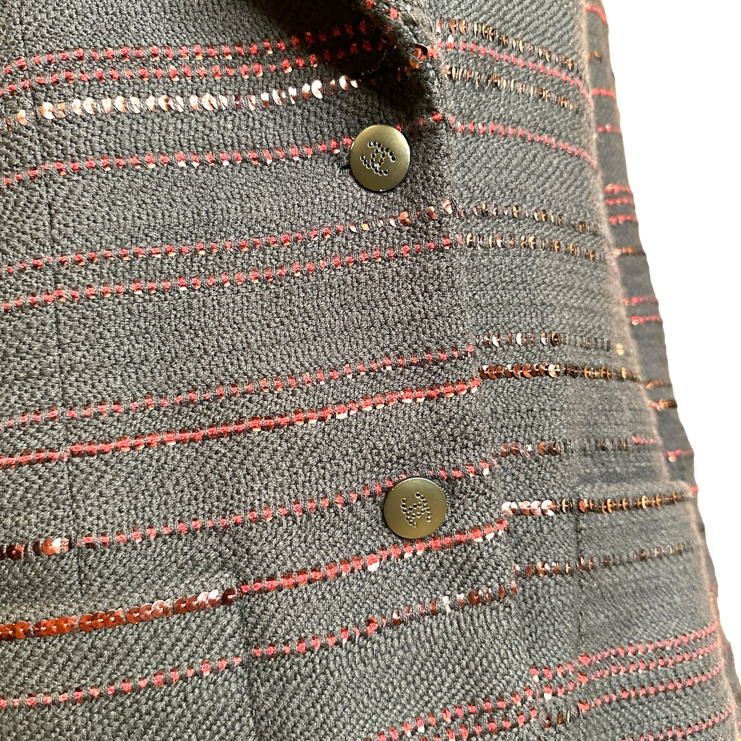 Chanel navy blazer with sequins threads. Fall 2000 collection by Karl Lagerfeld. Pointed collar. Gunmetal buttons with CC logo in mini crystals. Designer size 46.