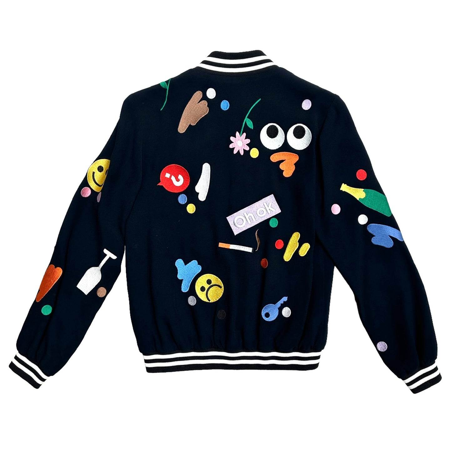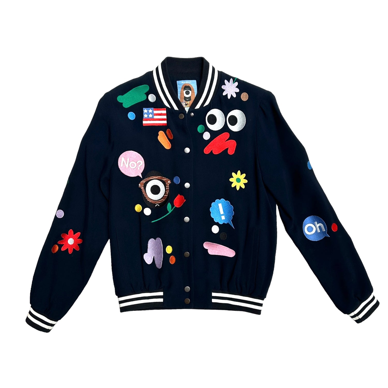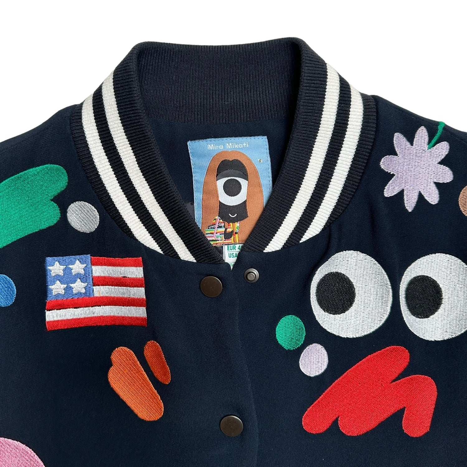 Mira Mikati navy bomber jacket with embroideries throughout. Button closure at front. Designer size 8.