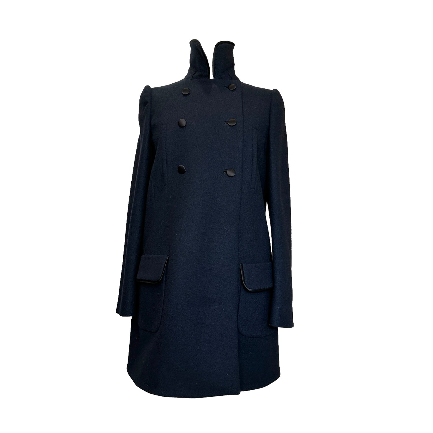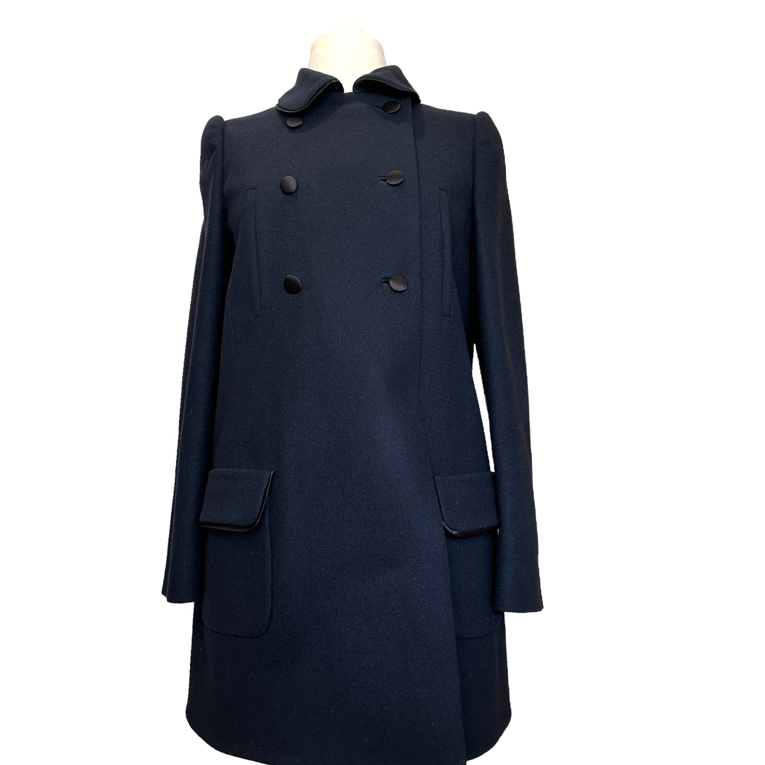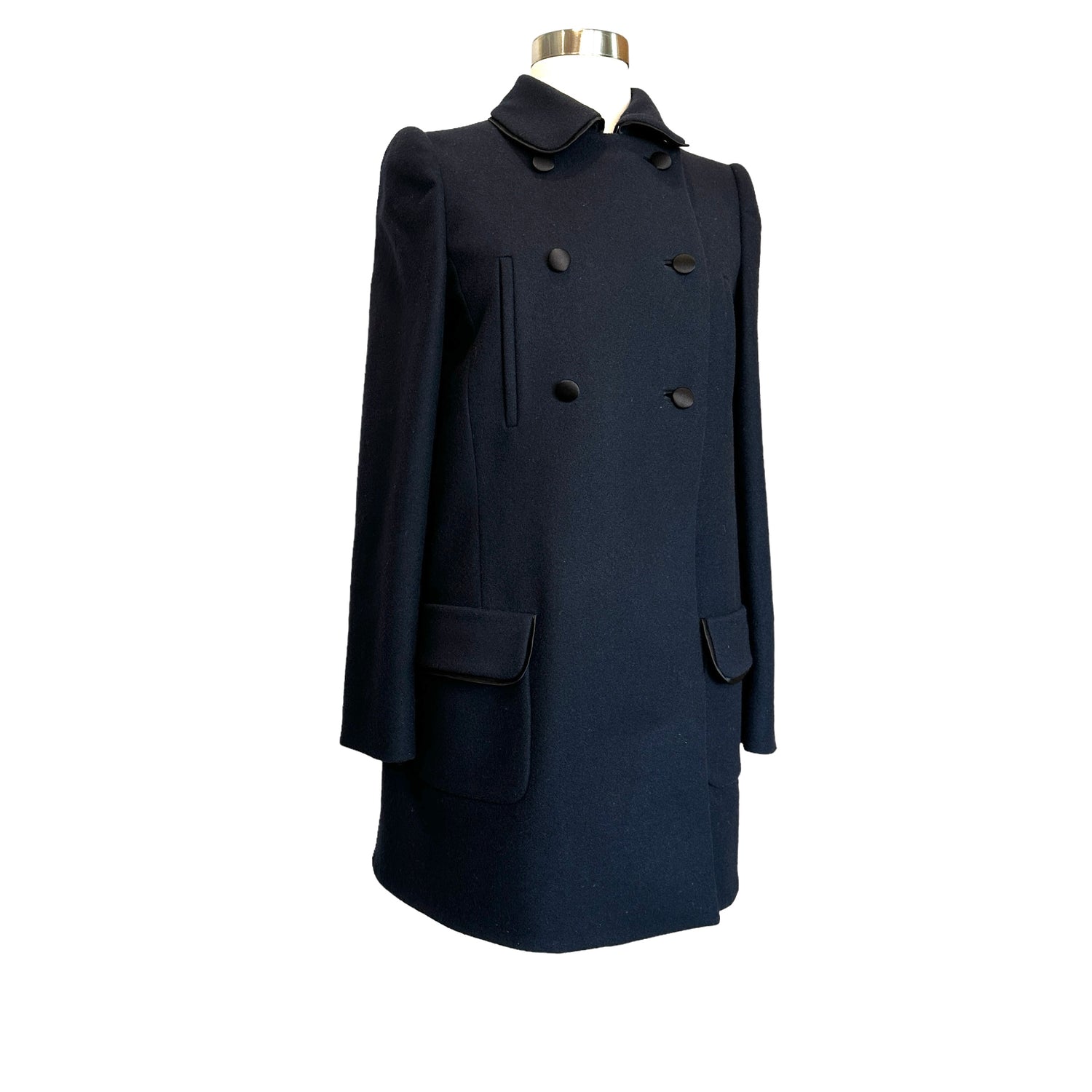 Miu Miu navy coat. Navy wool with black silk trims. Double breasted. Round collar. Two flap large pockets. One slit pocket. Designer size 38.