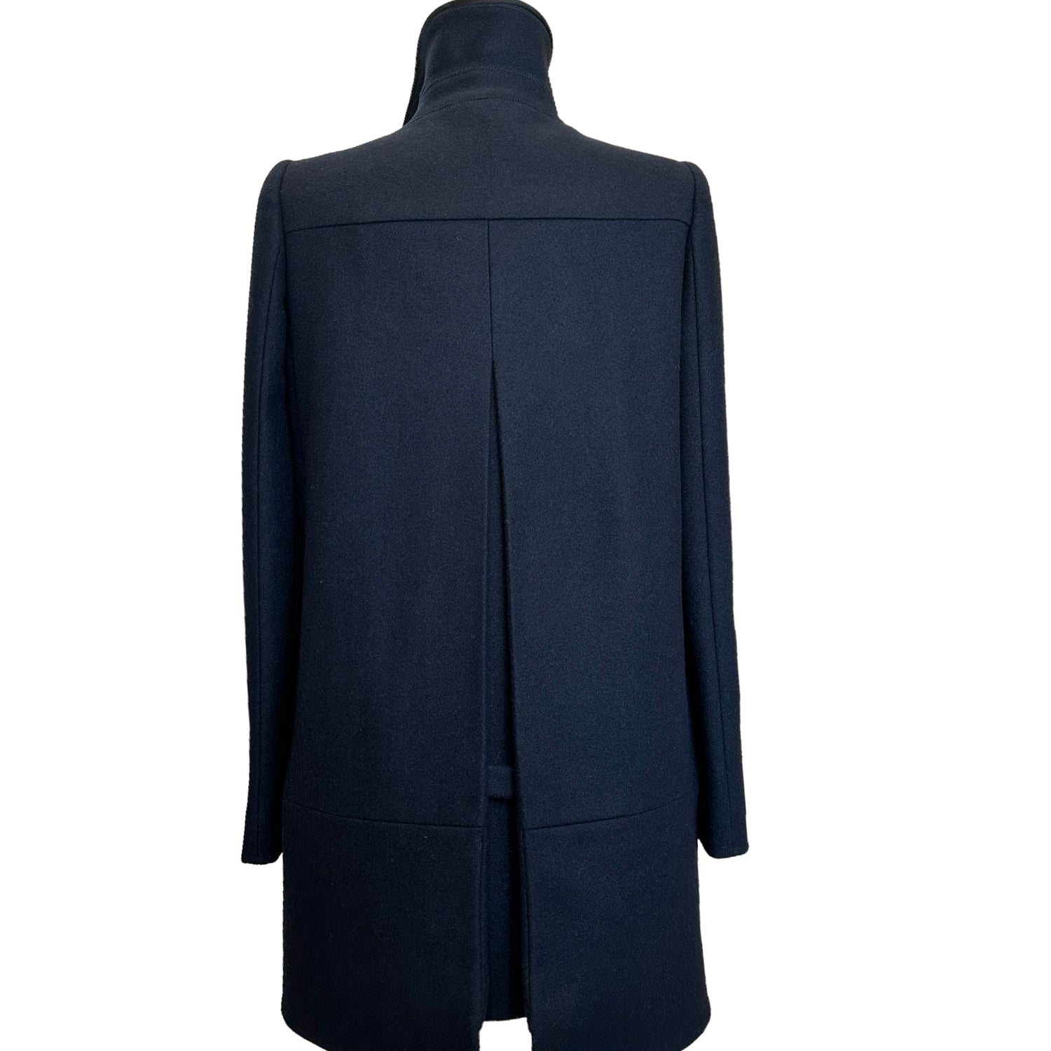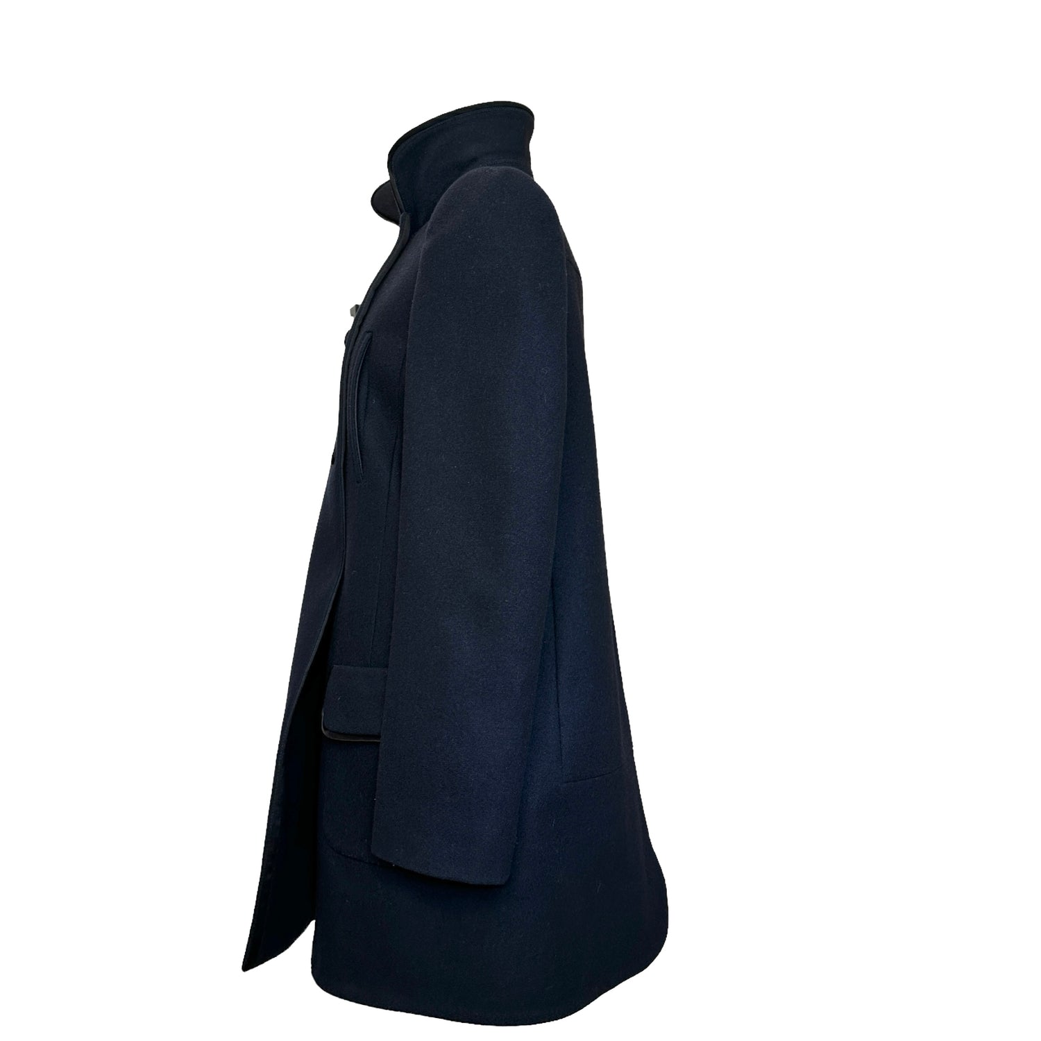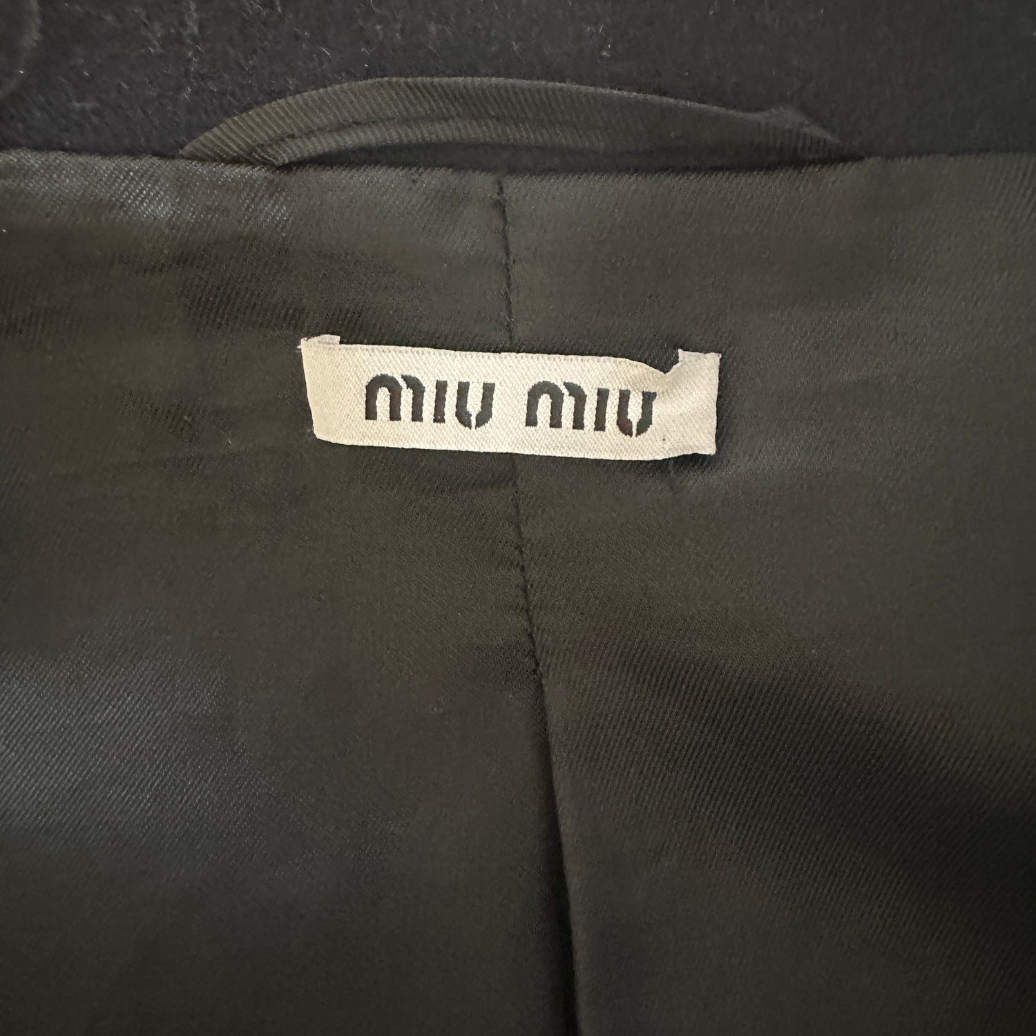 Miu Miu navy coat. Navy wool with black silk trims. Double breasted. Round collar. Two flap large pockets. One slit pocket. Designer size 38.