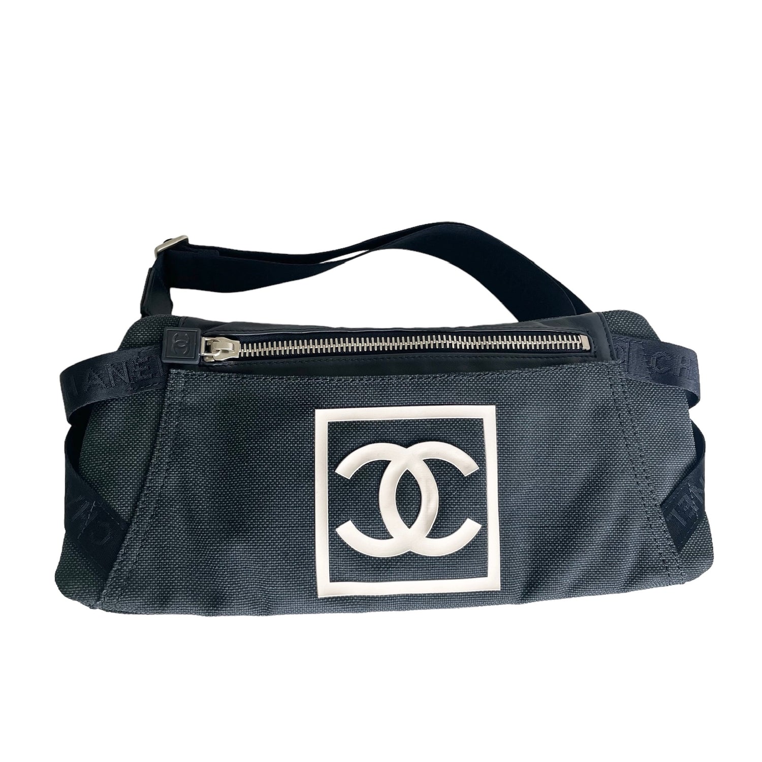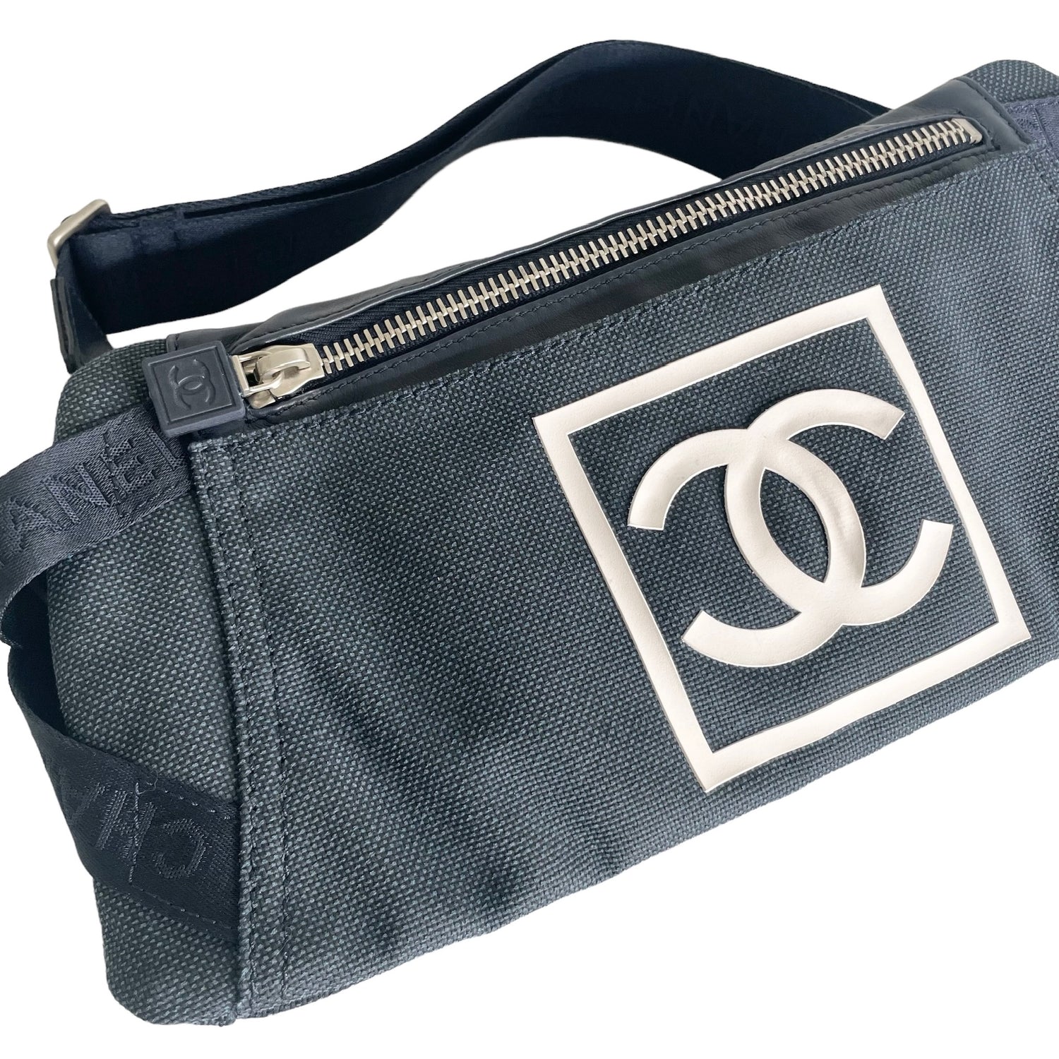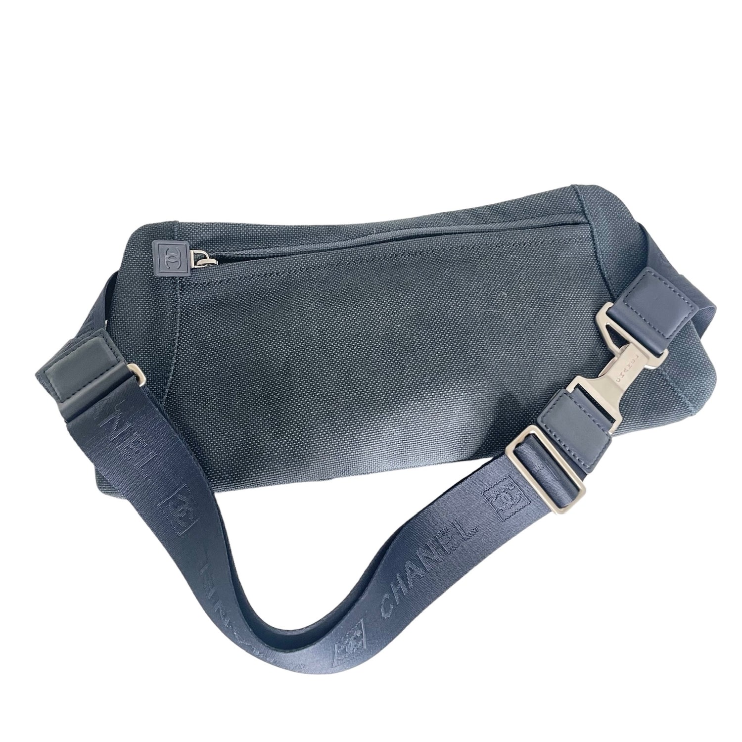 Chanel navy canvas belt bag. Identification logo in white at front. Multiple zipper. One slit pocket at back. Silver-tone hardware. Great piece of travelling. Folds flat and easy to store.