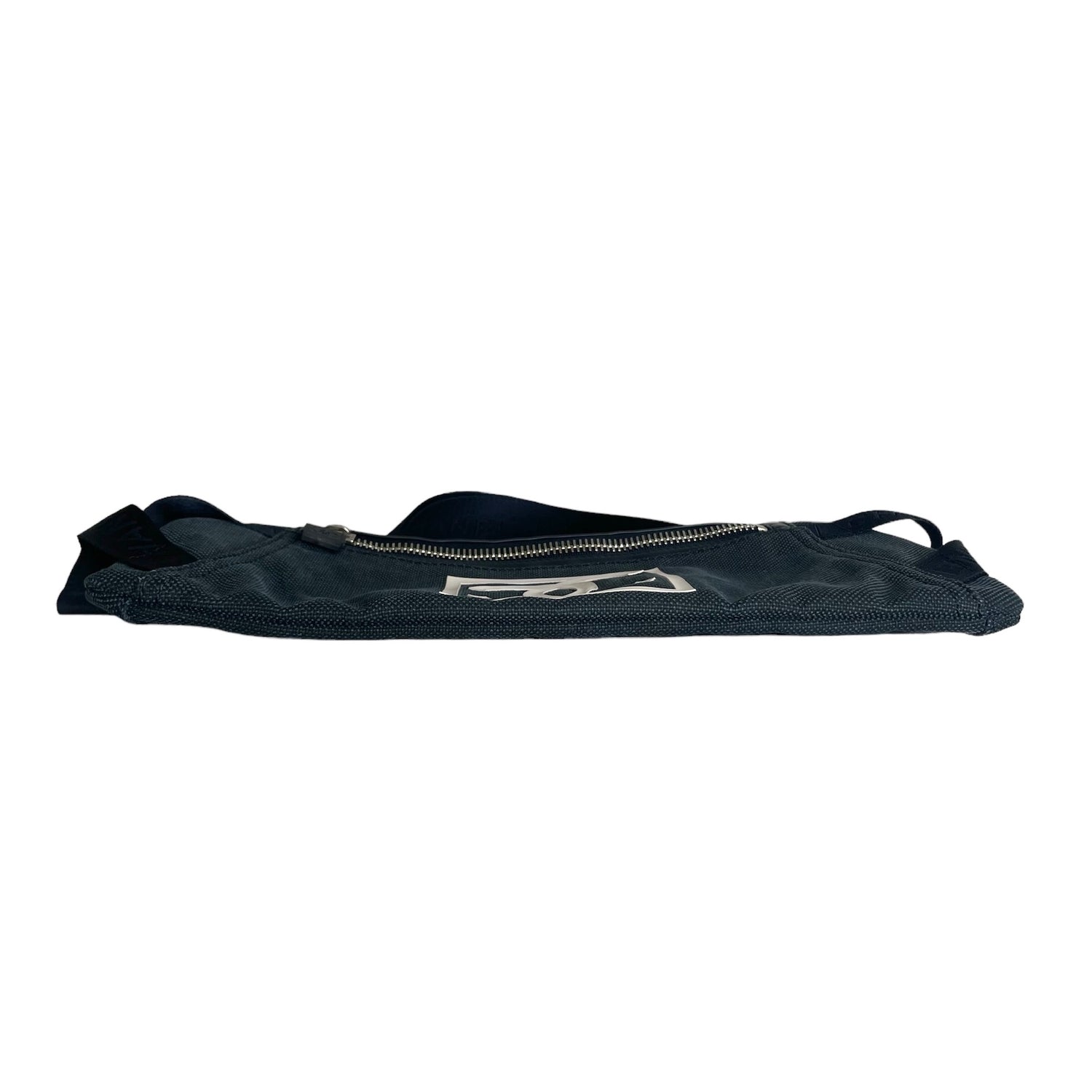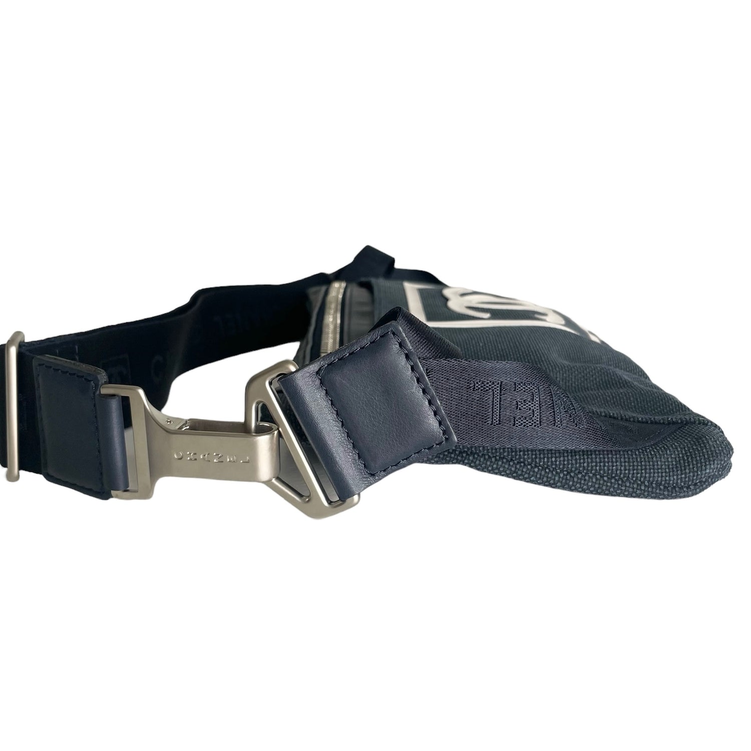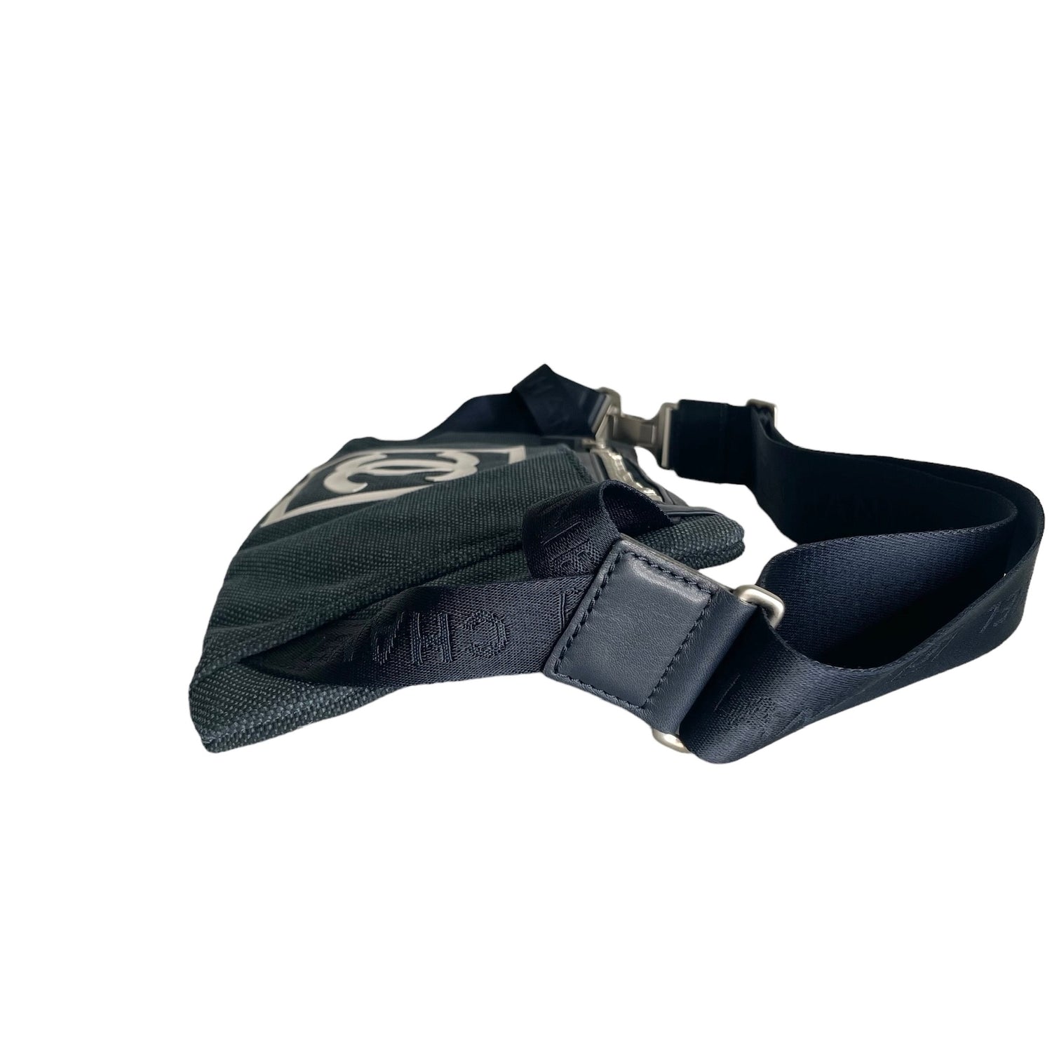 Chanel navy canvas belt bag. Identification logo in white at front. Multiple zipper. One slit pocket at back. Silver-tone hardware. Great piece of travelling. Folds flat and easy to store.