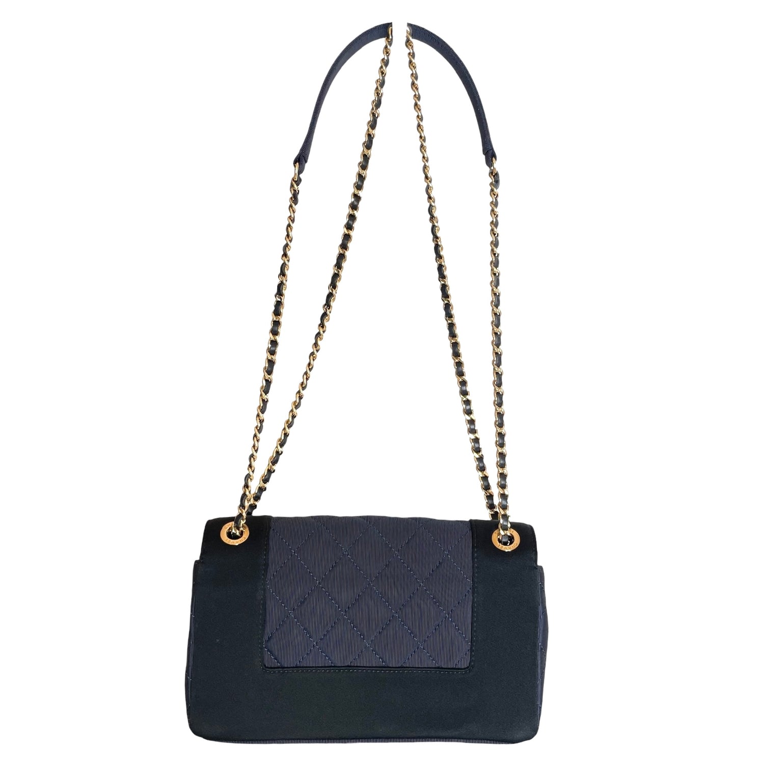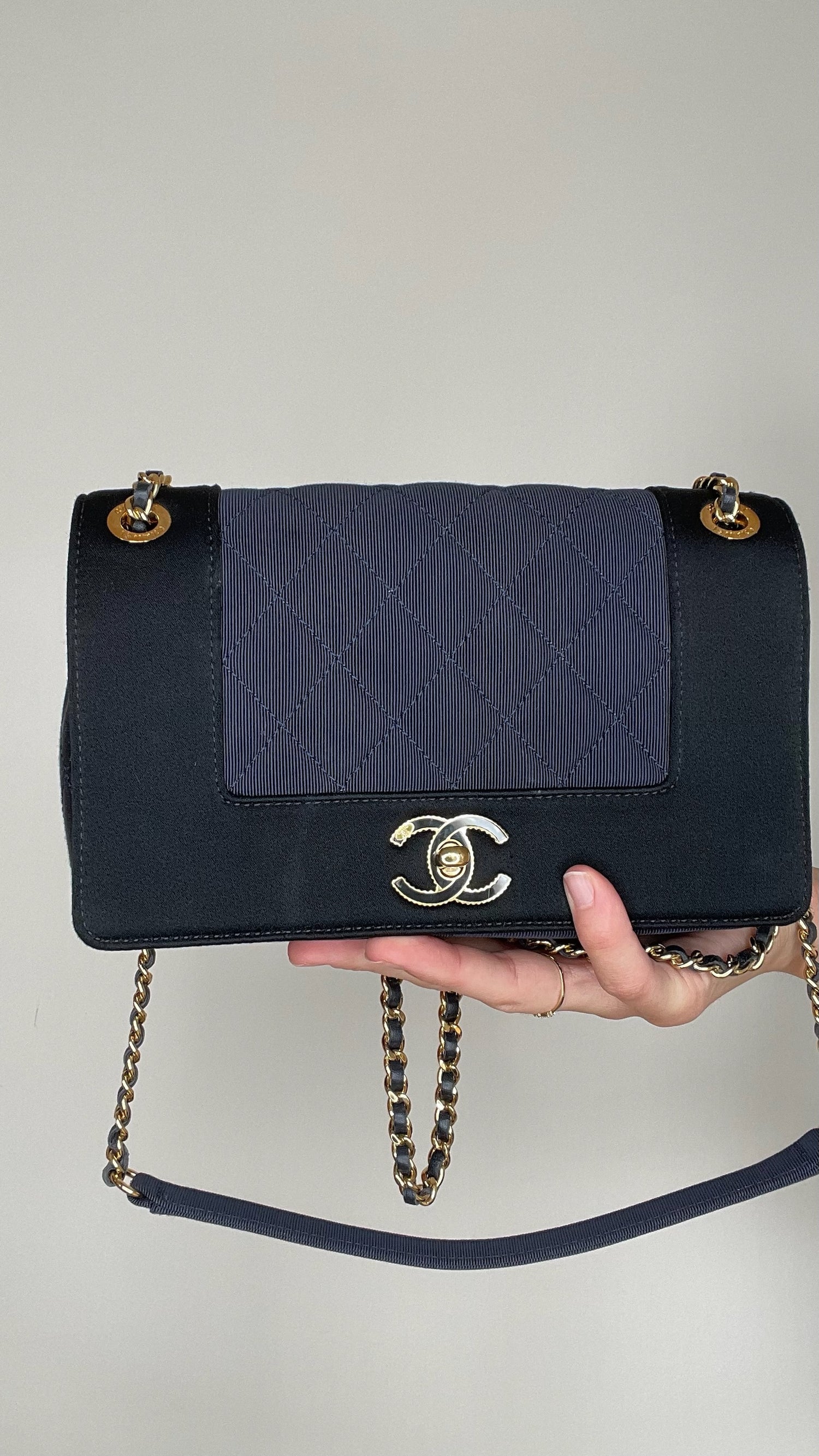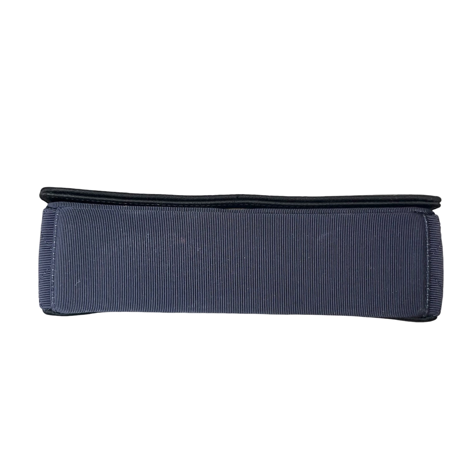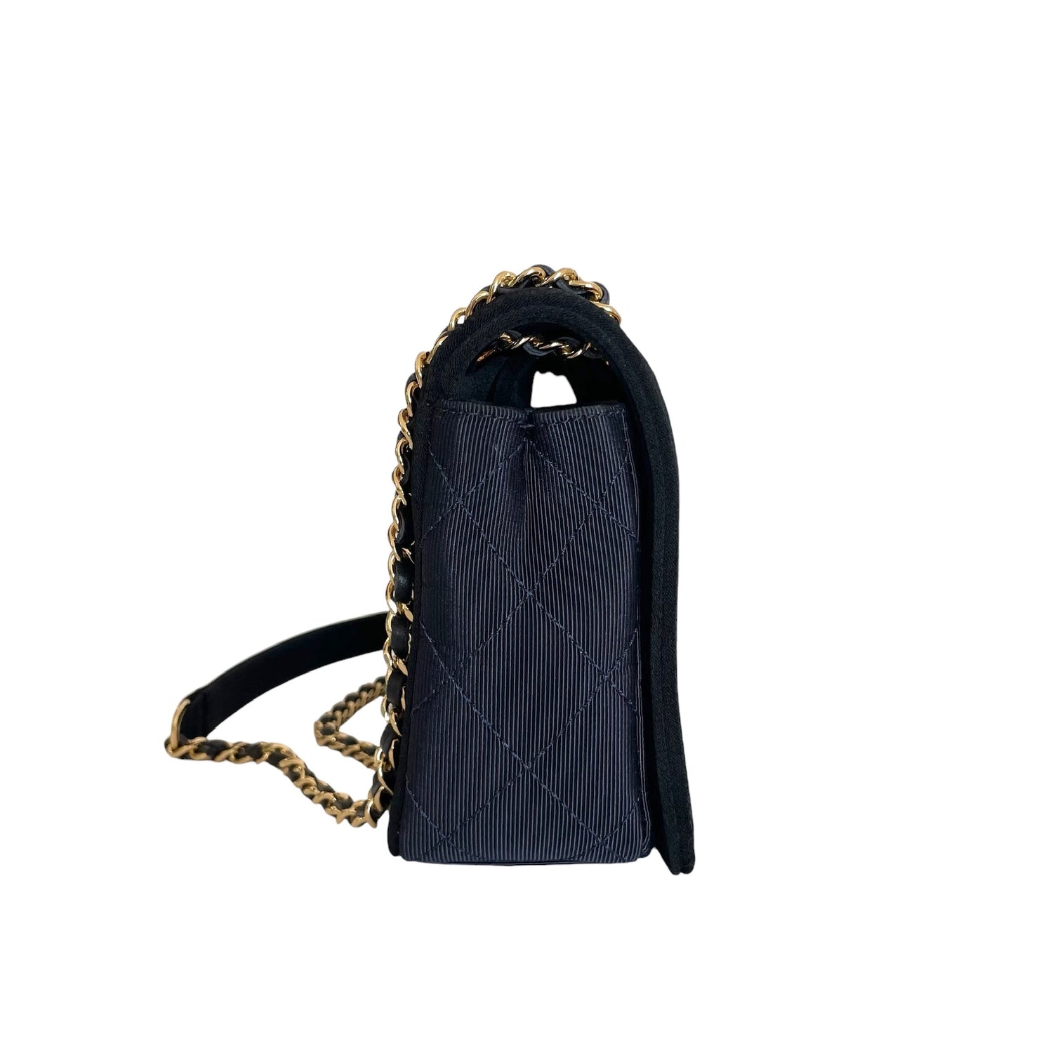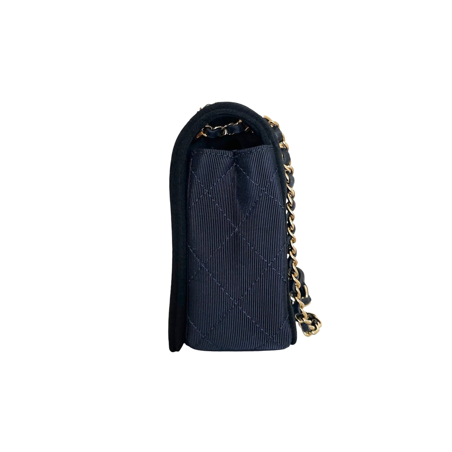 Chanel navy and grosgrain flap bag. Gold-tone hardware. Double crossbody chain with leather pad. Burgundy grosgrain lining.