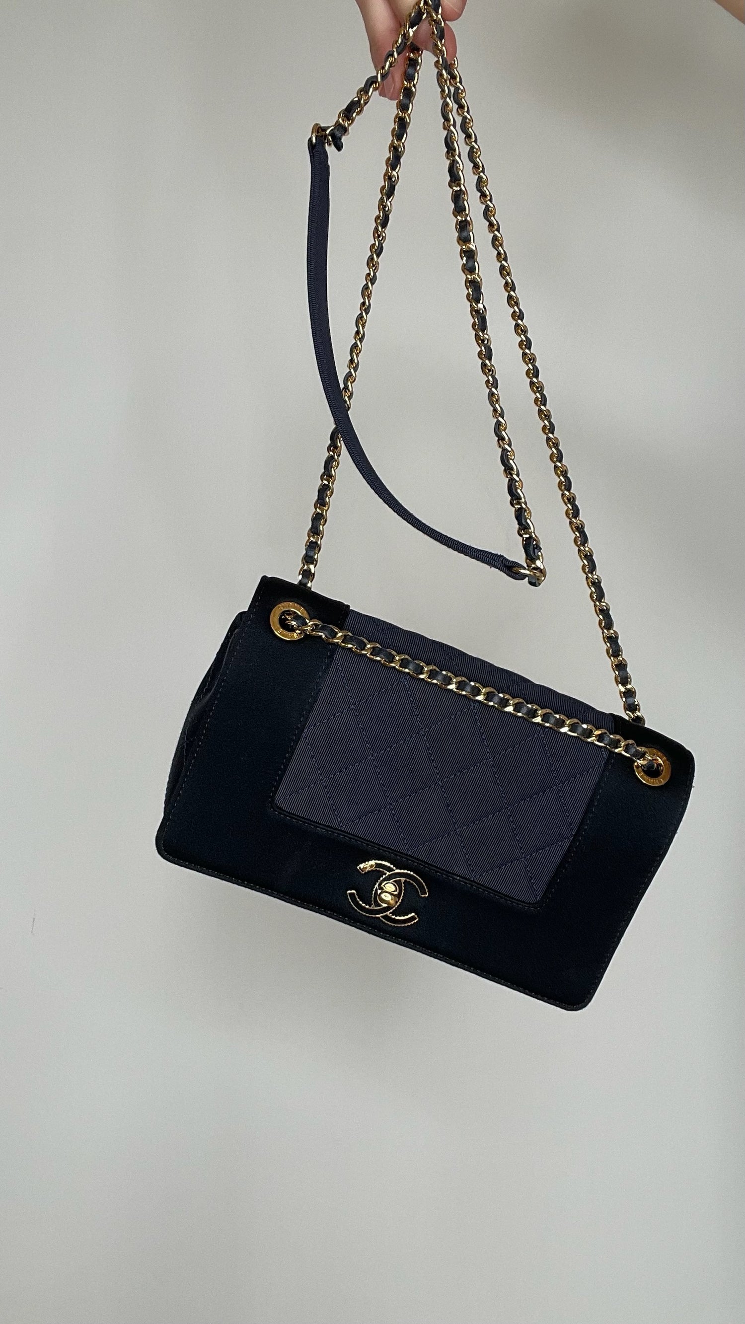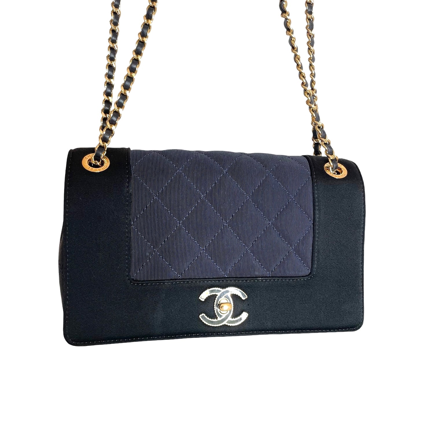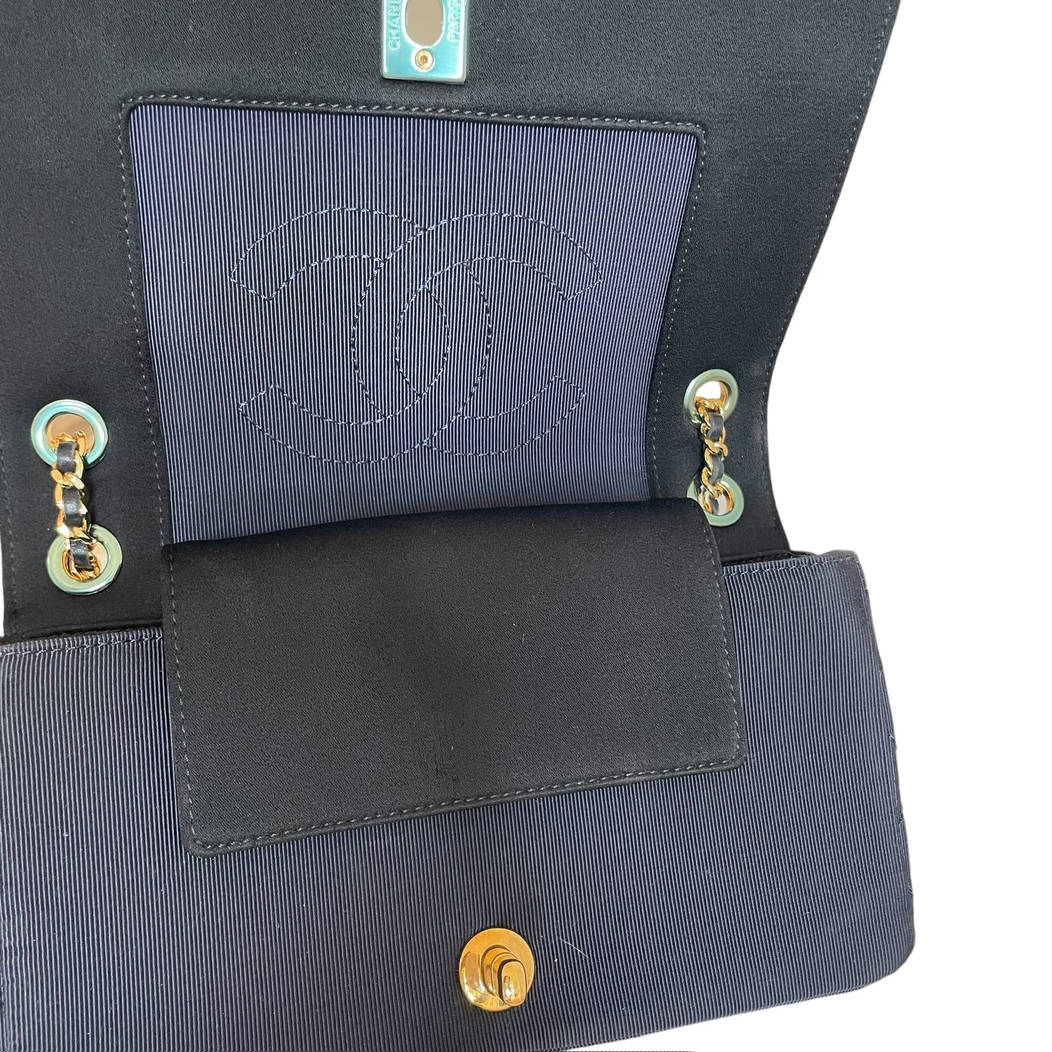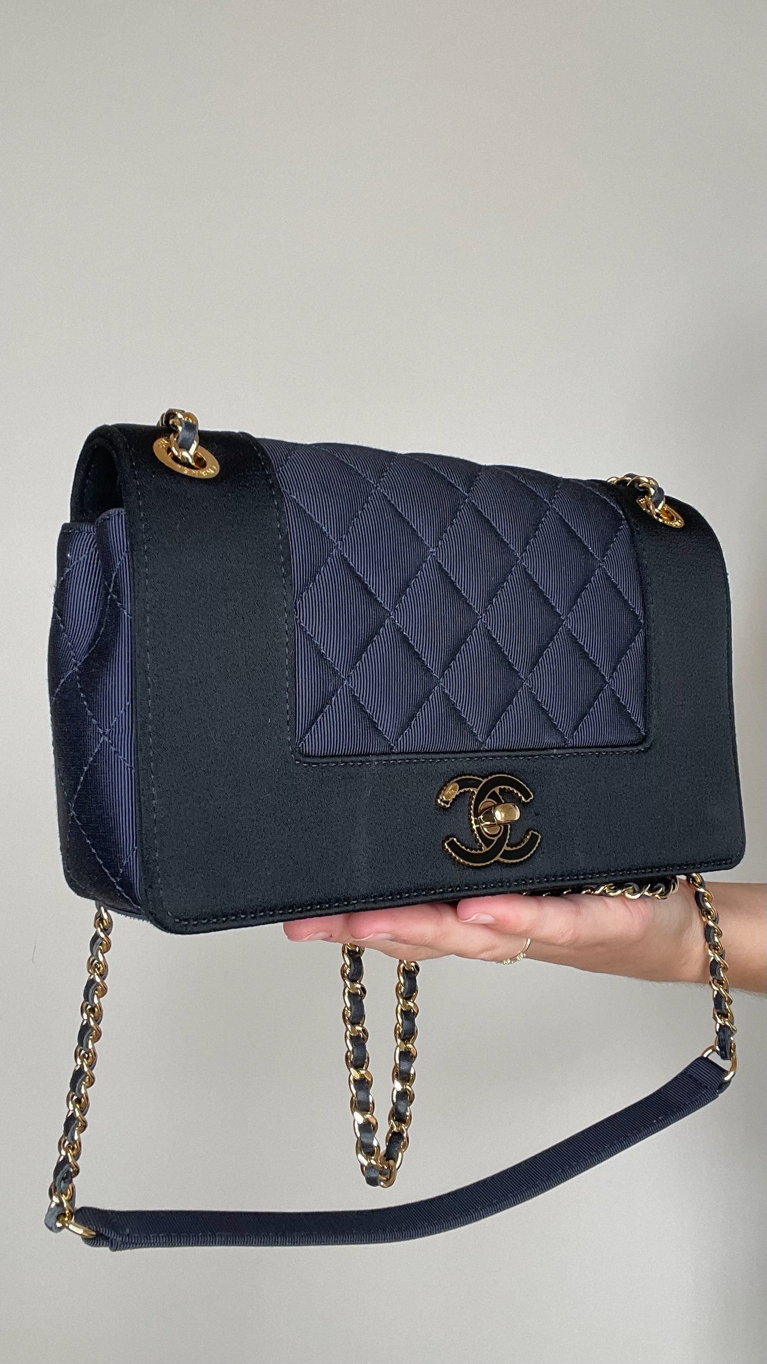 Chanel navy and grosgrain flap bag. Gold-tone hardware. Double crossbody chain with leather pad. Burgundy grosgrain lining.