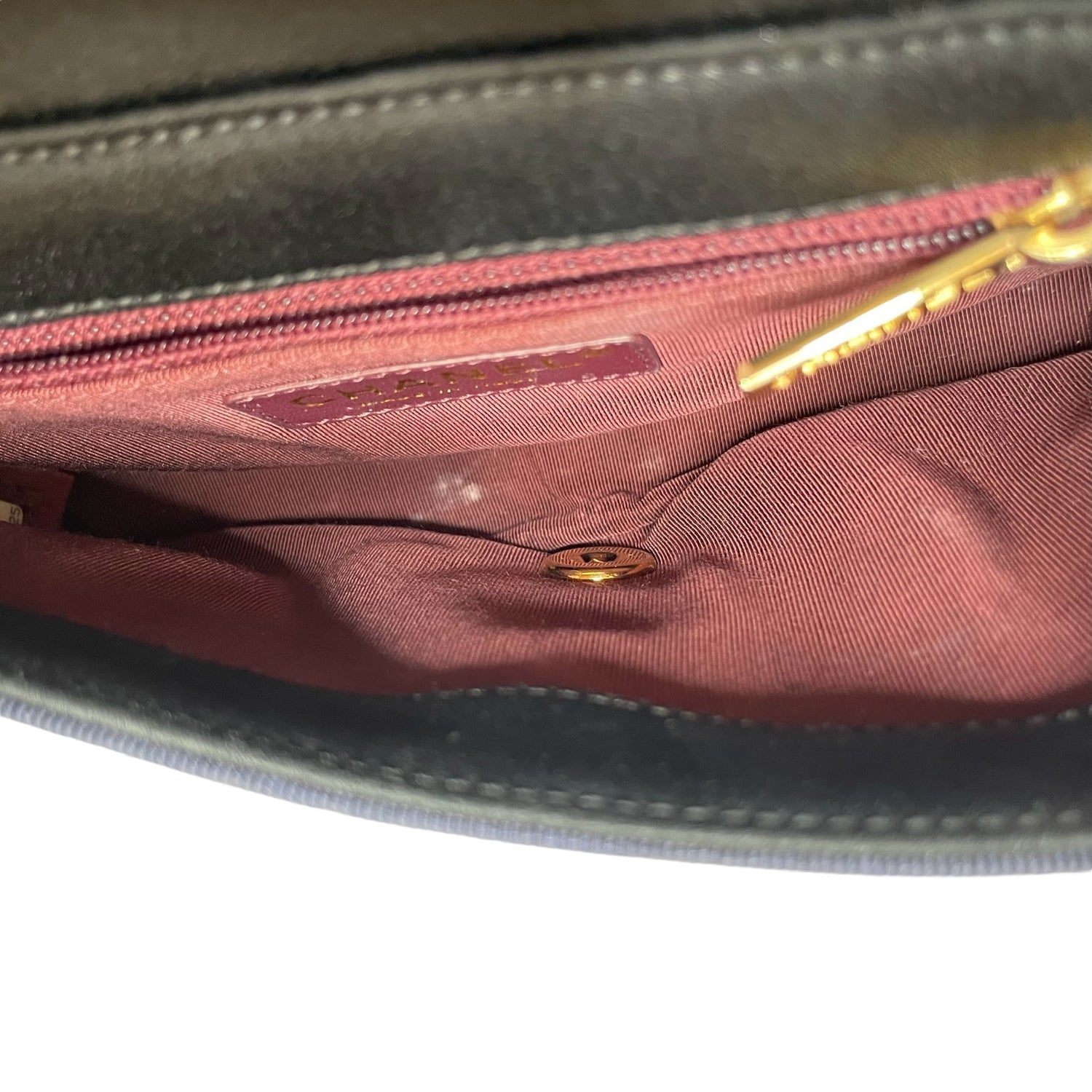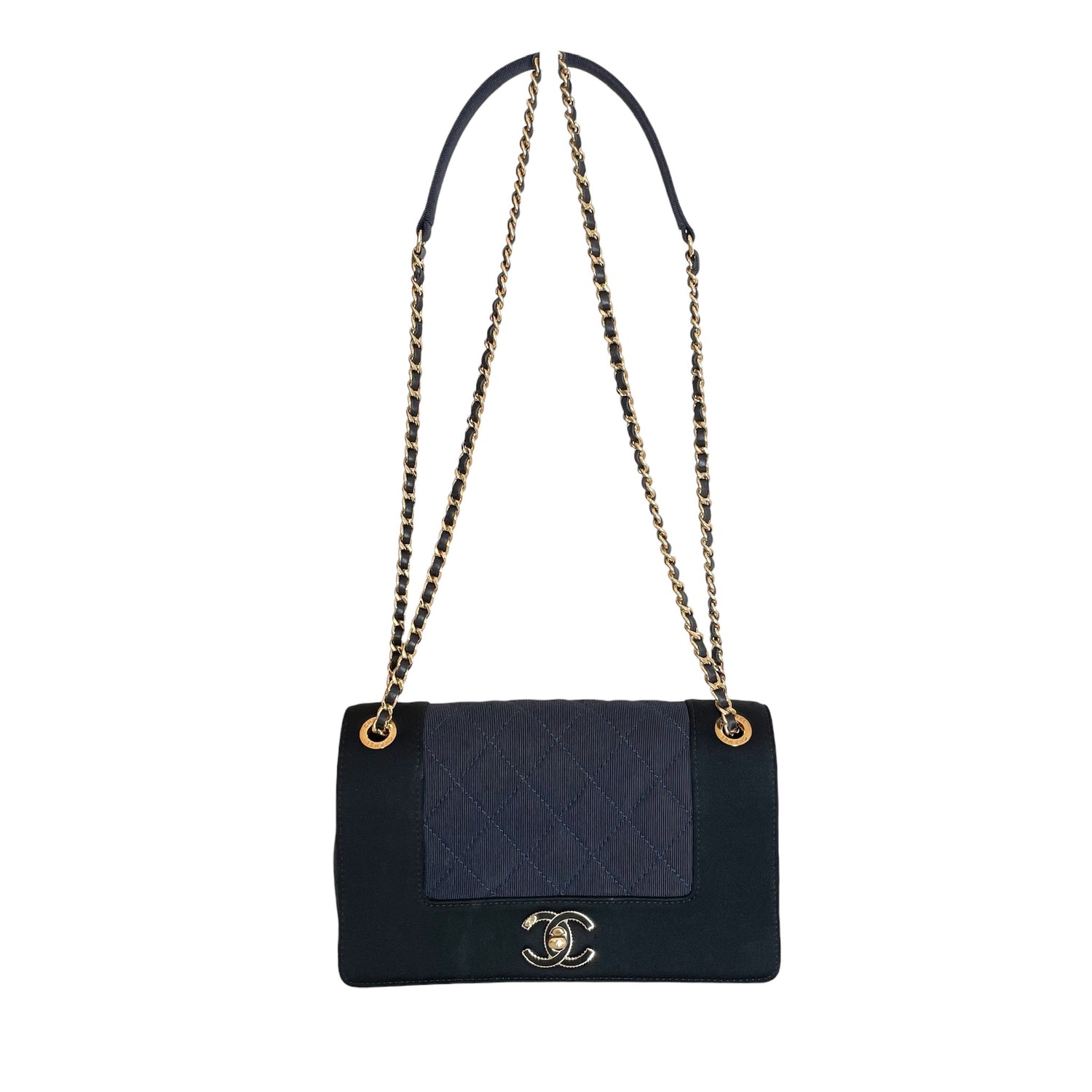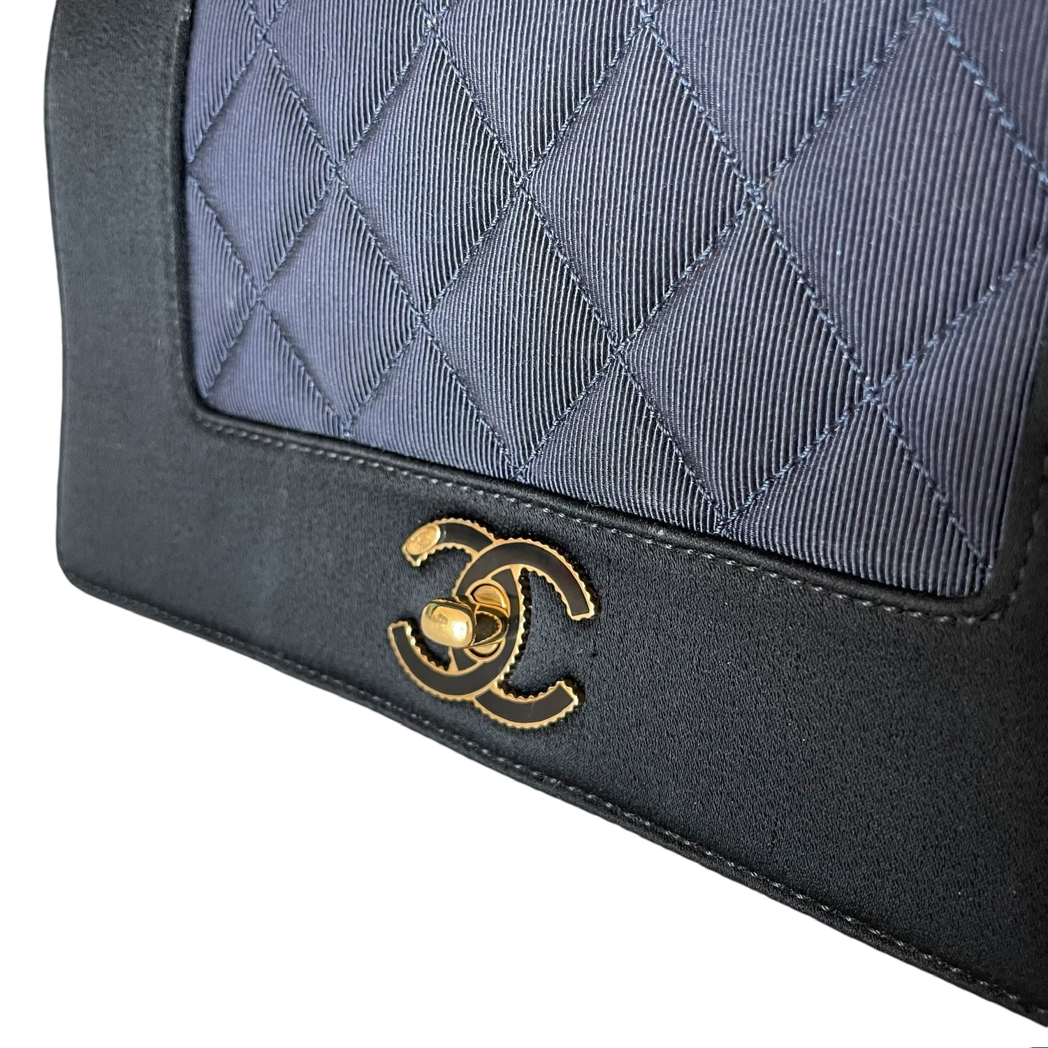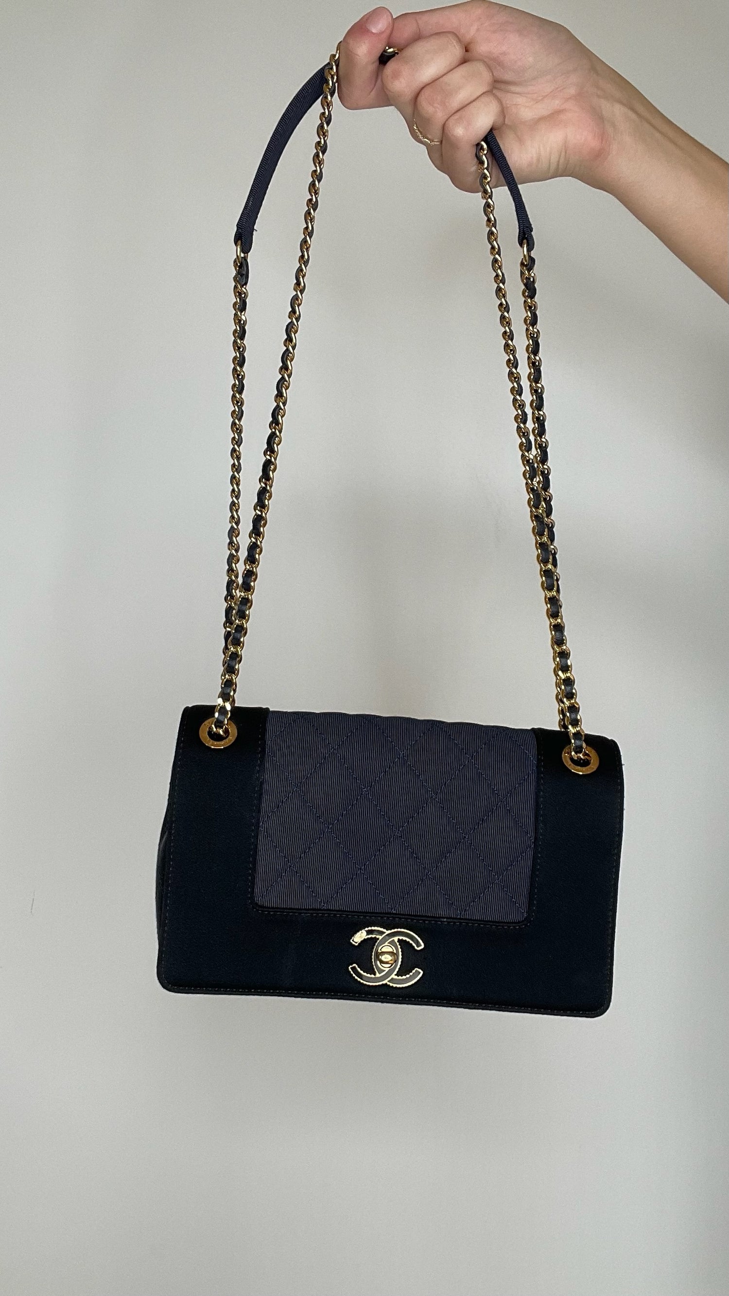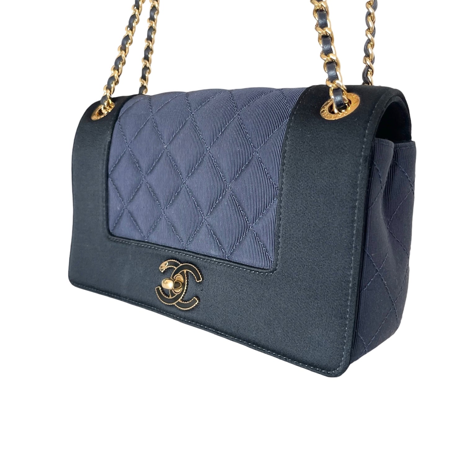 Chanel navy and grosgrain flap bag. Gold-tone hardware. Double crossbody chain with leather pad. Burgundy grosgrain lining.