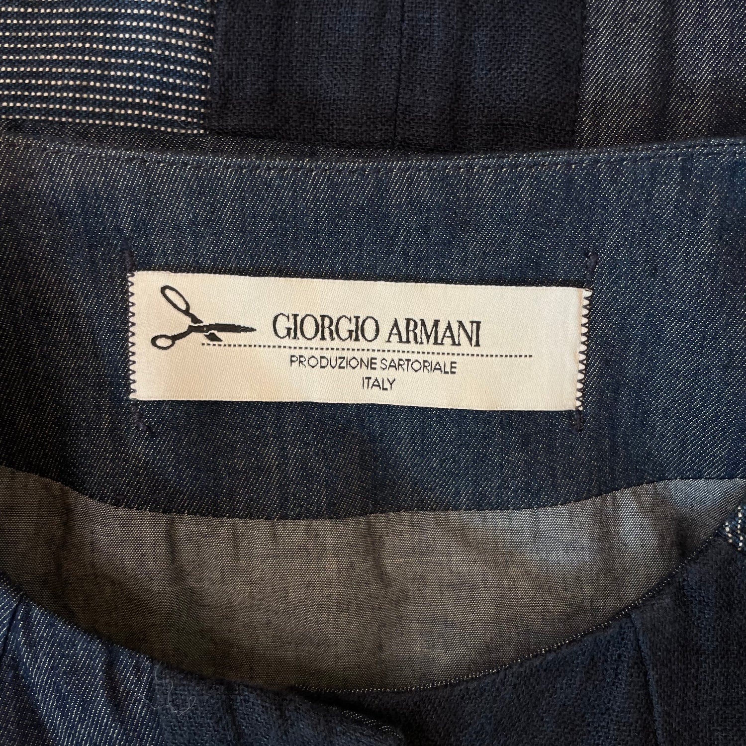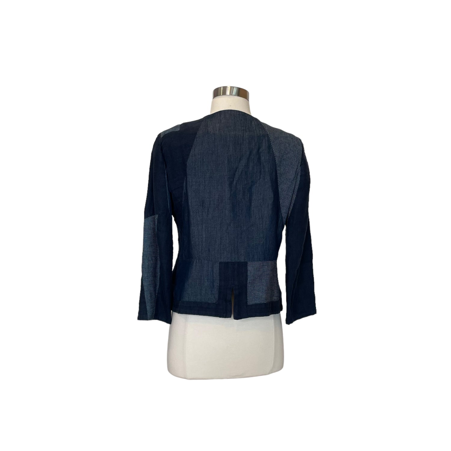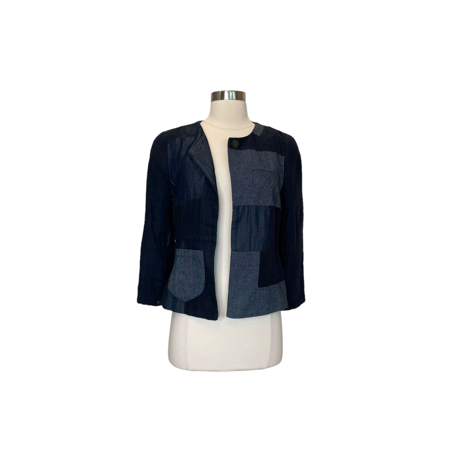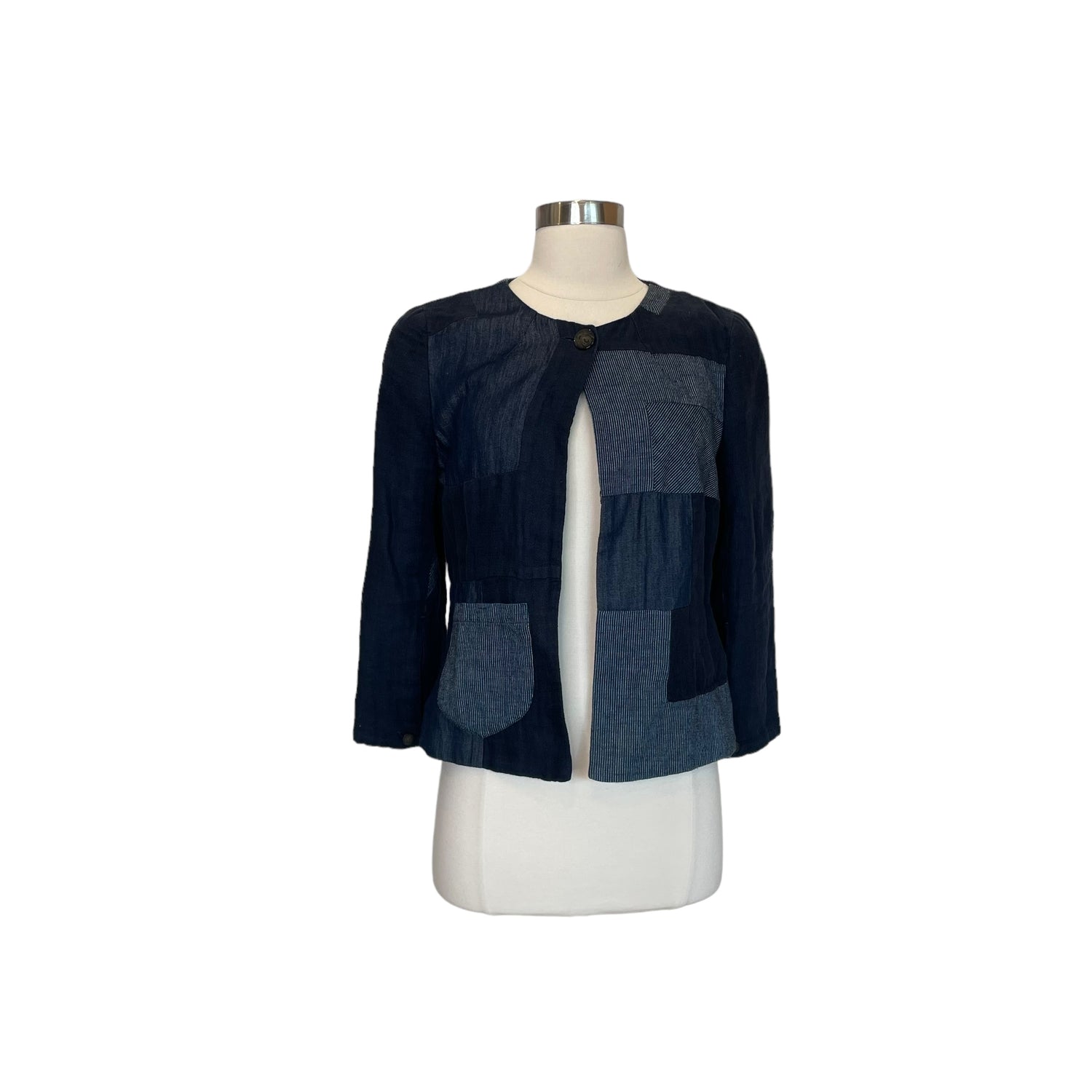 Giorgio Armani navy patchwork jacket. One top button closure at the front. Front right pocket. Designer size 40.