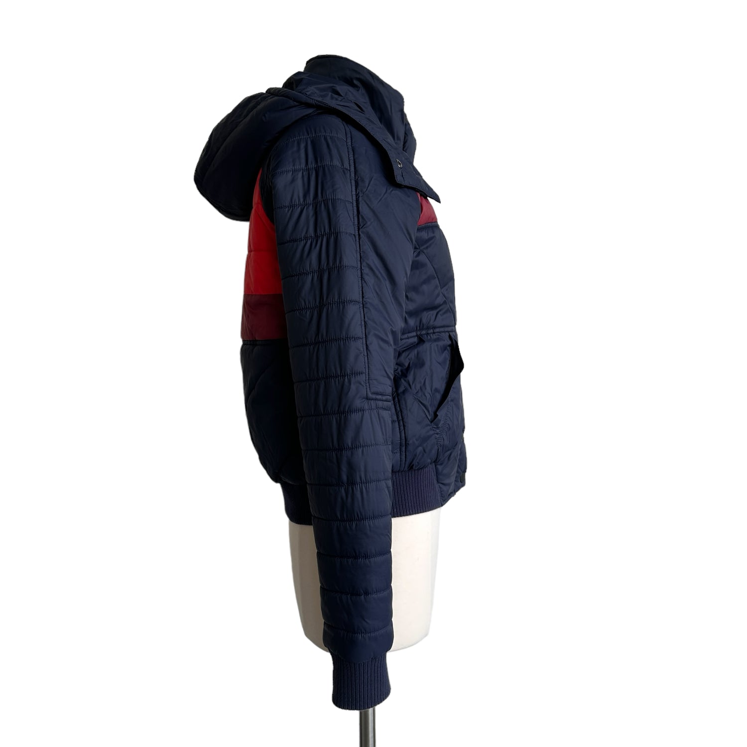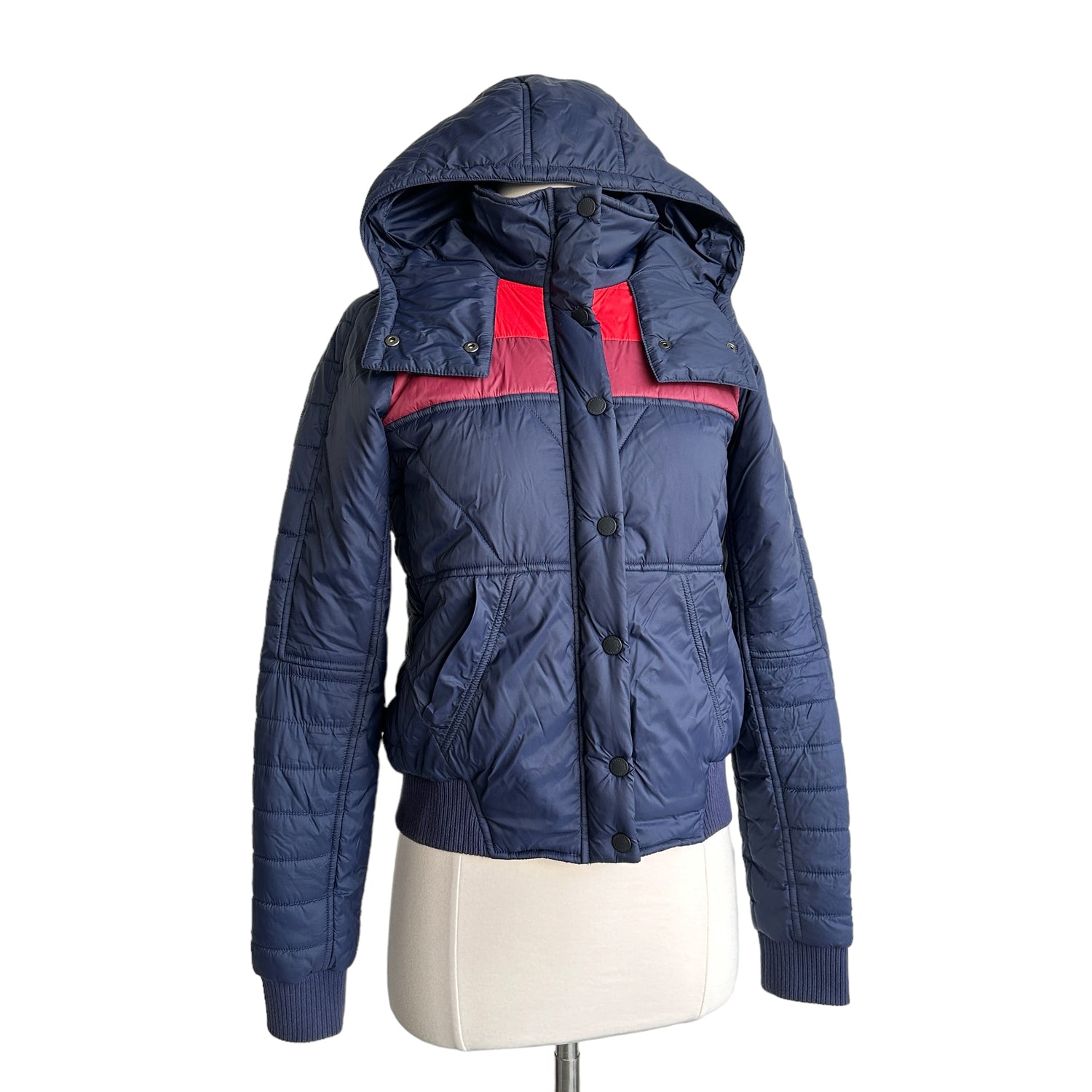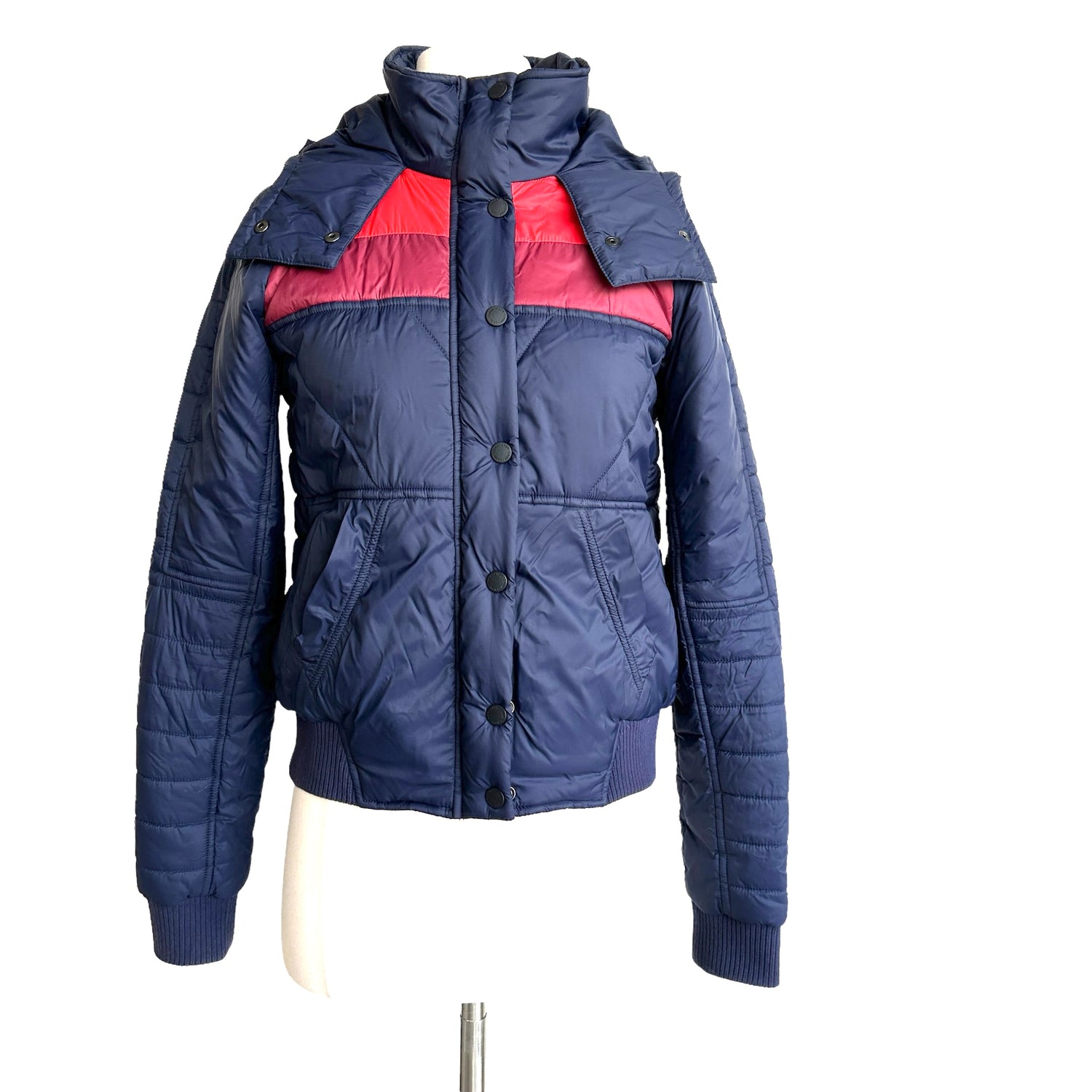 LNDR navy puffer jacket with red stripes. Removable hoodie. Two pockets. Zipper and snap button closure. Designer size small.