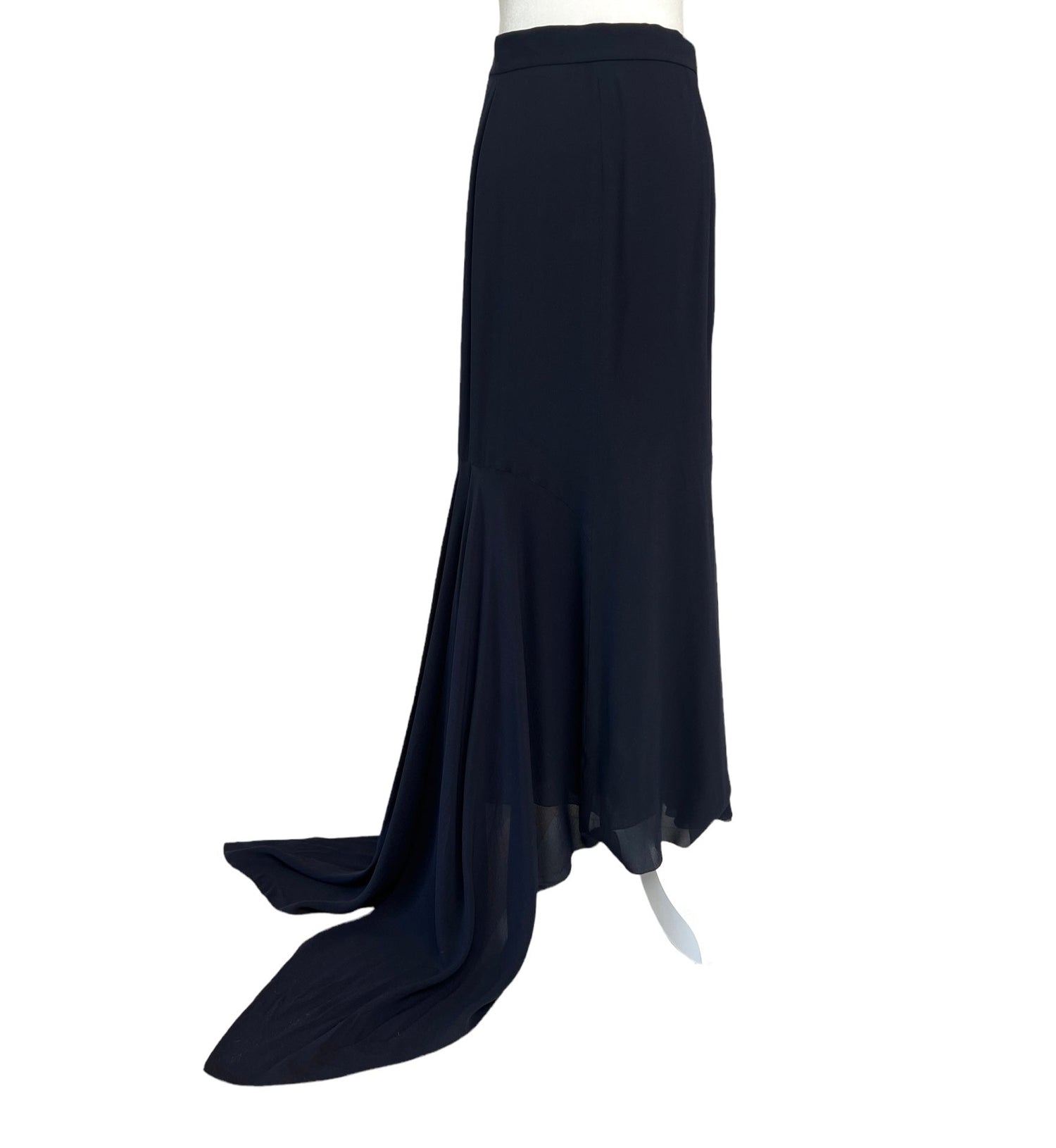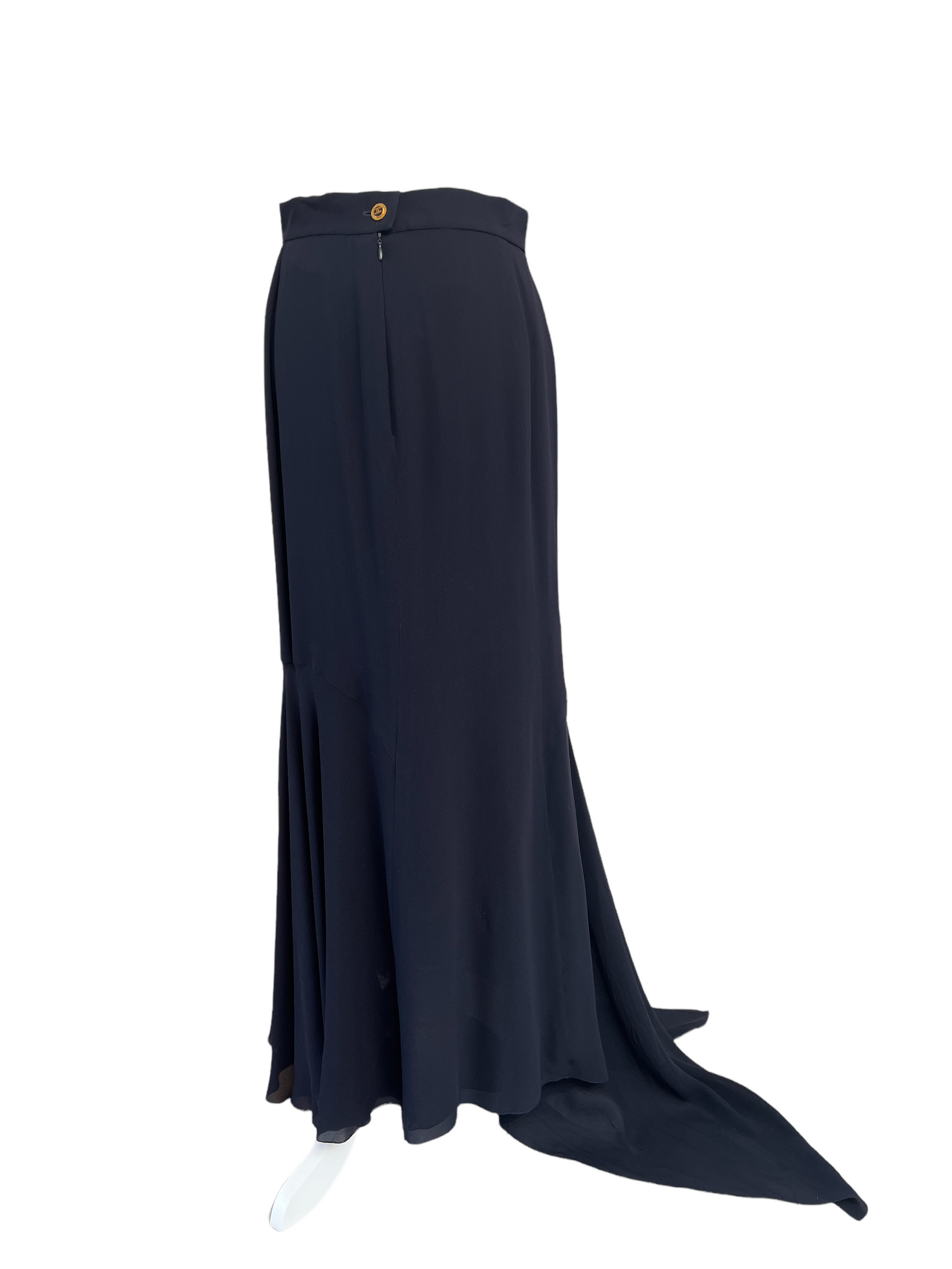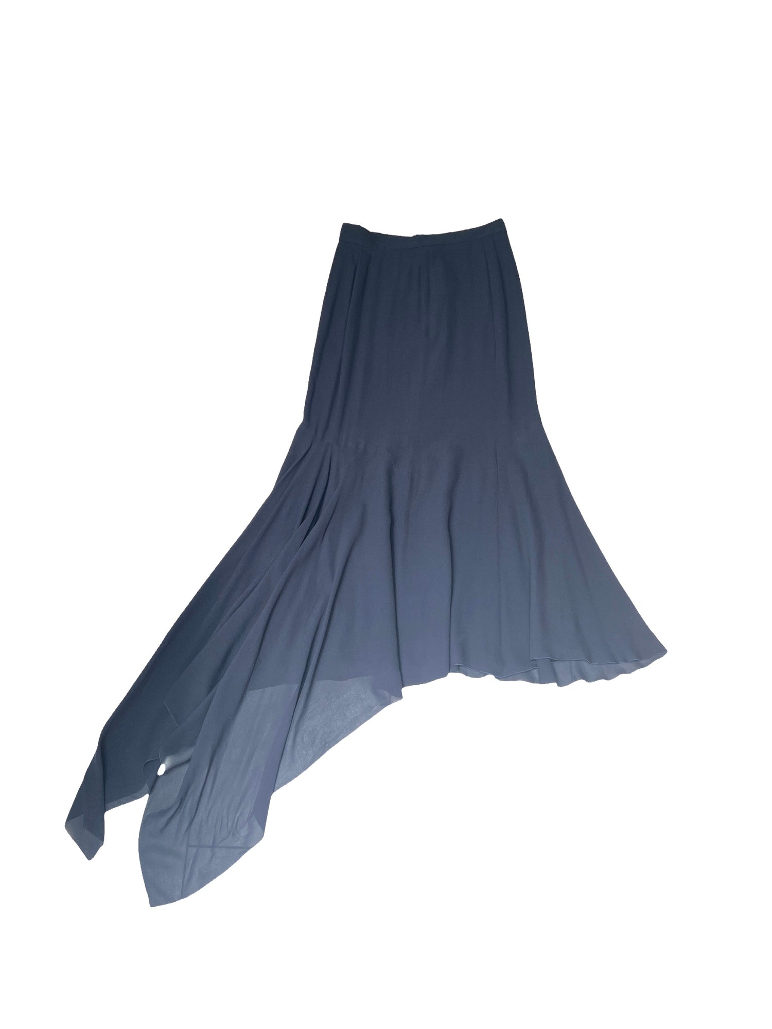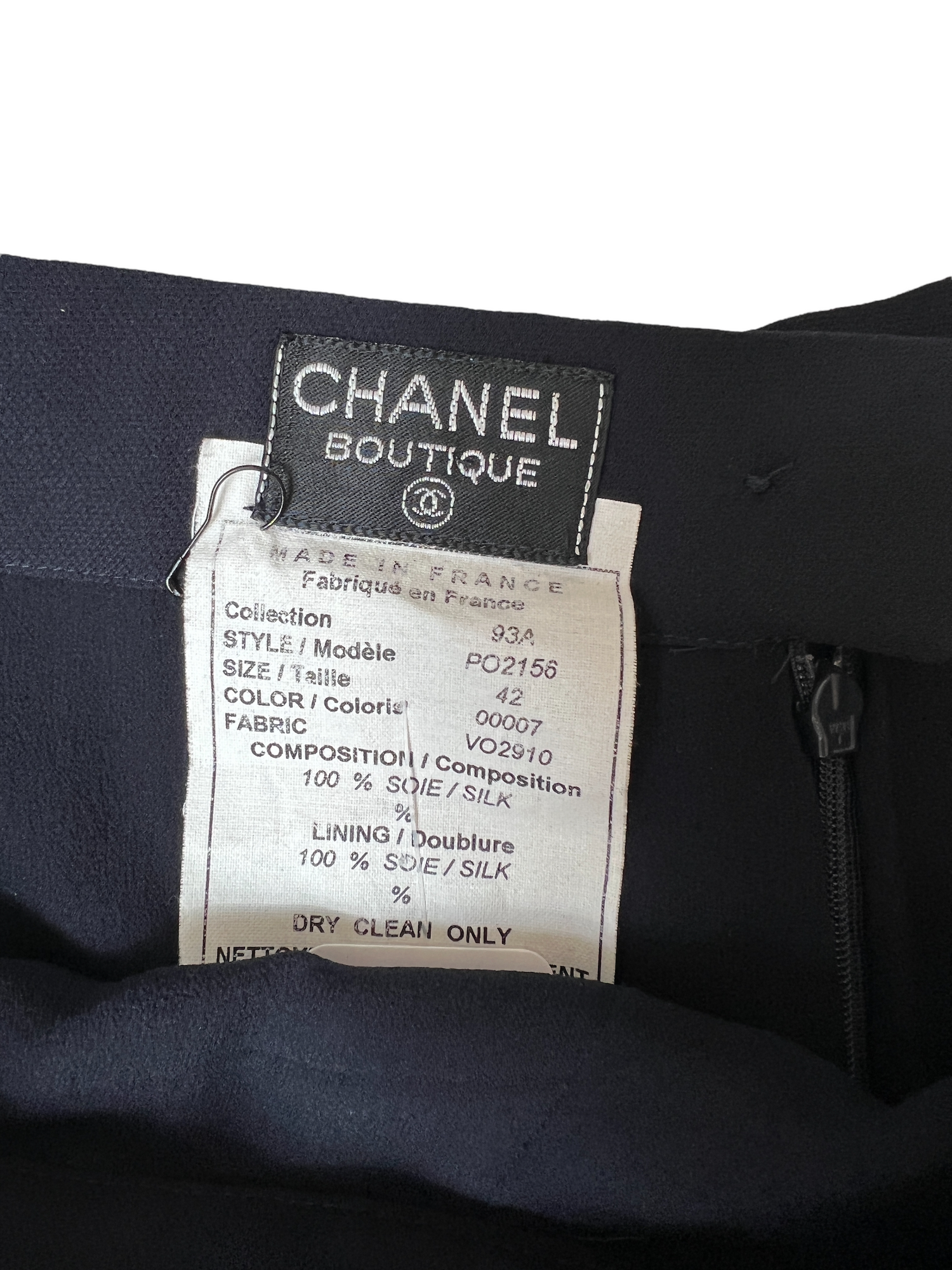 Chanel navy silk skirt. Long and asymmetrical. CC Logo gold tone button at back. Concealed zipper. High waisted. Very soft and flawy. Size FR 42.