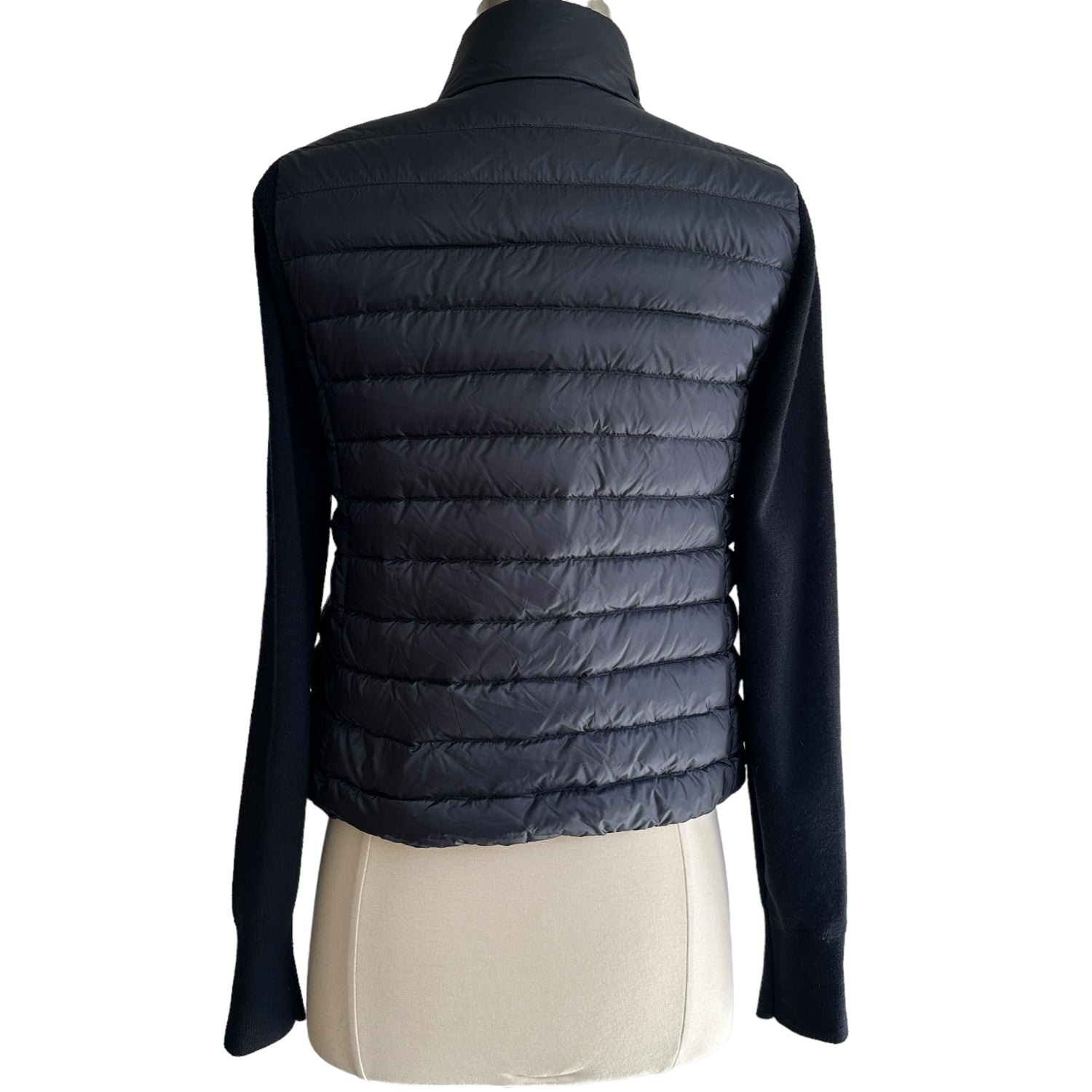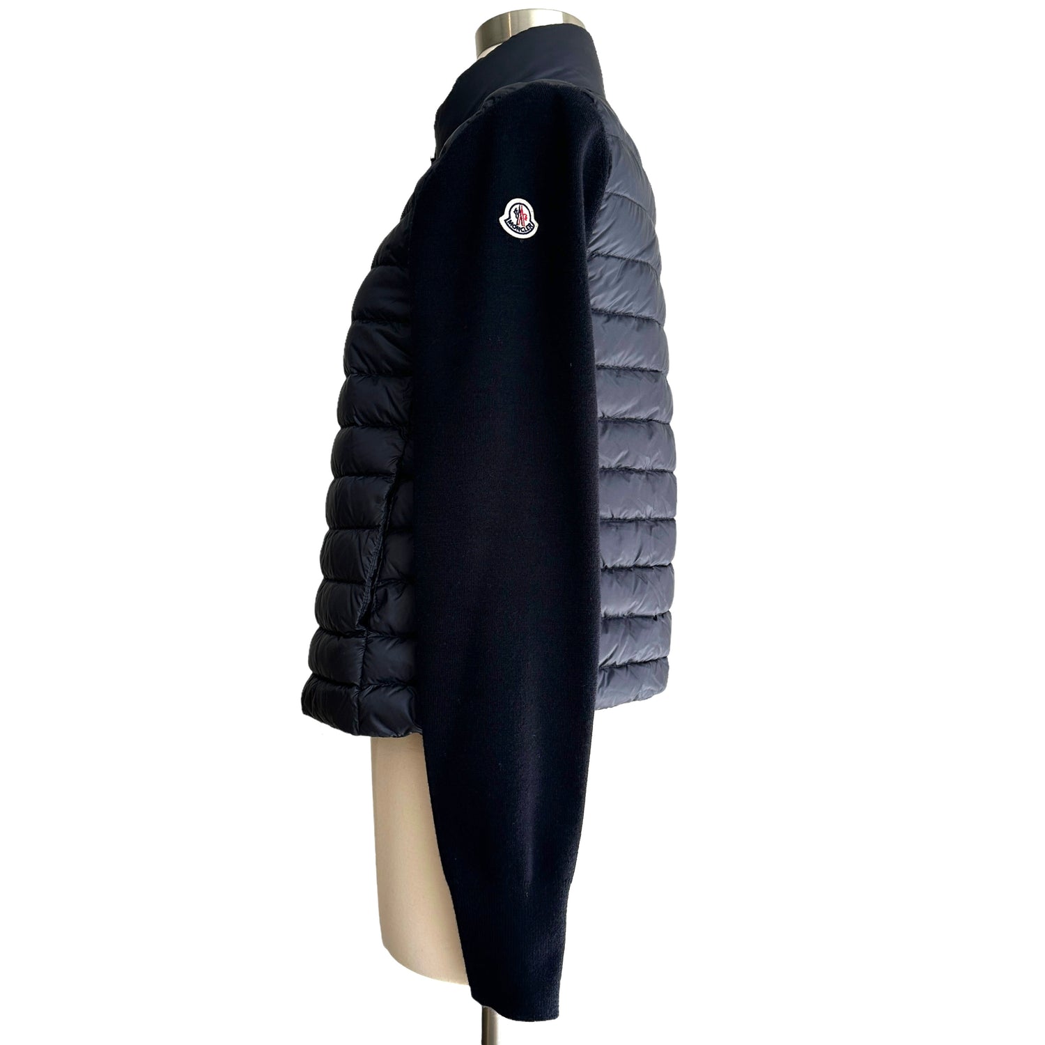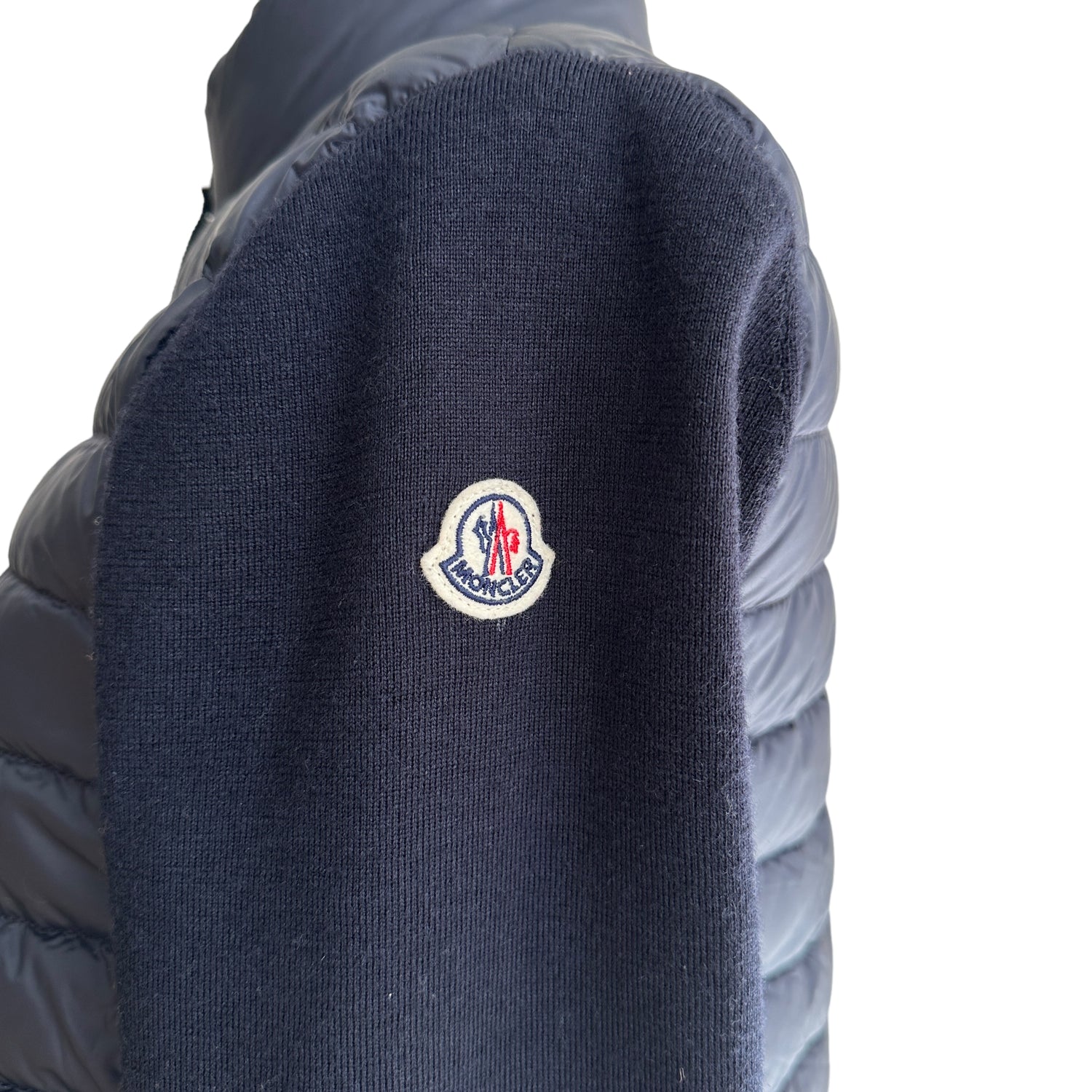 Moncler navy tricot cardigan. Puffer body. Knit sleeves. Zipper at front. Designer size XS.