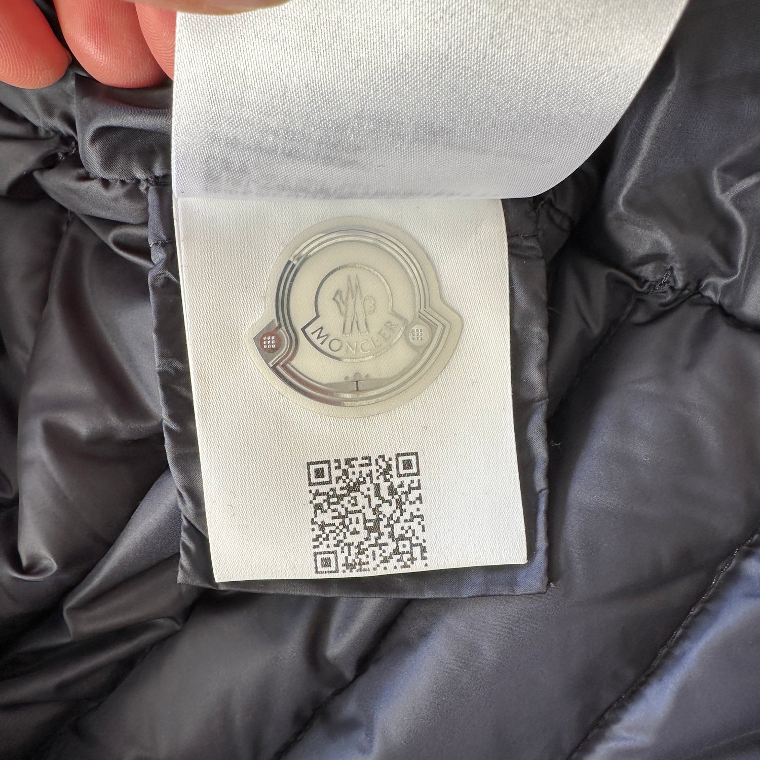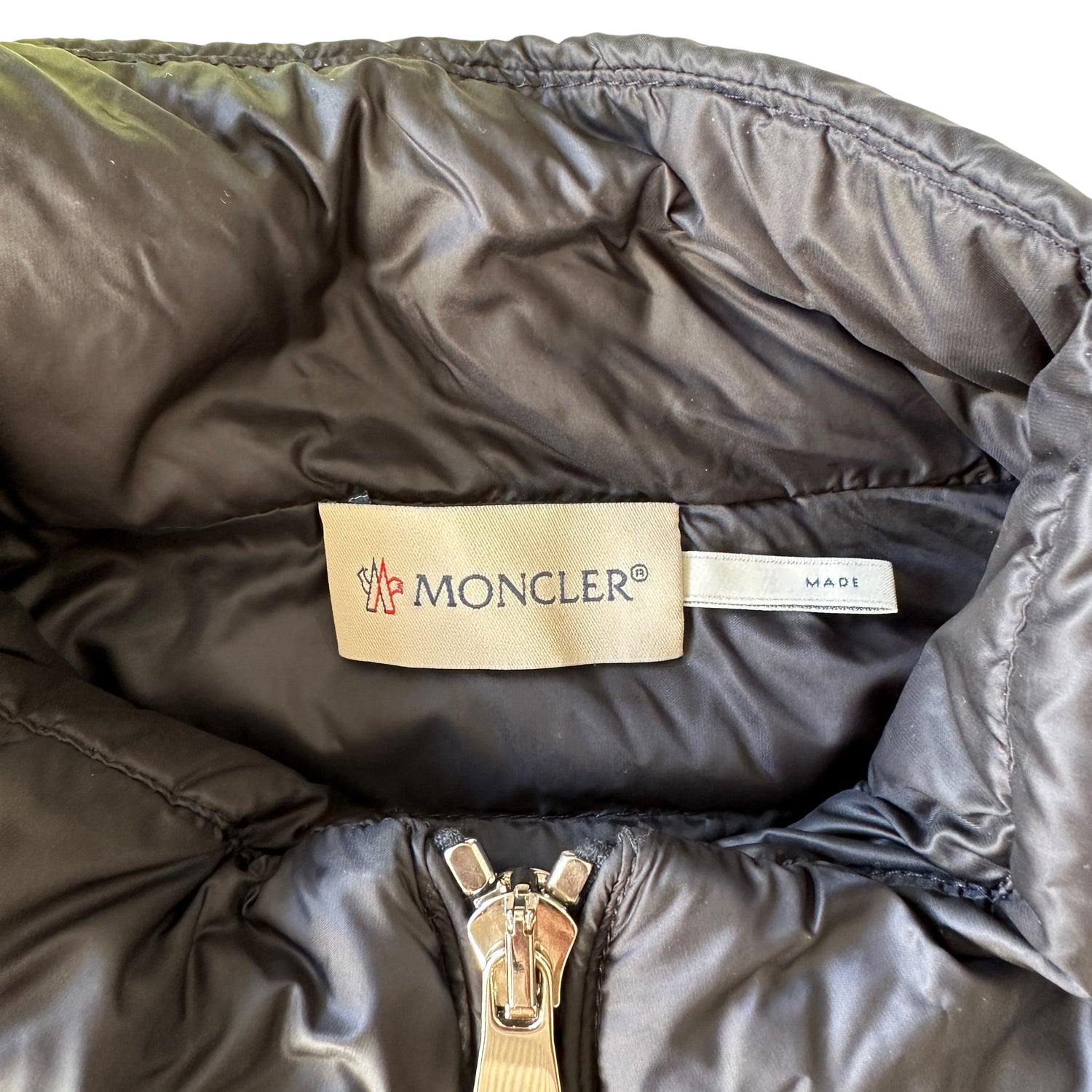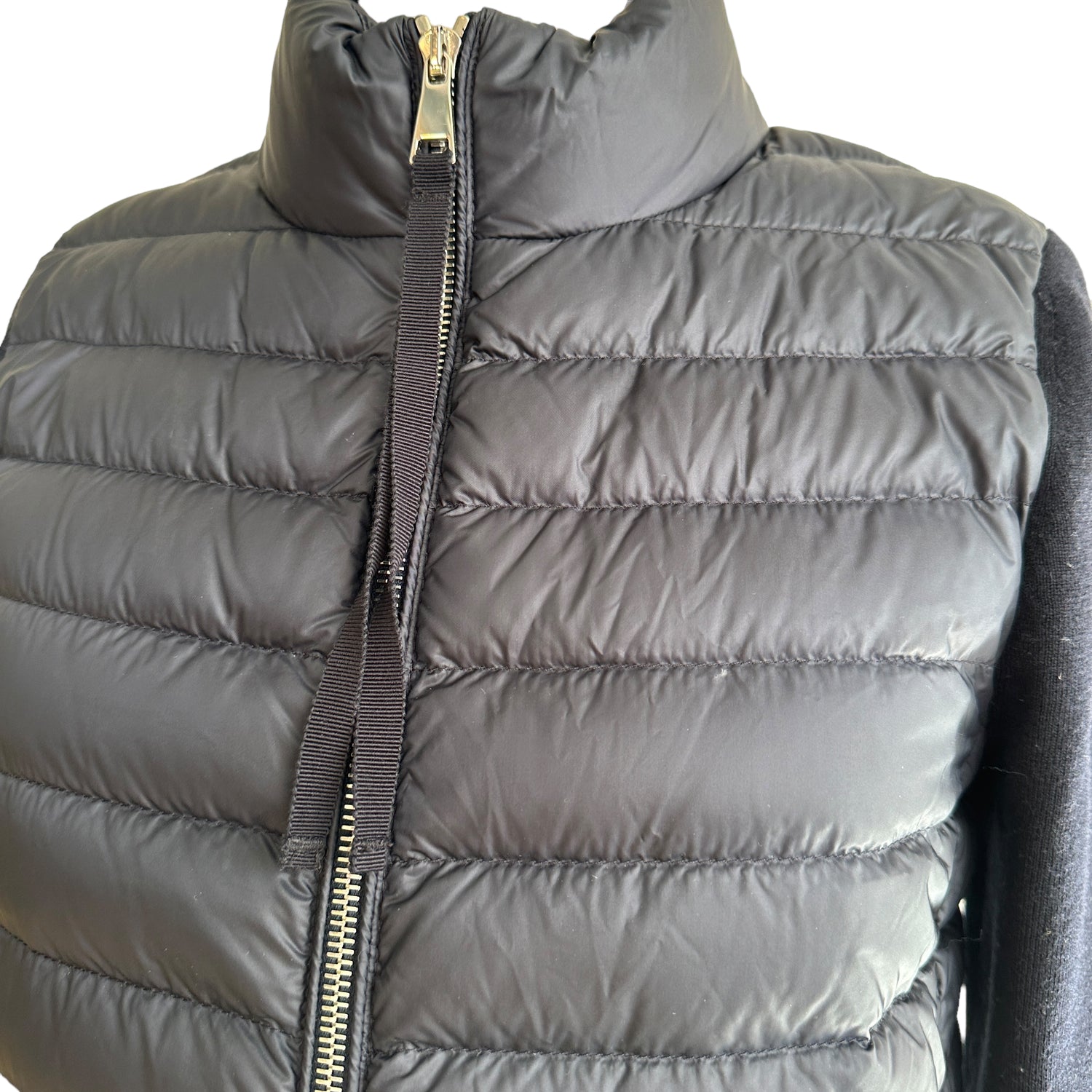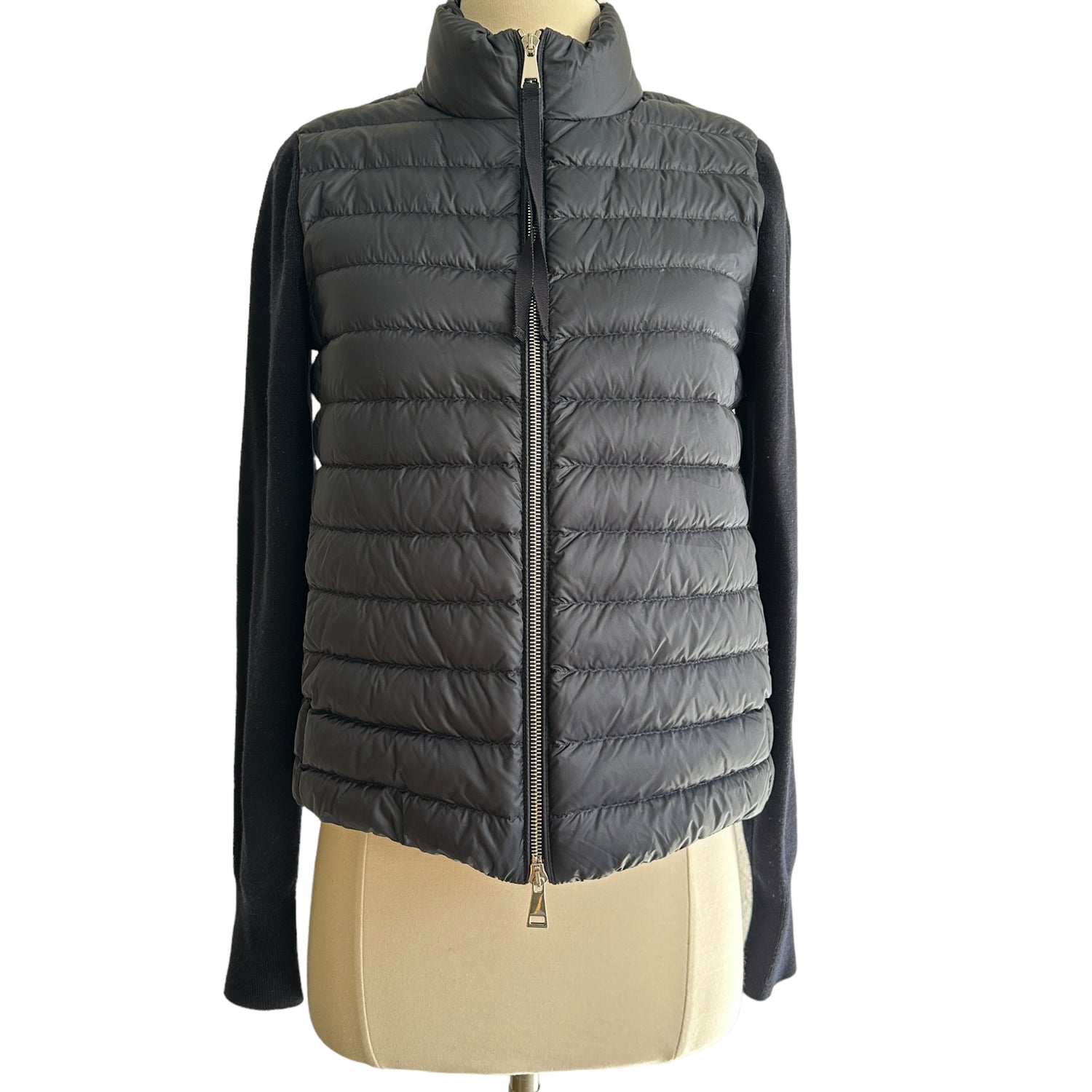 Moncler navy tricot cardigan. Puffer body. Knit sleeves. Zipper at front. Designer size XS.