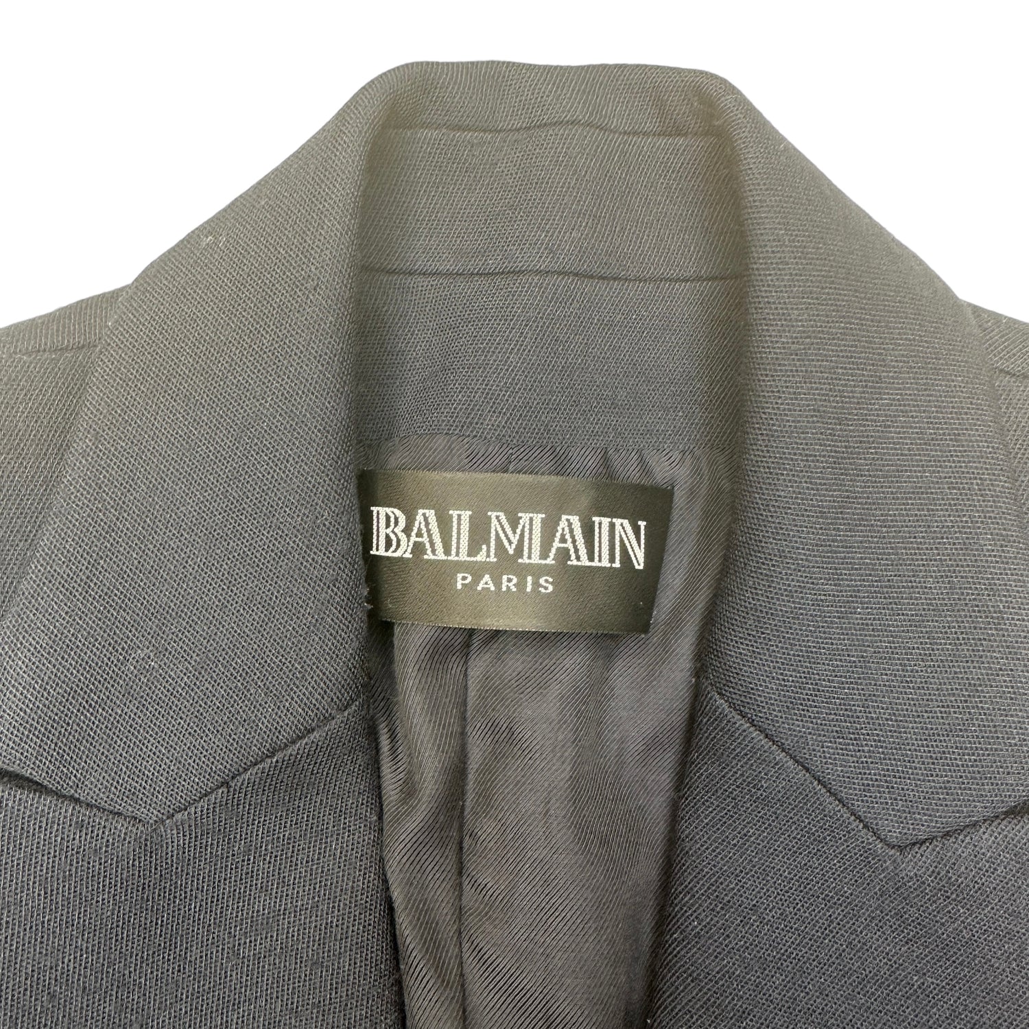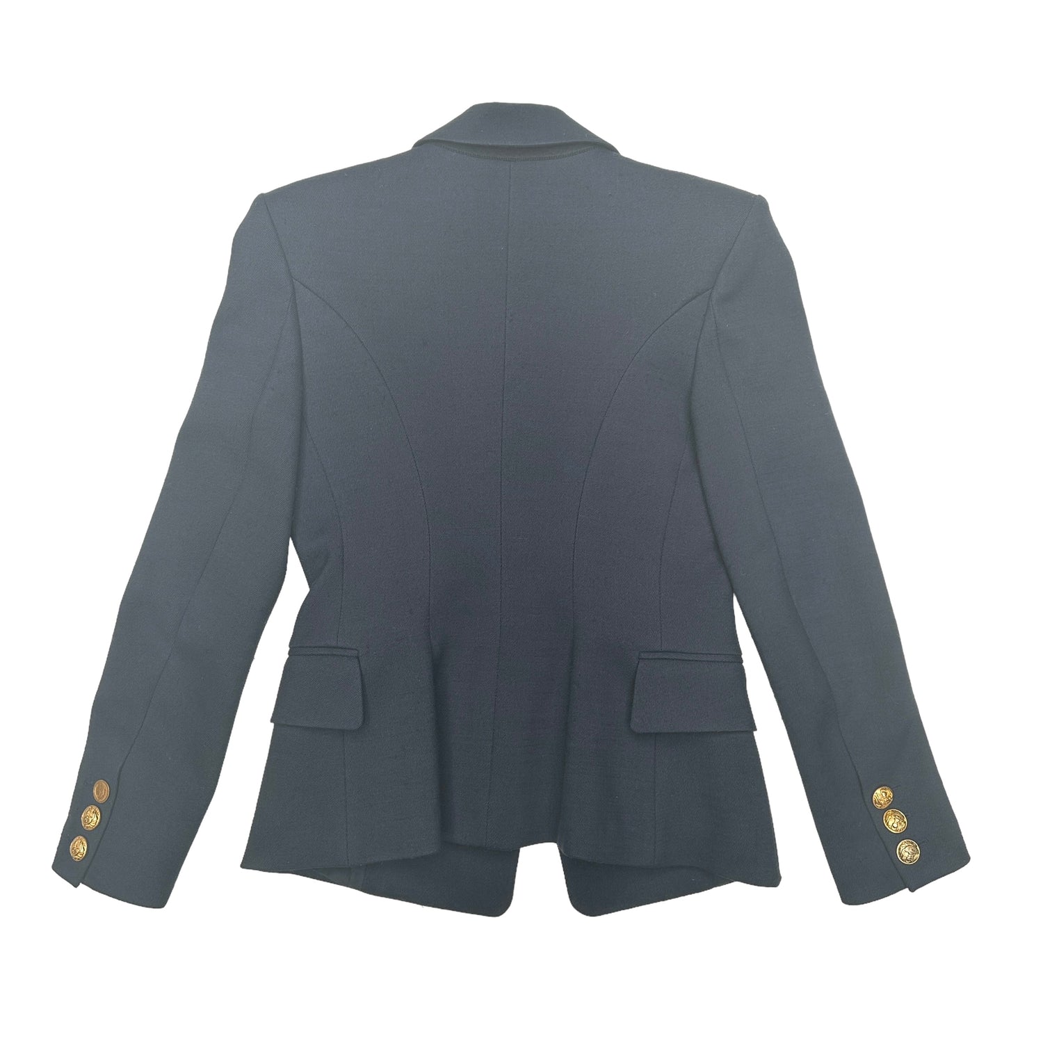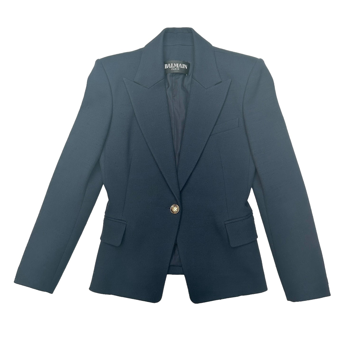 Balmain navy wool blazer. Classic and staple one to own! One gold-button closure at front. Pointed collar. Three gold buttons at sleeves. Designer size 42.
