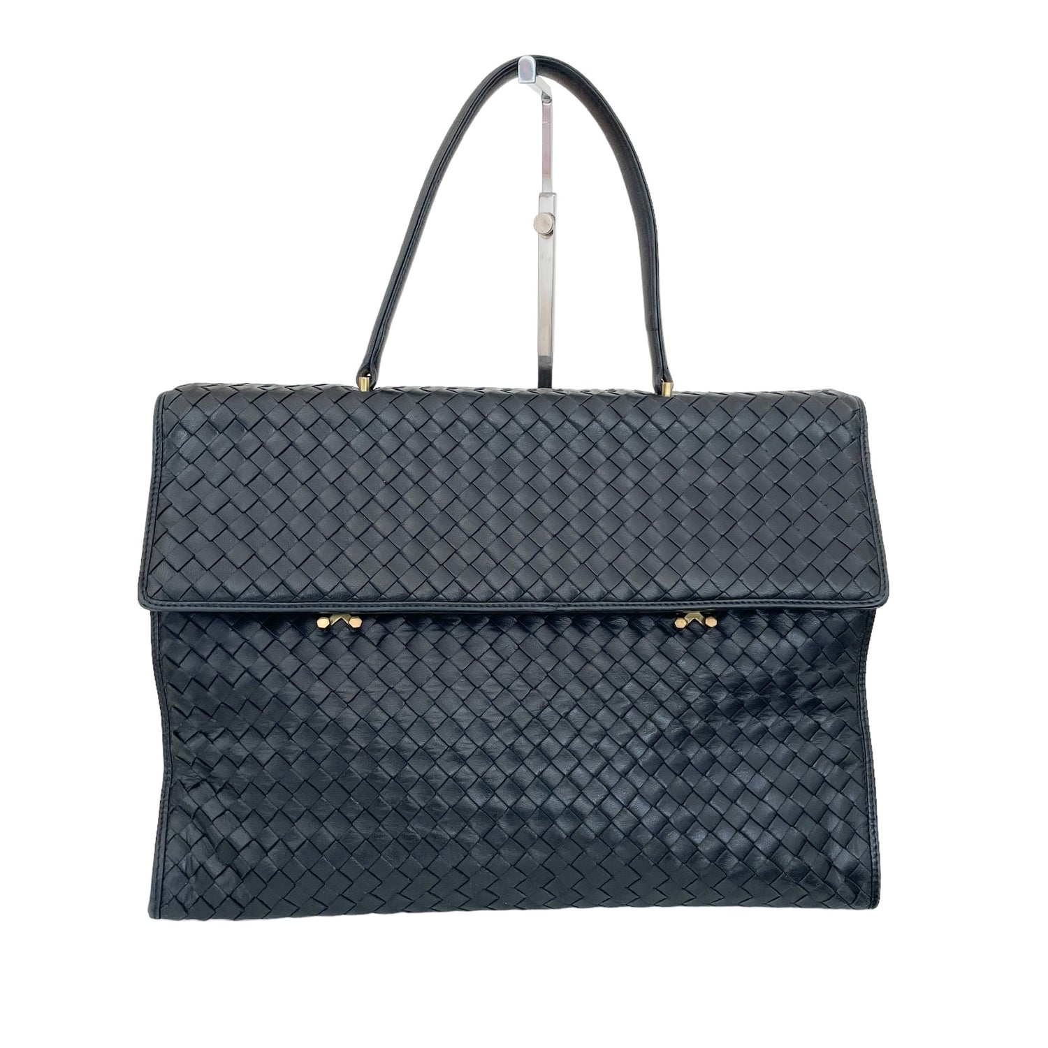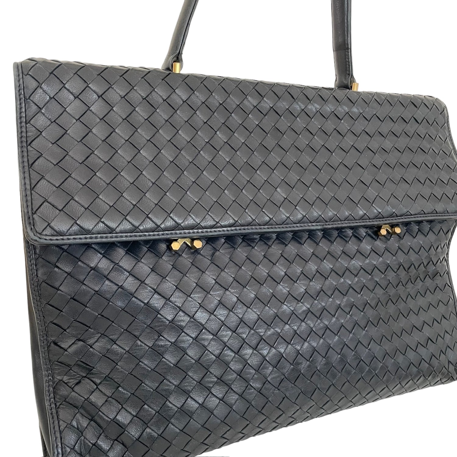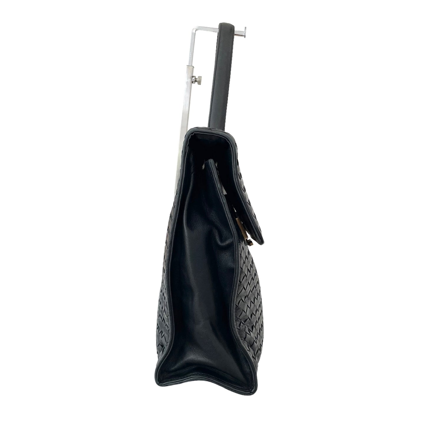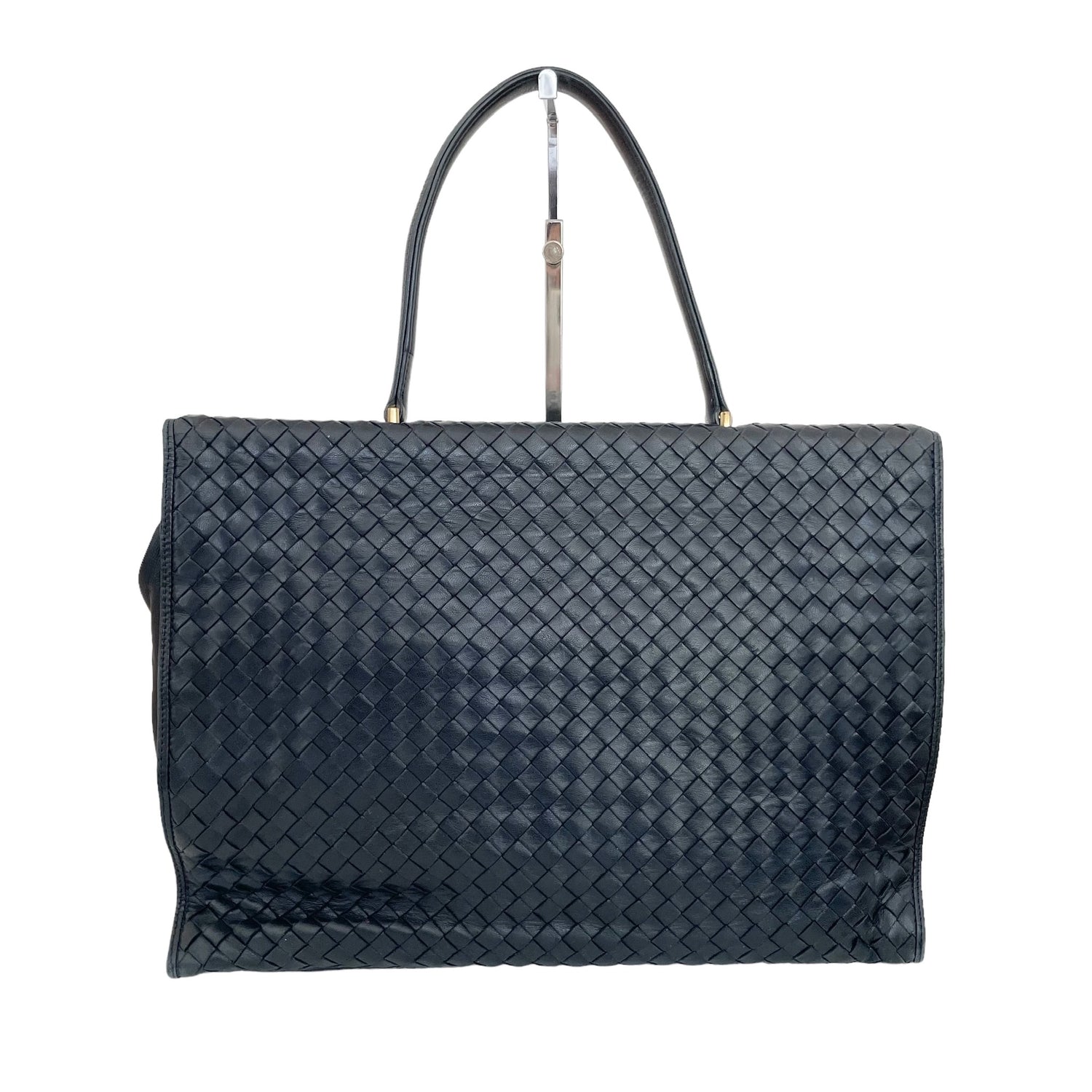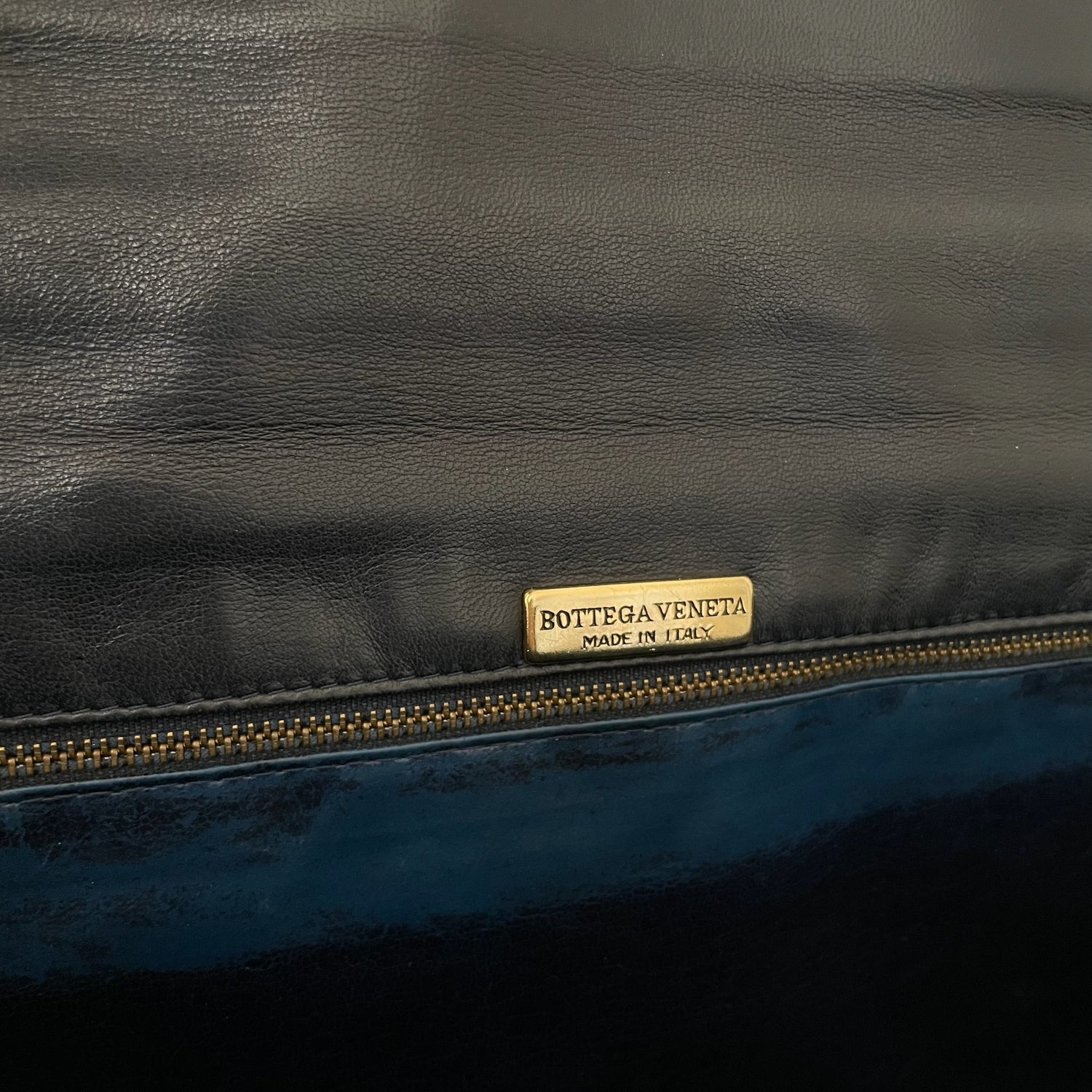Bottega Veneta navy intrecciato leather oversized shoulder bag. Two semi-concealed gold closures at front flap. Zipper pocket inside.