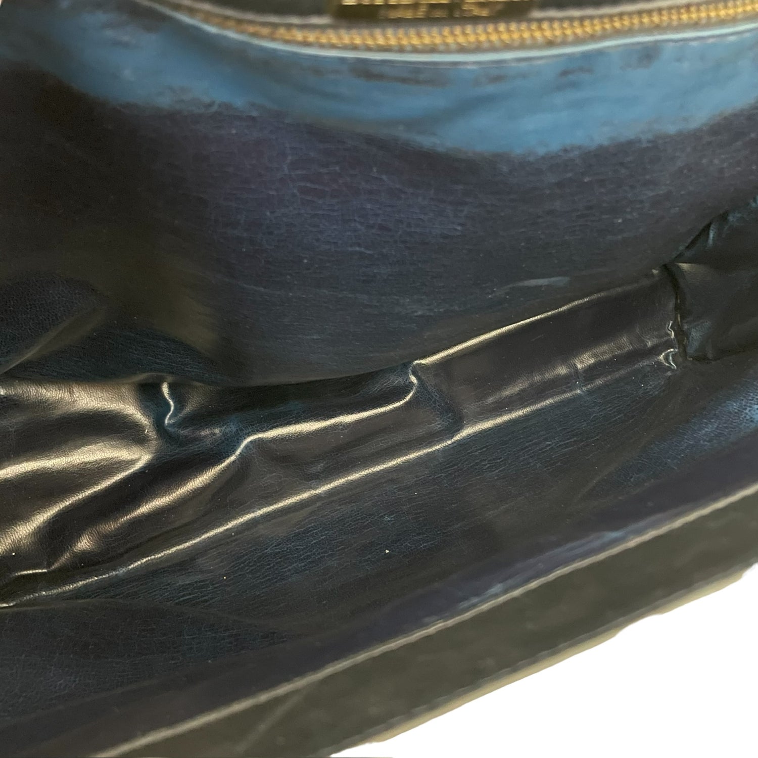Condition: Moderate wear at hardware, light corner wear, and discoloration at interior.