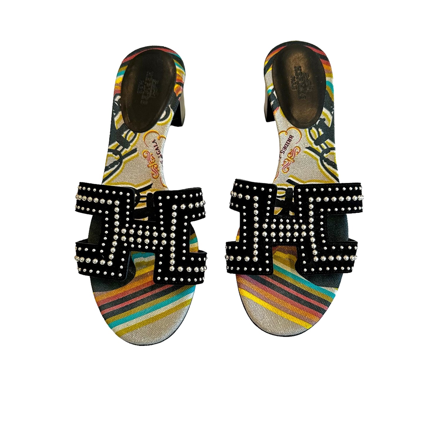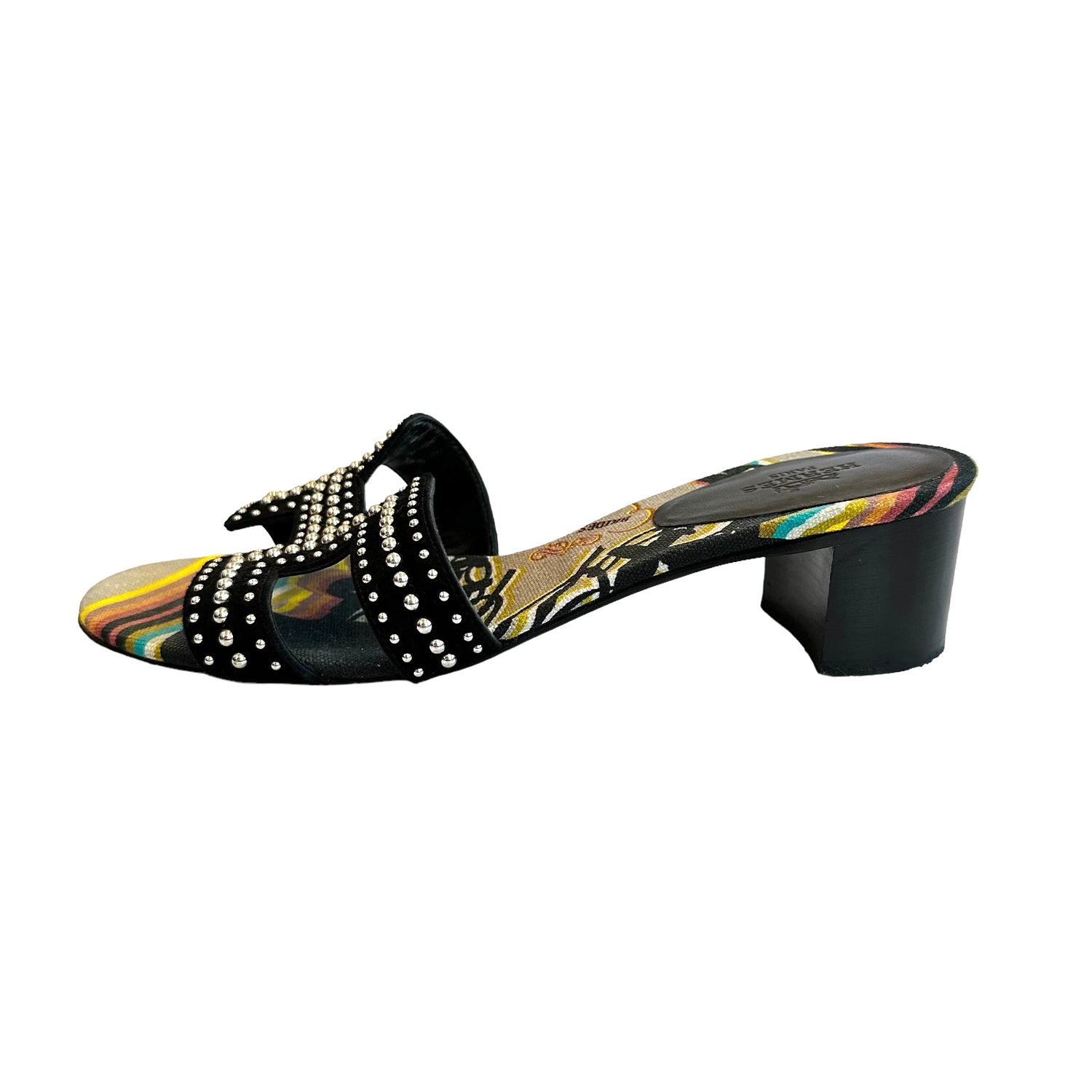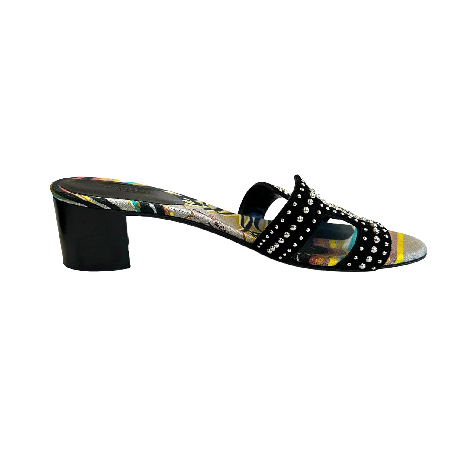 Hermes Oasis slides. Black suede with silver studs. Black heels and round toe. Beautiful printed fabric at inner soles. Designer size 36.