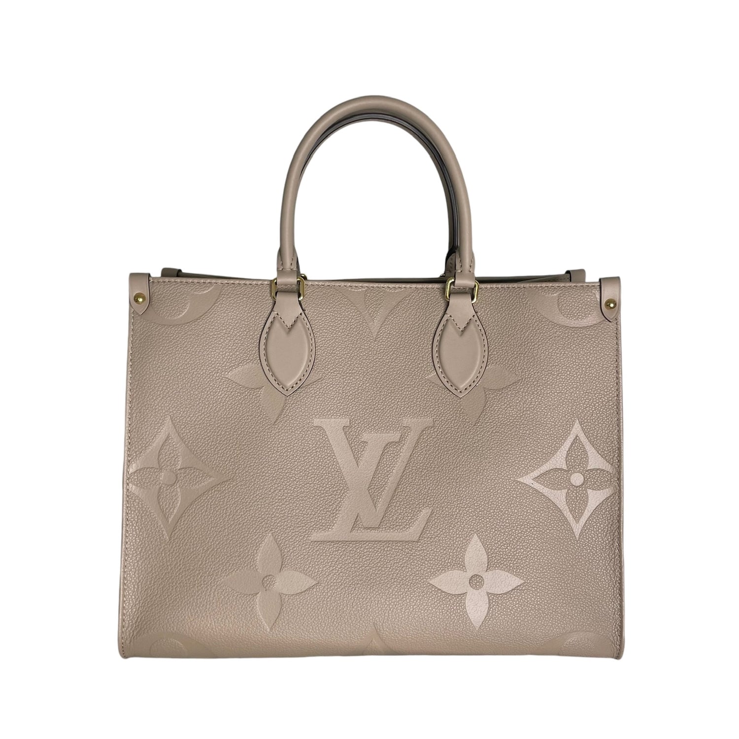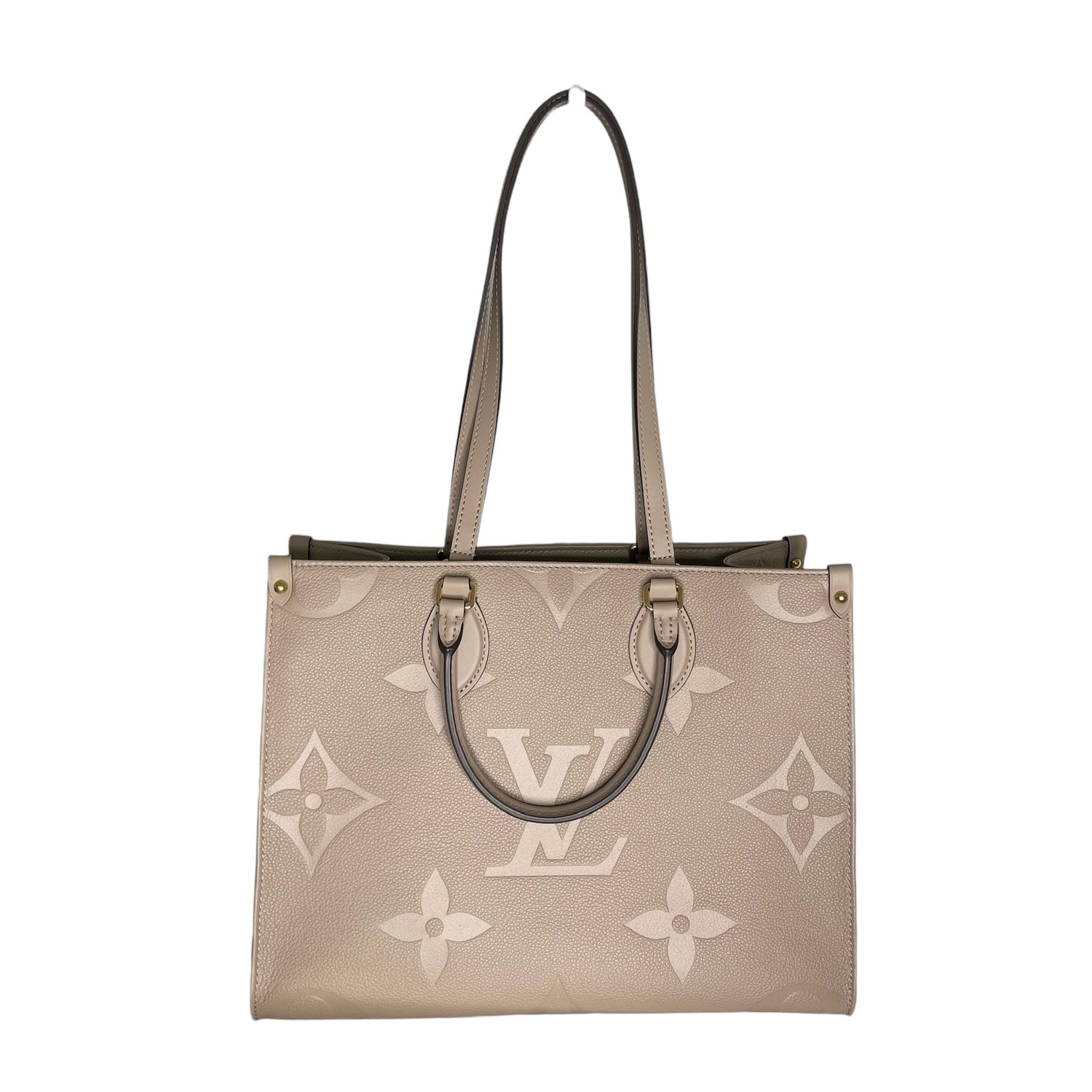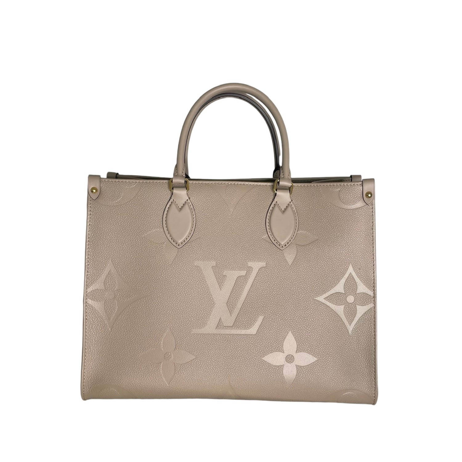 Louis Vuitton On-The-Go tote. XL monogram on a beautiful taupe/cream leather. Tourterelle color. Perfect neutral everyday bag. Double rolled handles. Double shoulder straps. Gold-tone hardware. Microfiber interior lining.