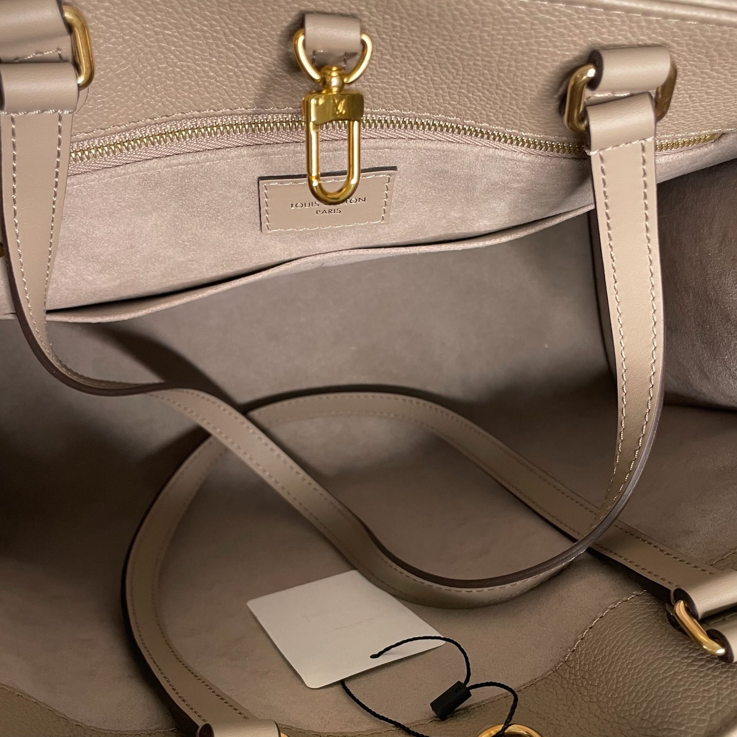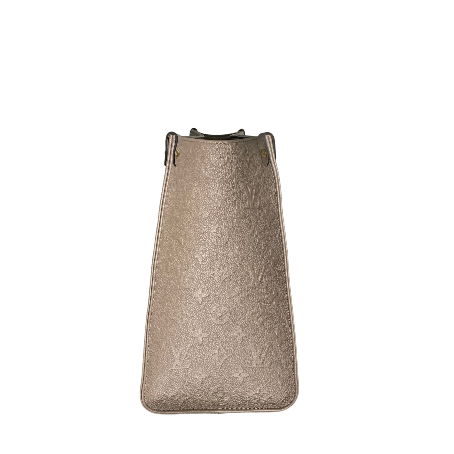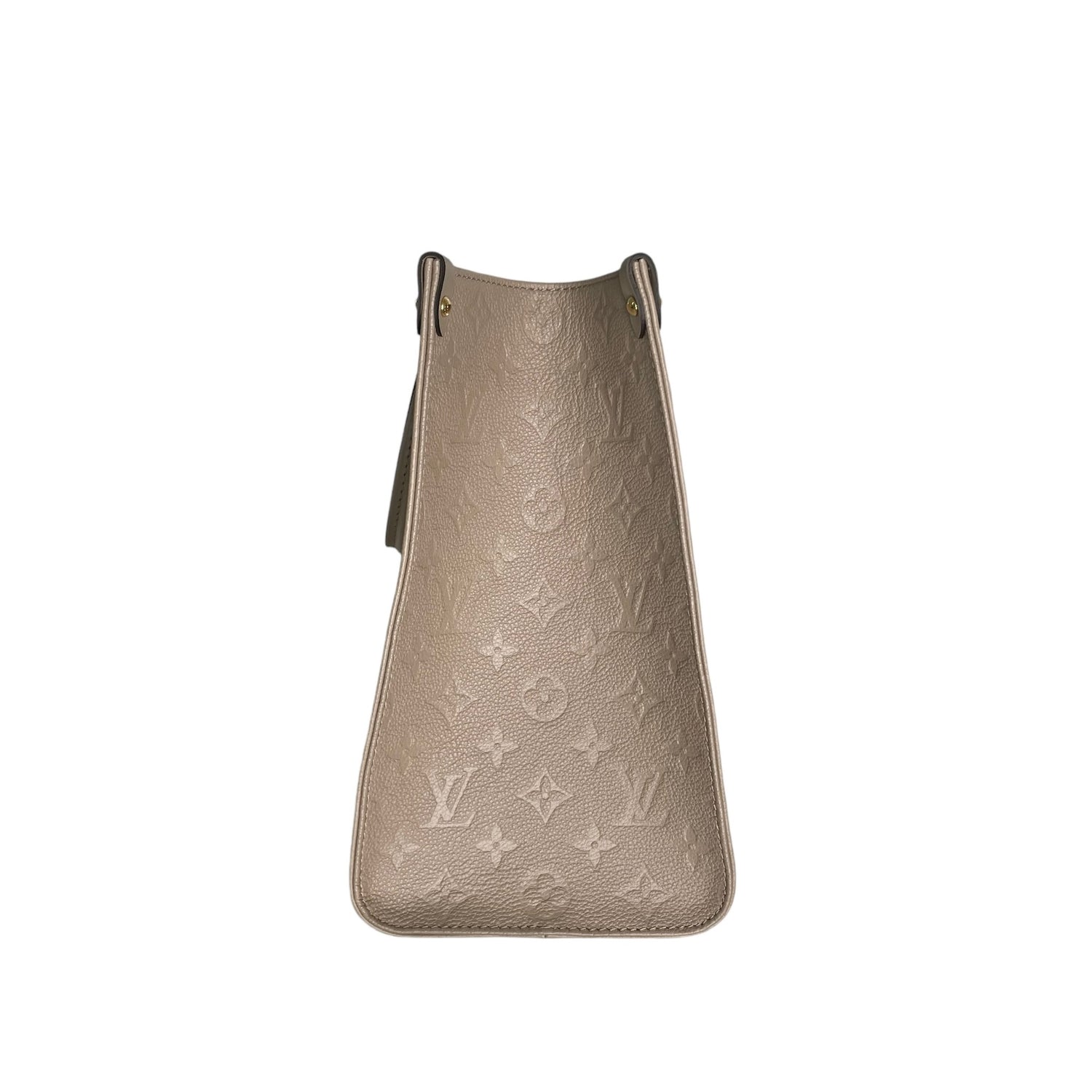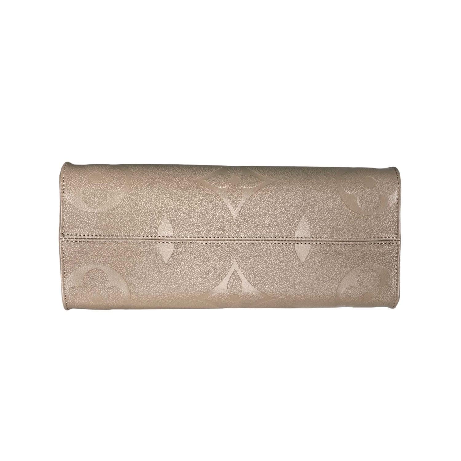 Louis Vuitton On-The-Go tote. XL monogram on a beautiful taupe/cream leather. Tourterelle color. Perfect neutral everyday bag. Double rolled handles. Double shoulder straps. Gold-tone hardware. Microfiber interior lining.