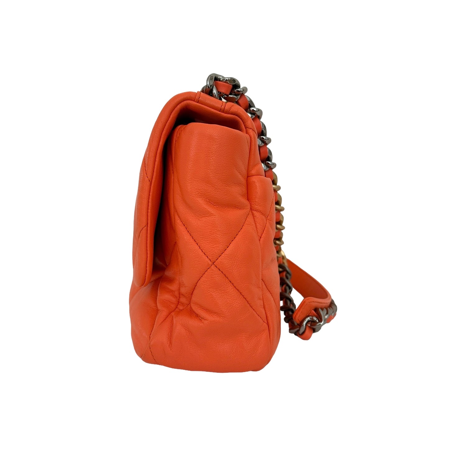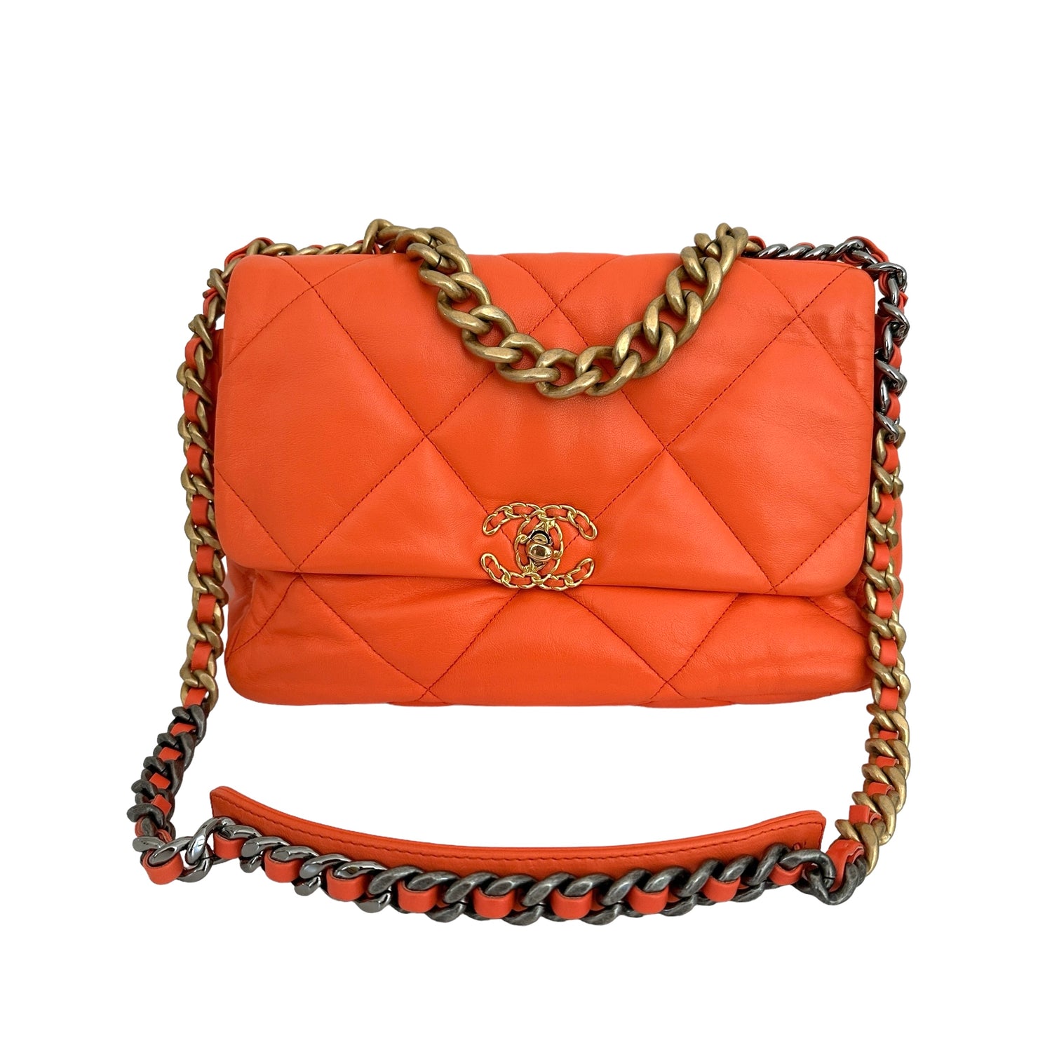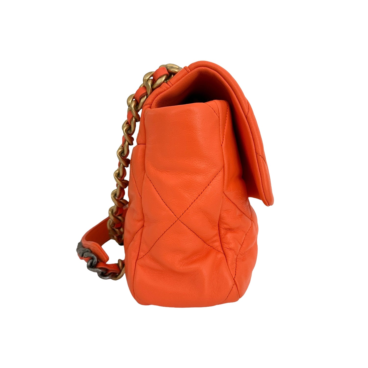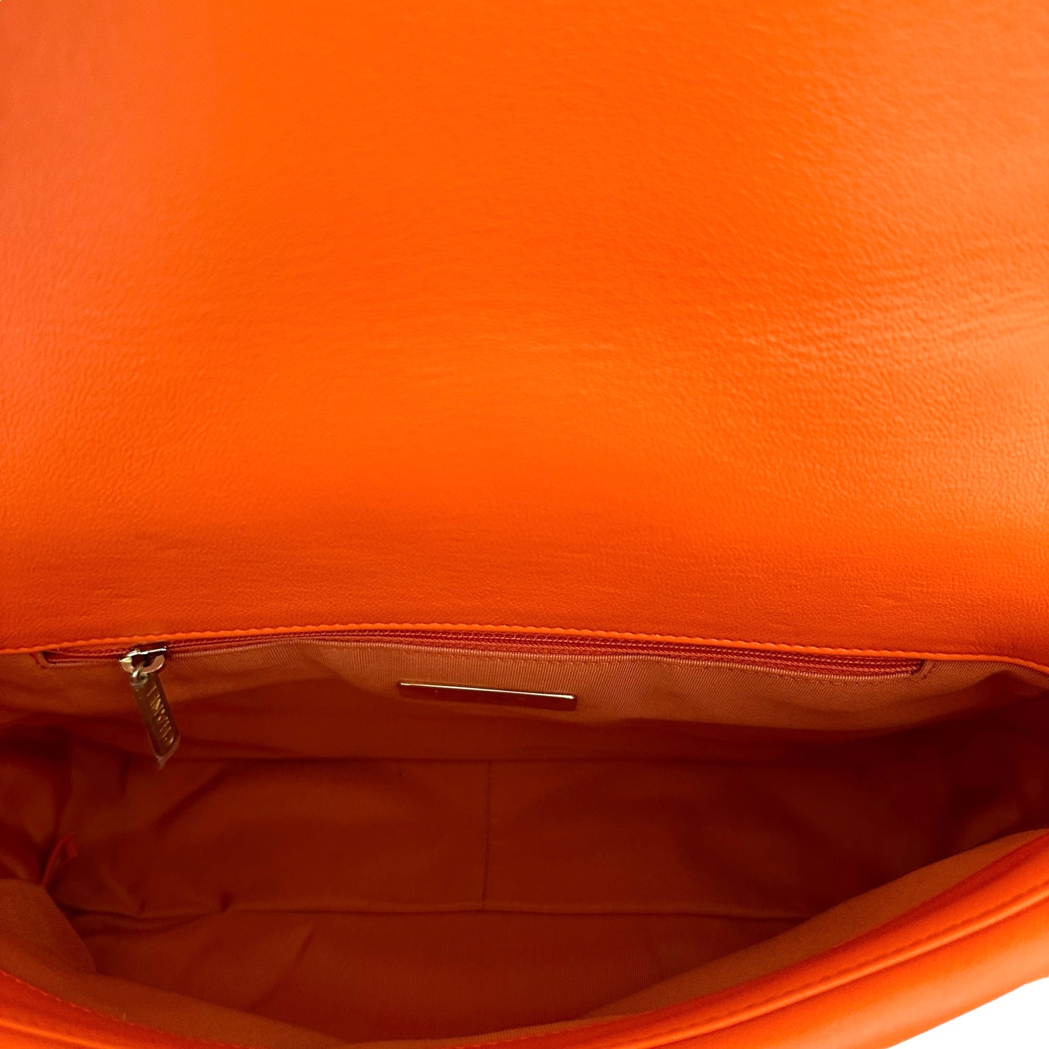 Chanel 19 bag. Orange leather with three-tone hardware. CC turnlock closure at flap. Grosgrain lining. One zipper pocket at interior.