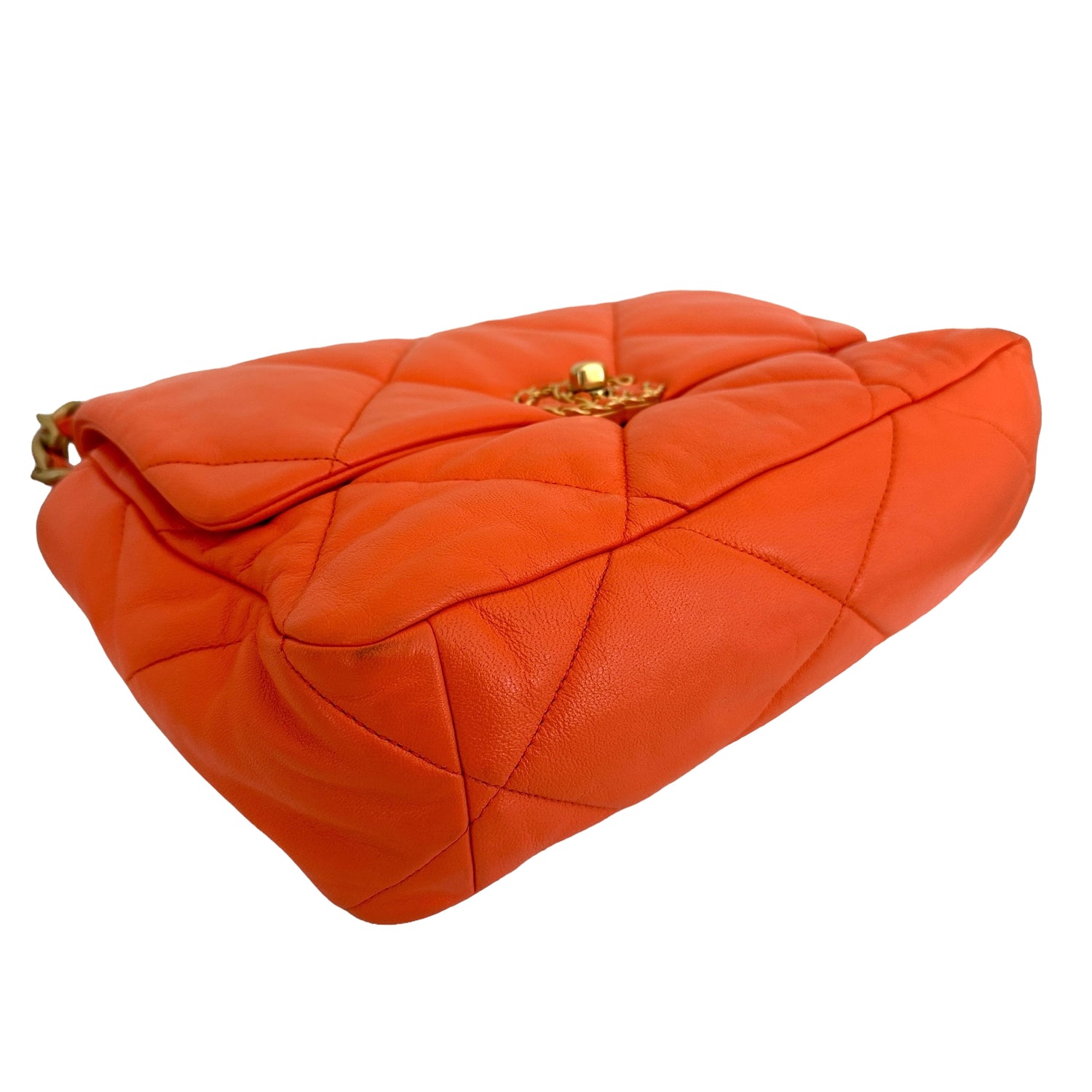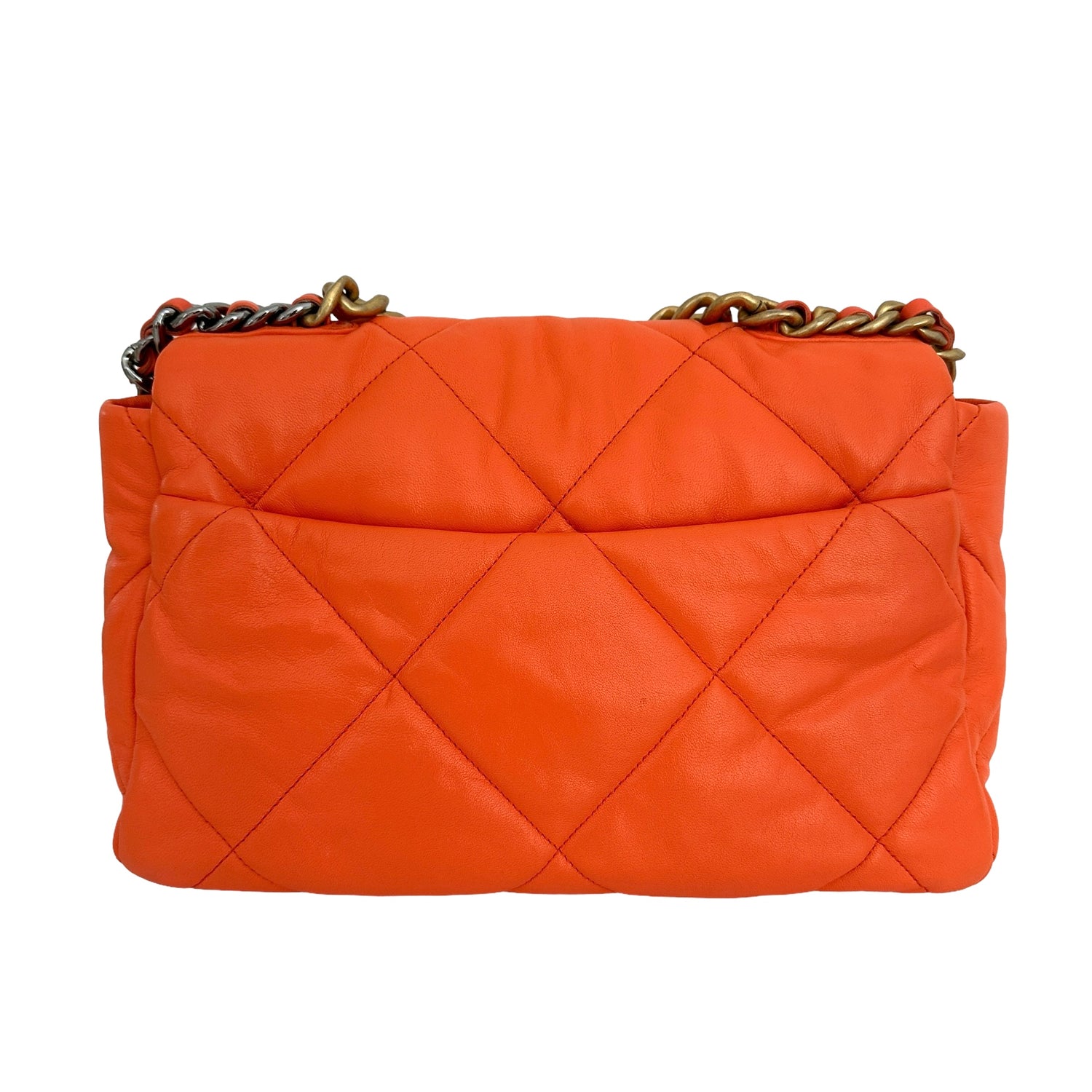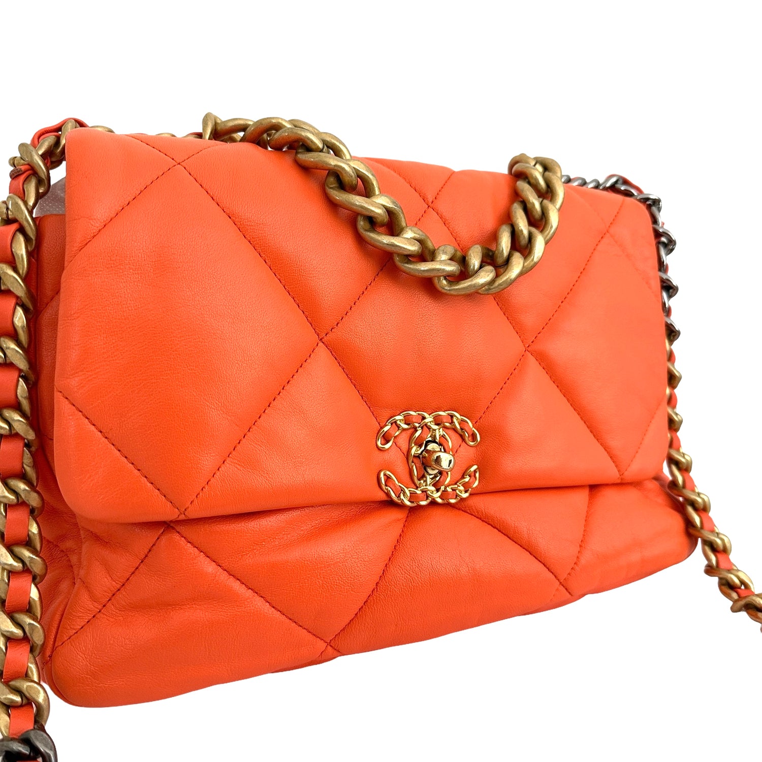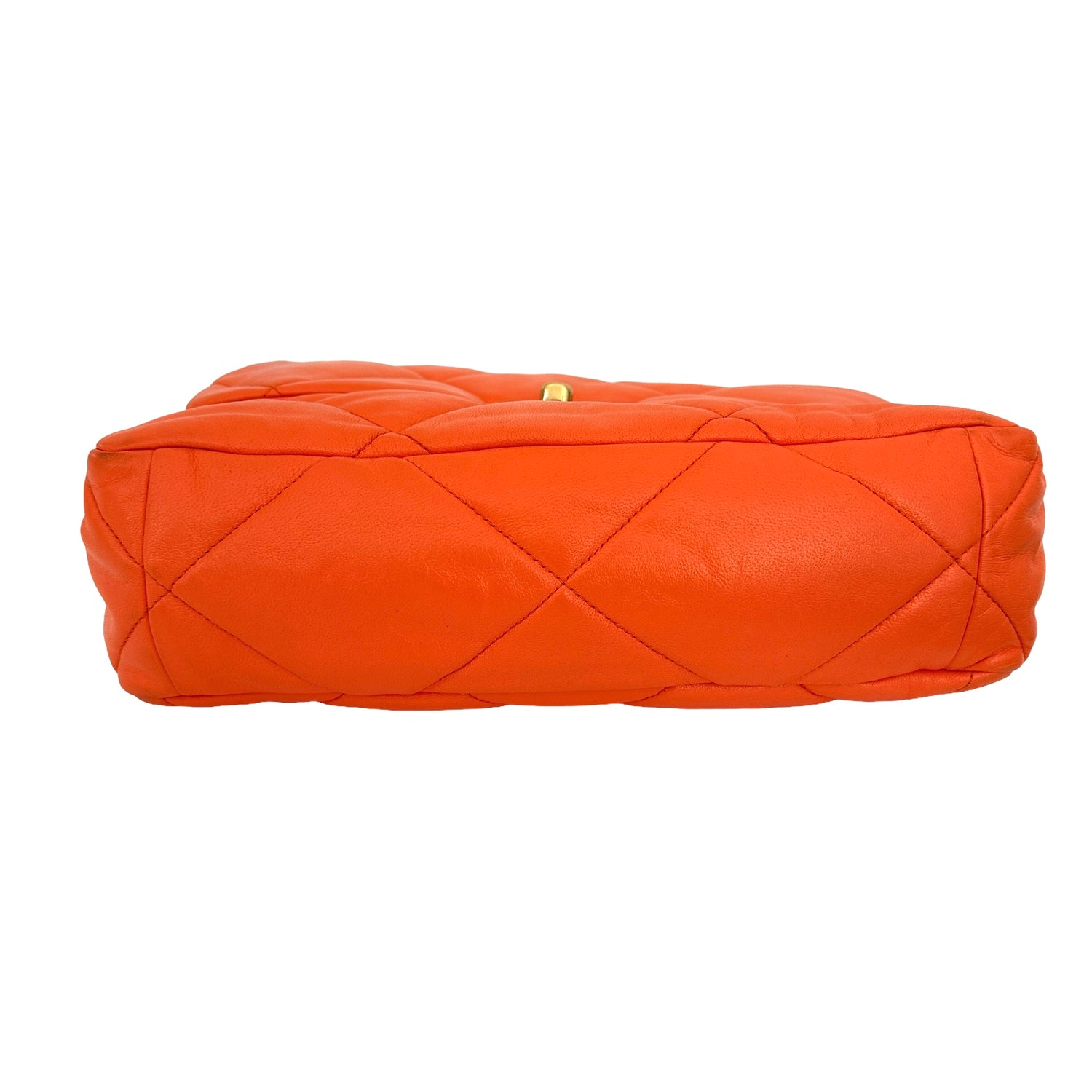 Chanel 19 bag. Orange leather with three-tone hardware. CC turnlock closure at flap. Grosgrain lining. One zipper pocket at interior.