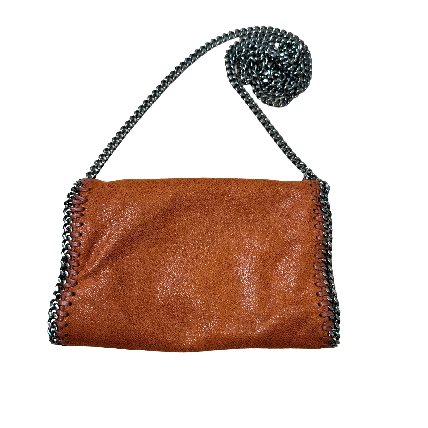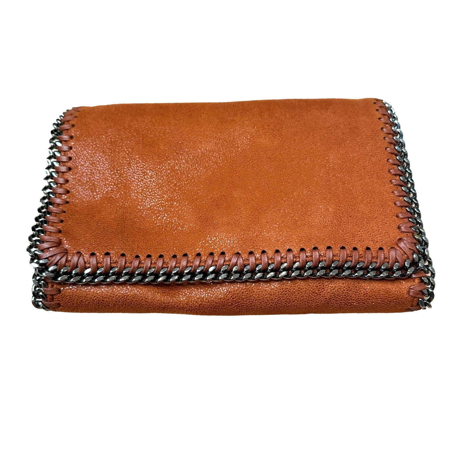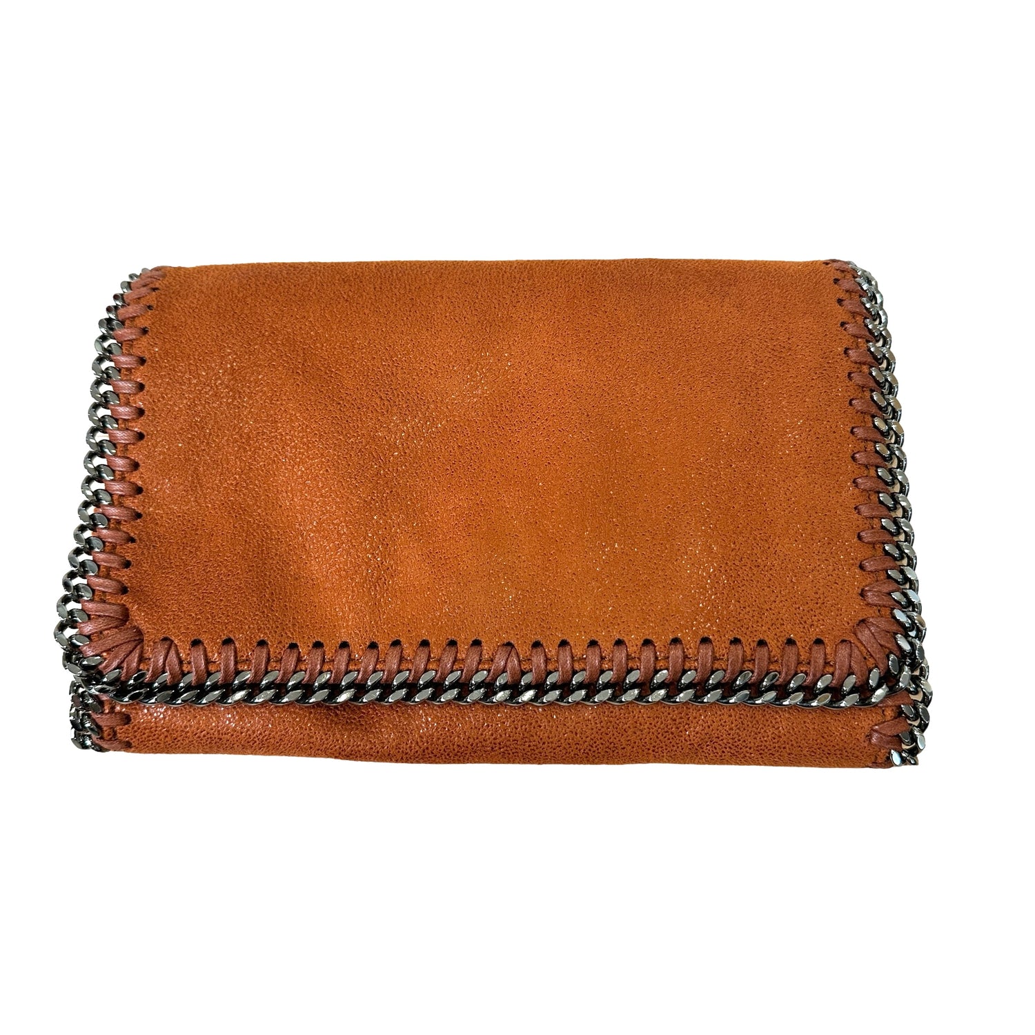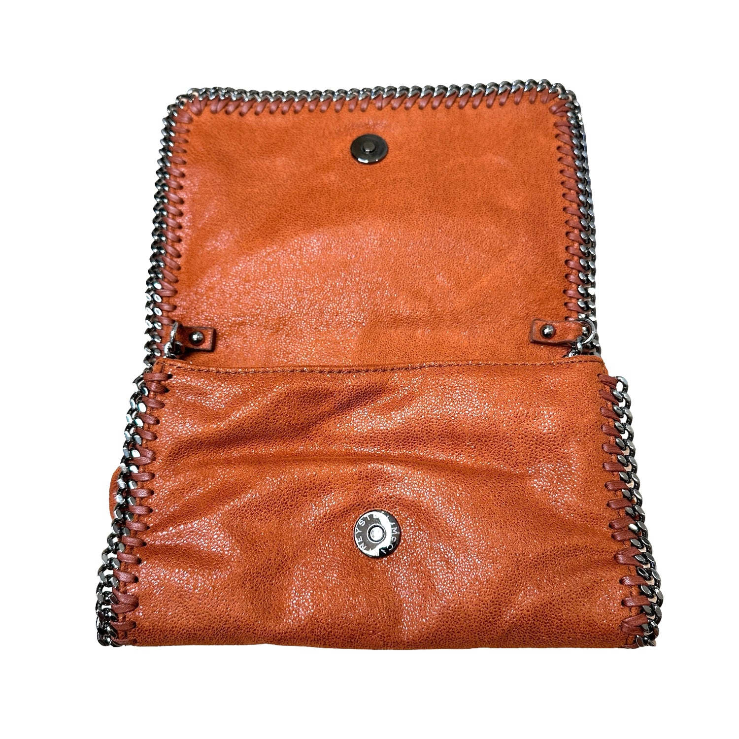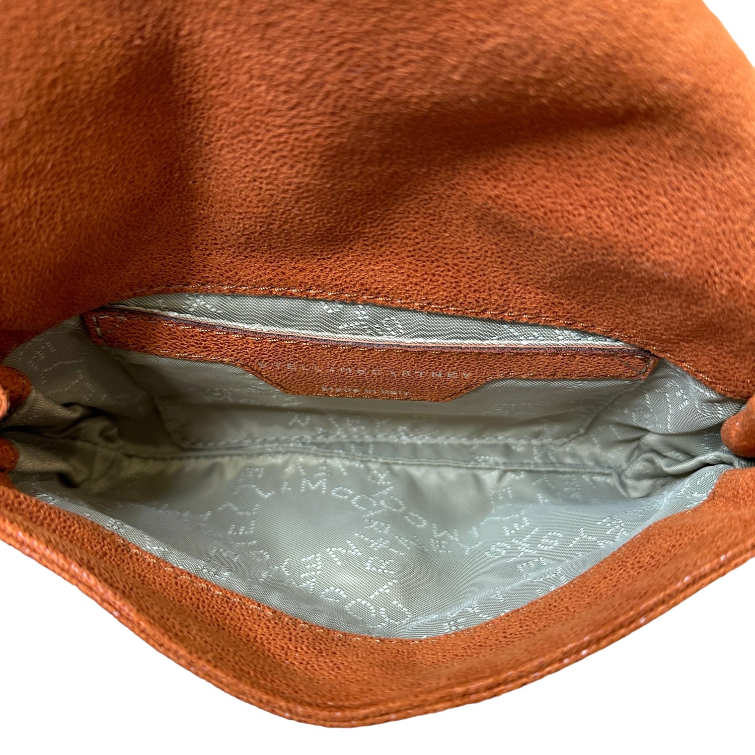 Stella McCartney orange mini crossbody bag. Vegan suede leather. Silver-tone chain and logo medallion. Logo canvas lining with one slit pocket.