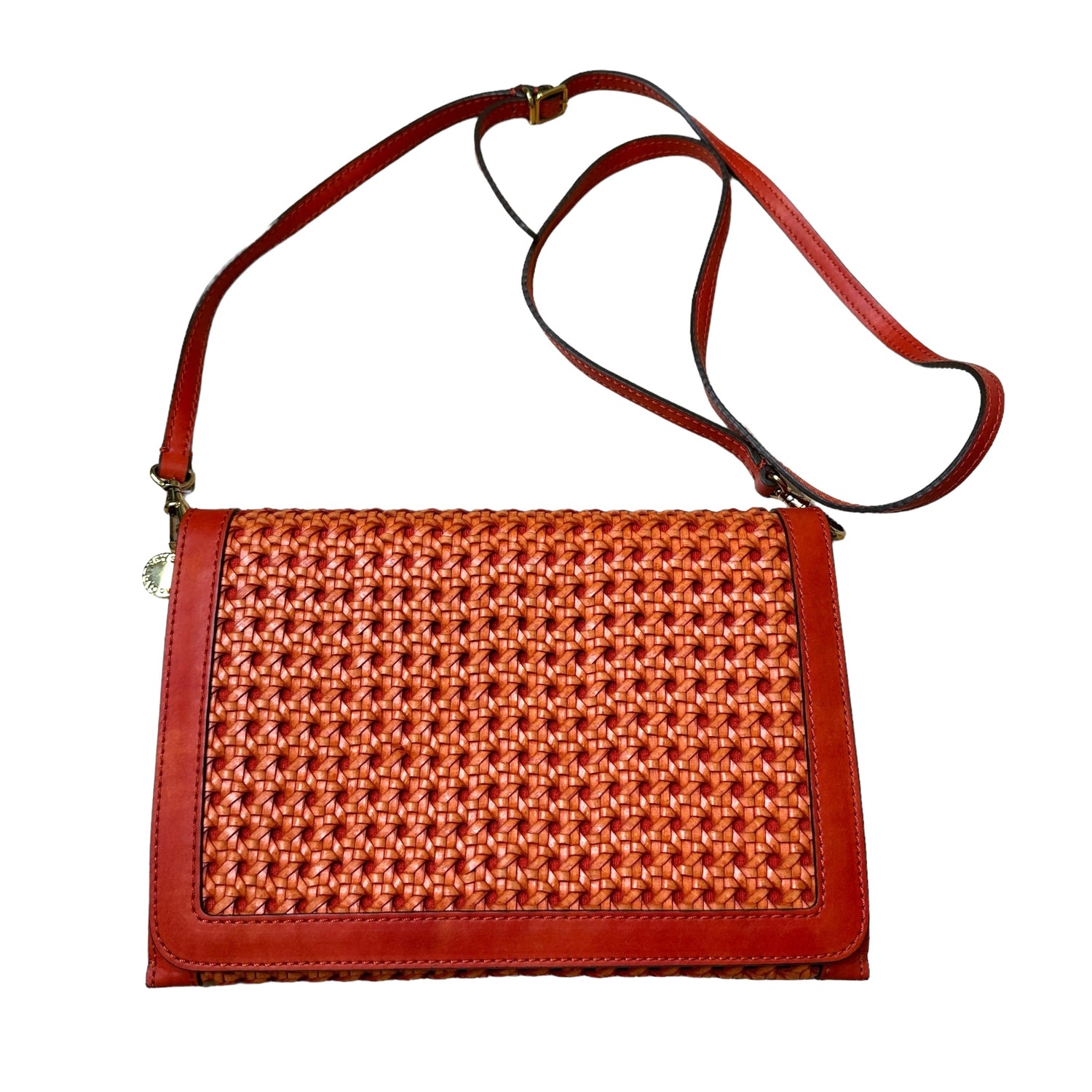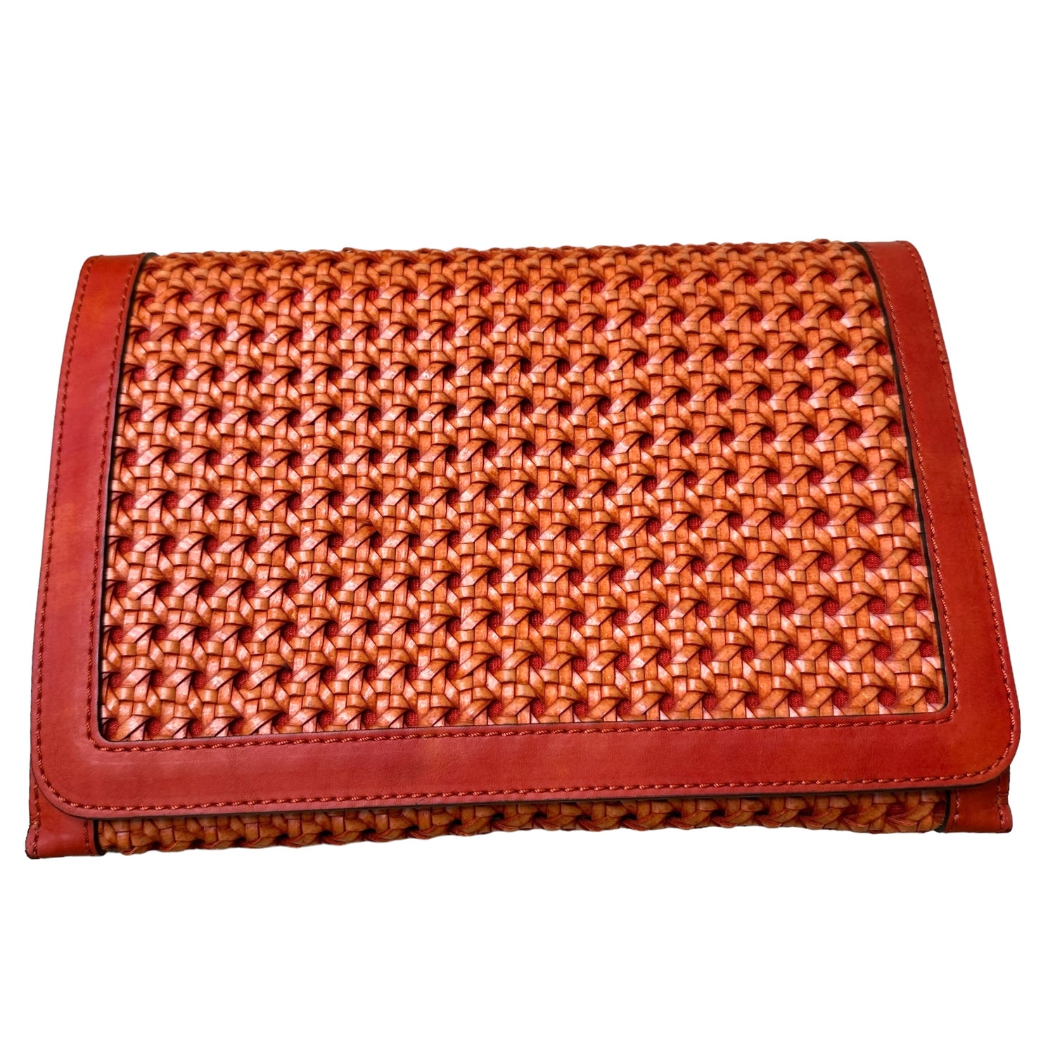 Stella McCartney orange raffia flap bag. Vegan leather. Removable strap to be carried as a clutch.