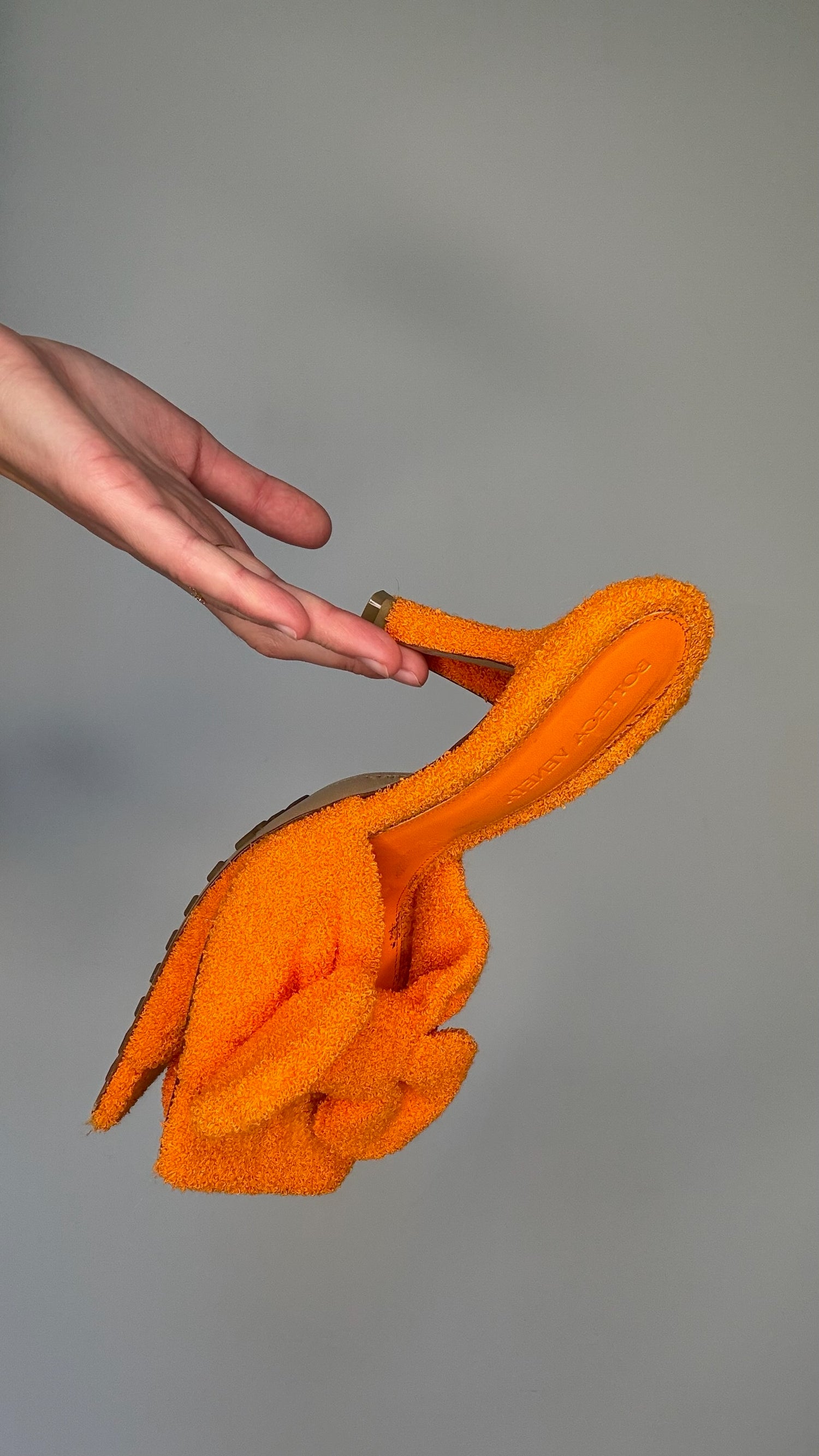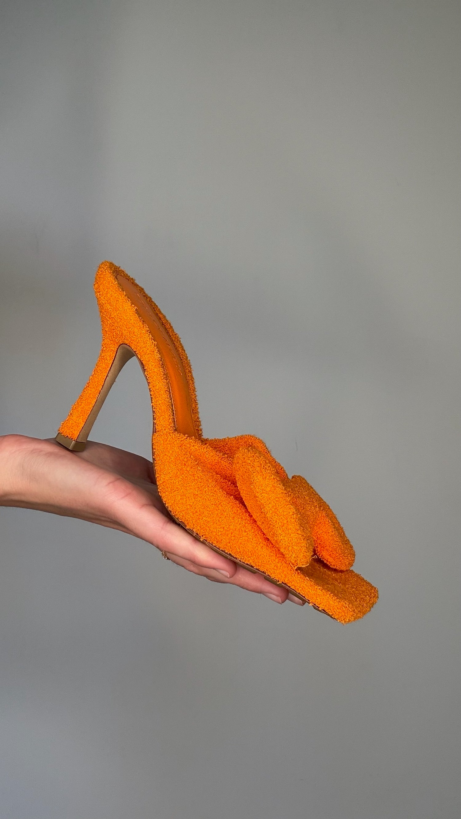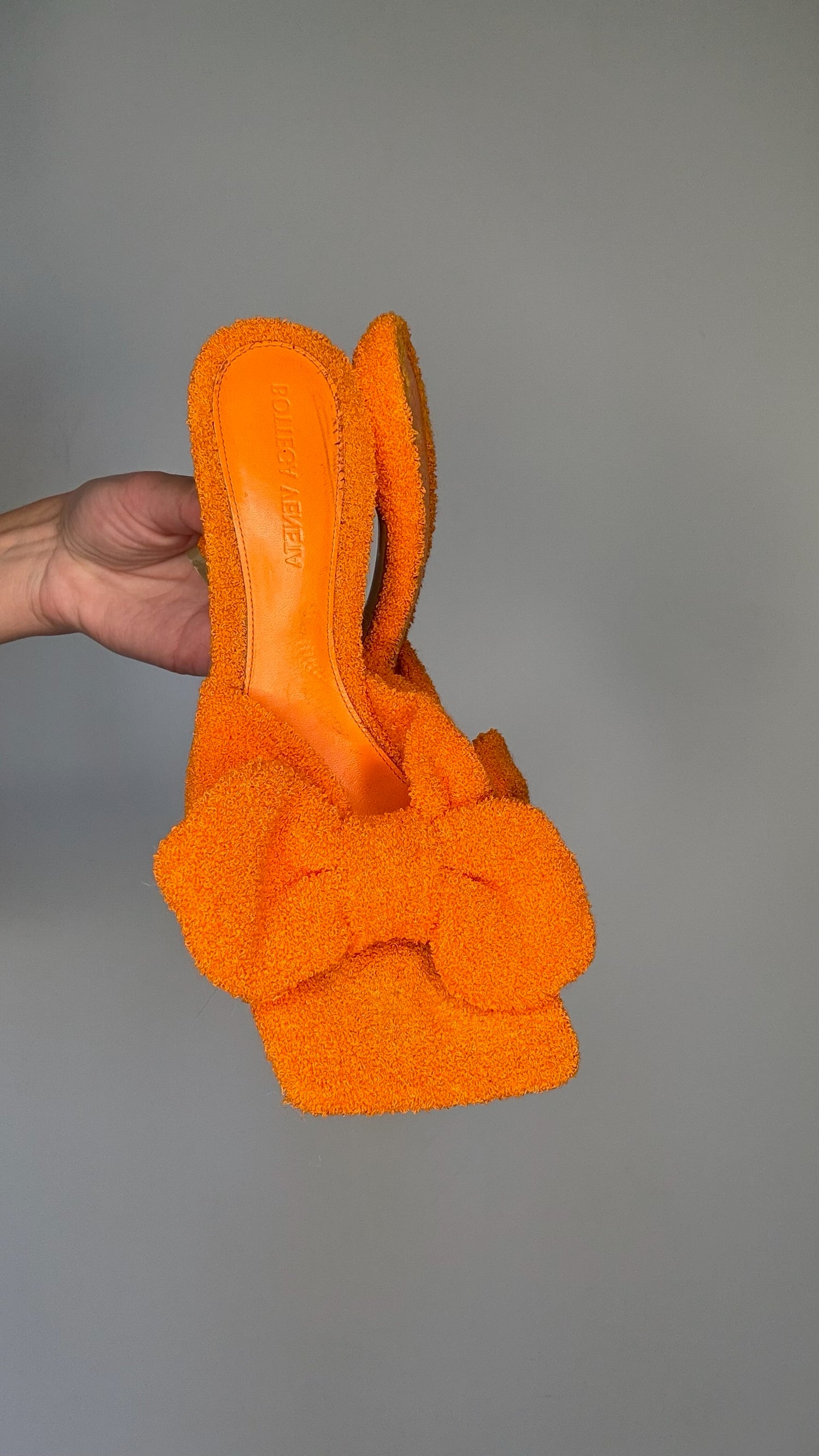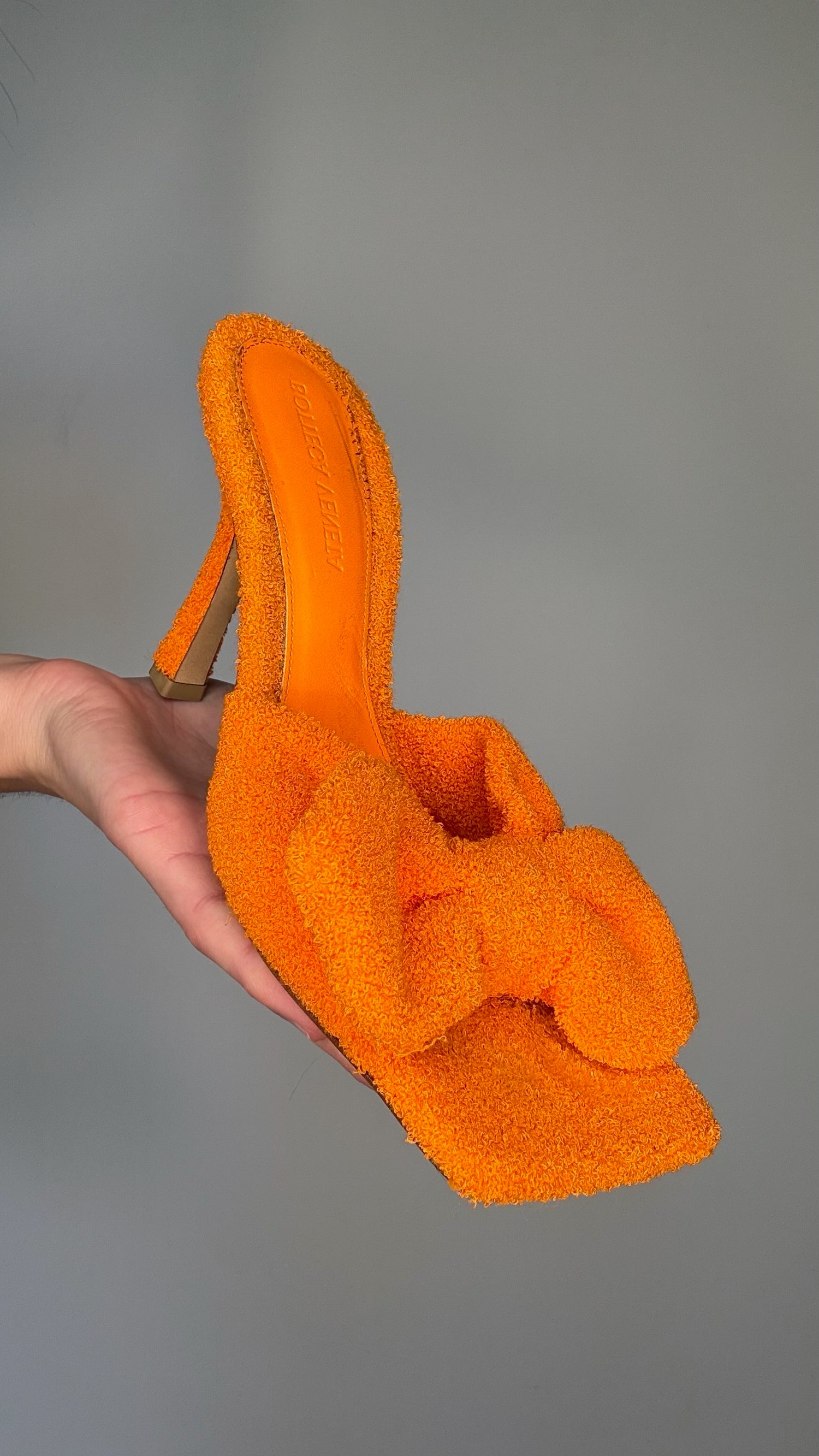 Bottega Veneta orange terrycloth heels. Square toe. Bow detail on top. Designer size 37.