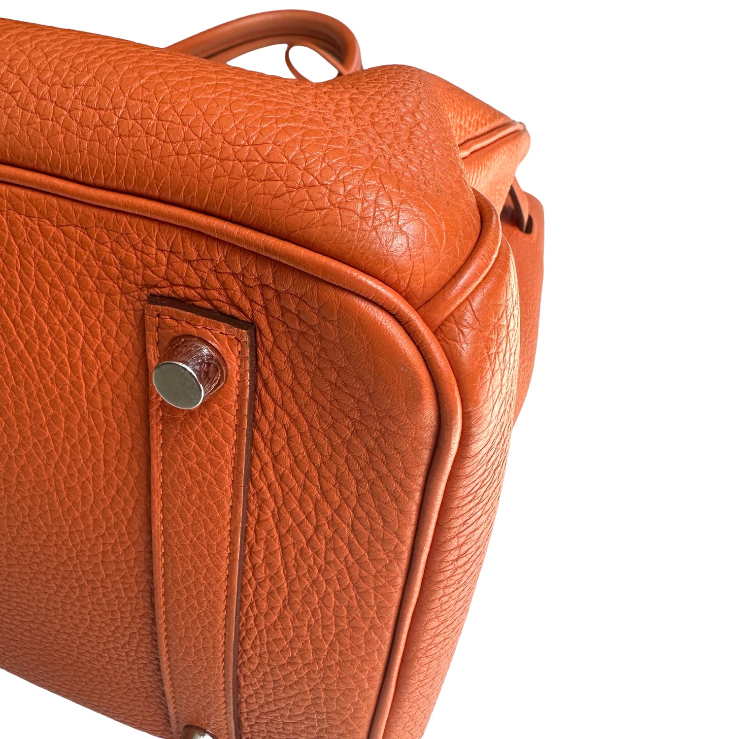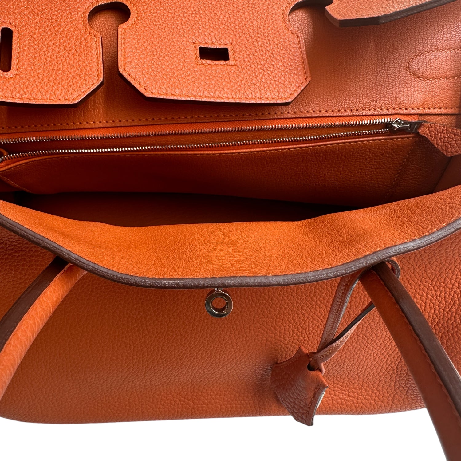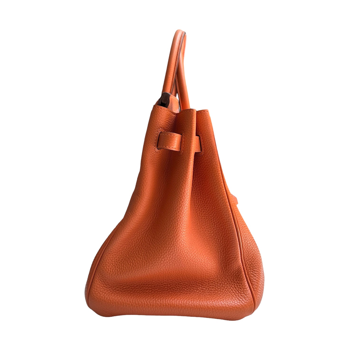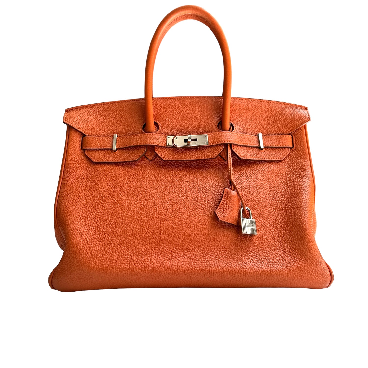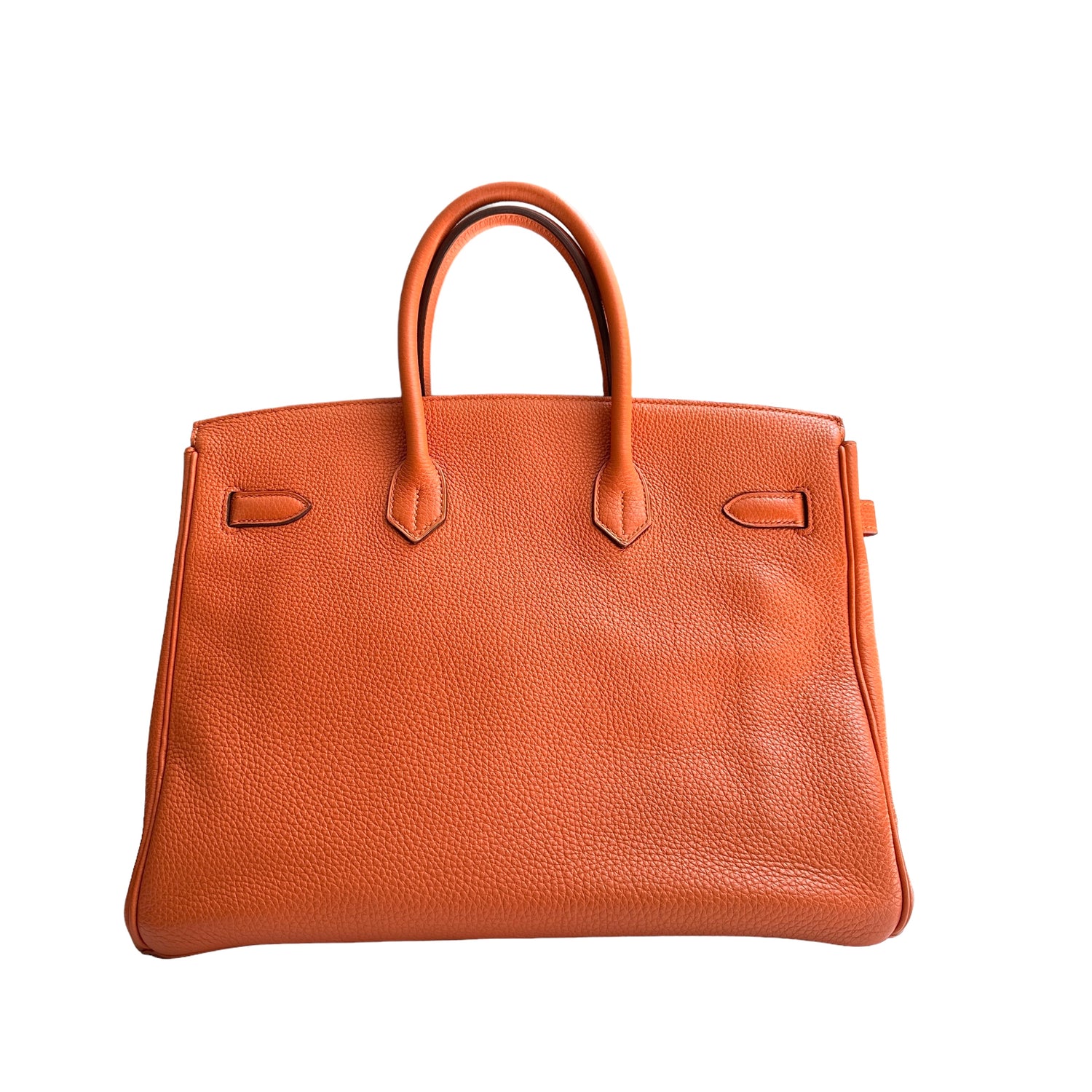 Hermes orange togo leather retourné Birkin bag. Size 35. Palladium hardware. Double rolled handles. Protective feet at base.