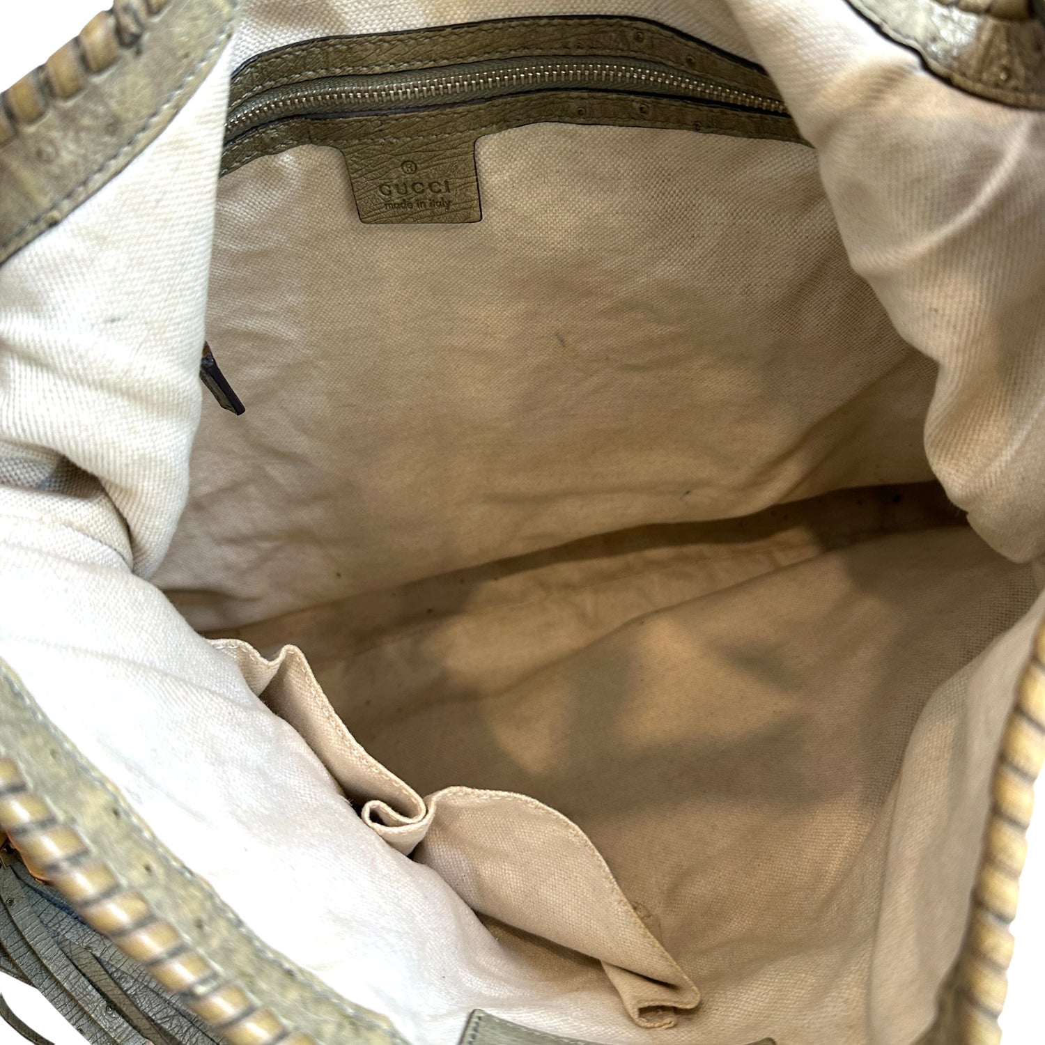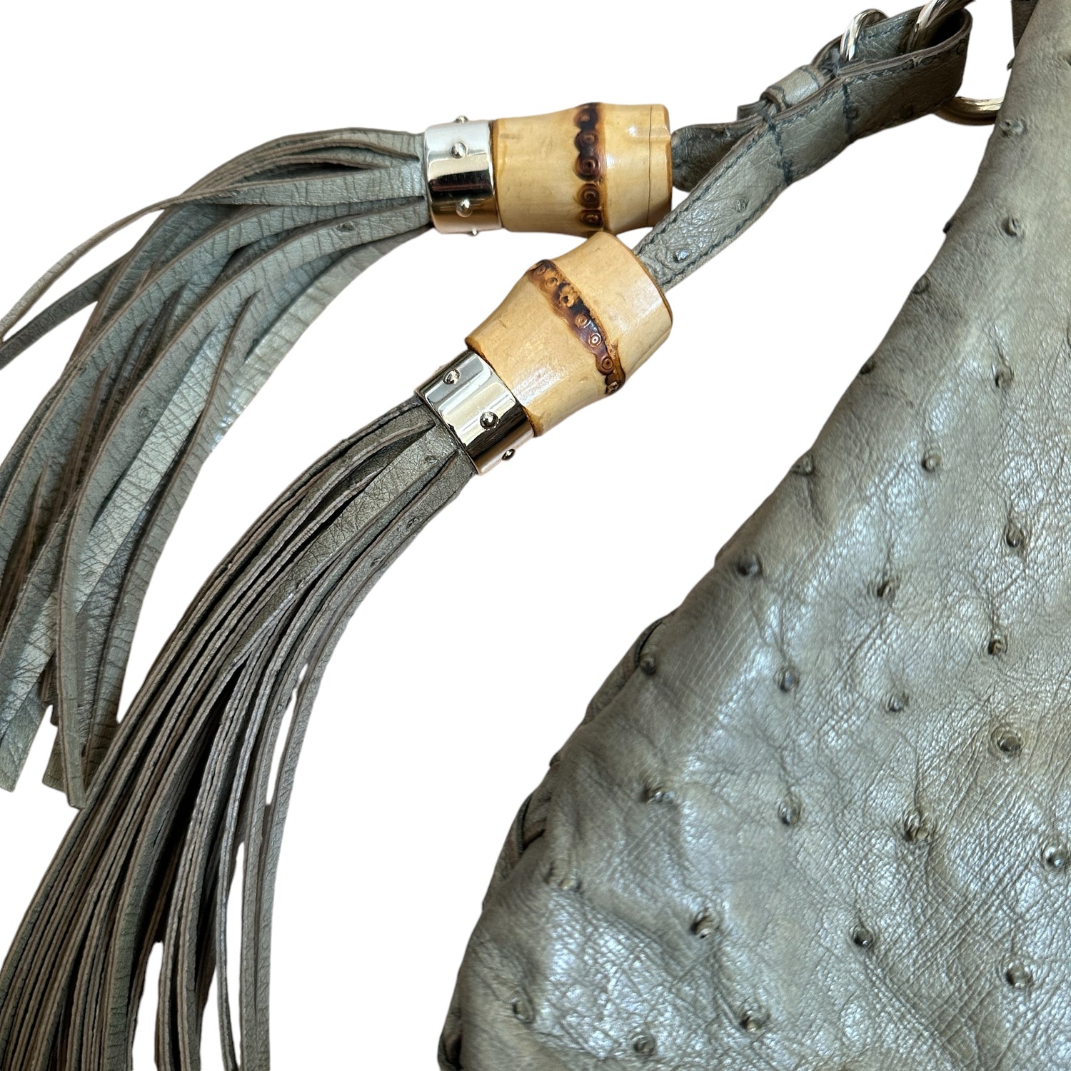 Gucci 2011 ostrich leather hobo bag. Bamboo details. Pom Pom tassels. Adjustable strap length. Removable crossbody strap. One interior zipper pocket. Beige cotton canvas interior.