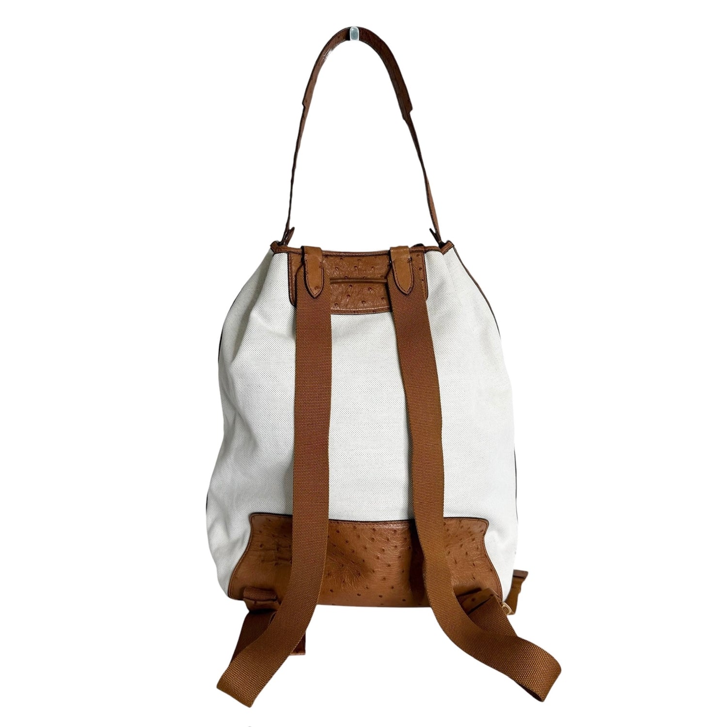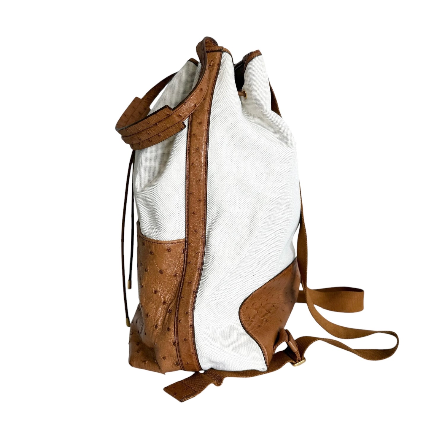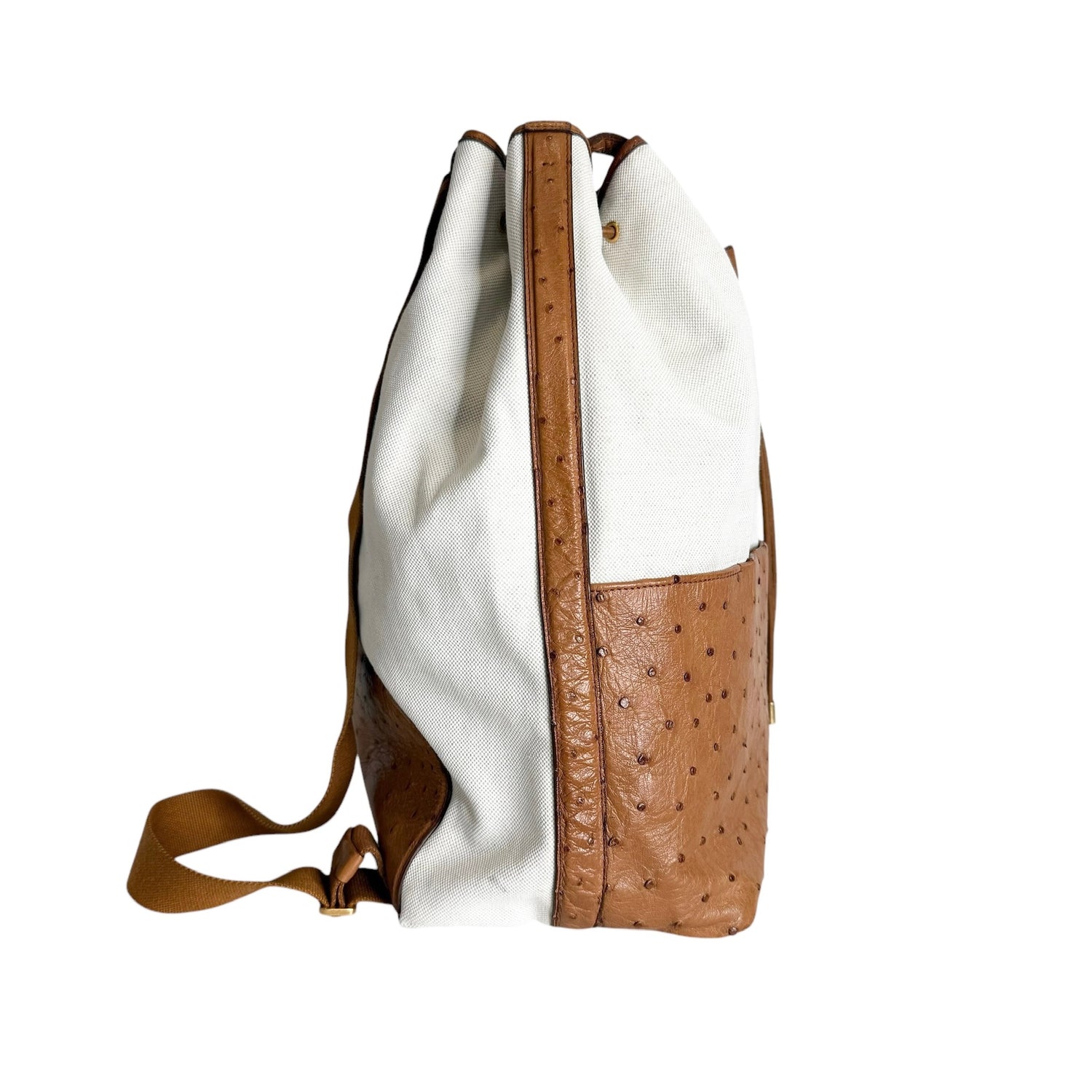 The Row backpack. Beige canvas. Brown Ostrich leather trims. Drawstring closure at top. Double brown canvas shoulder straps. One interior pocket. Two slit pockets at interior. Protective feet at base. Canvas lining.