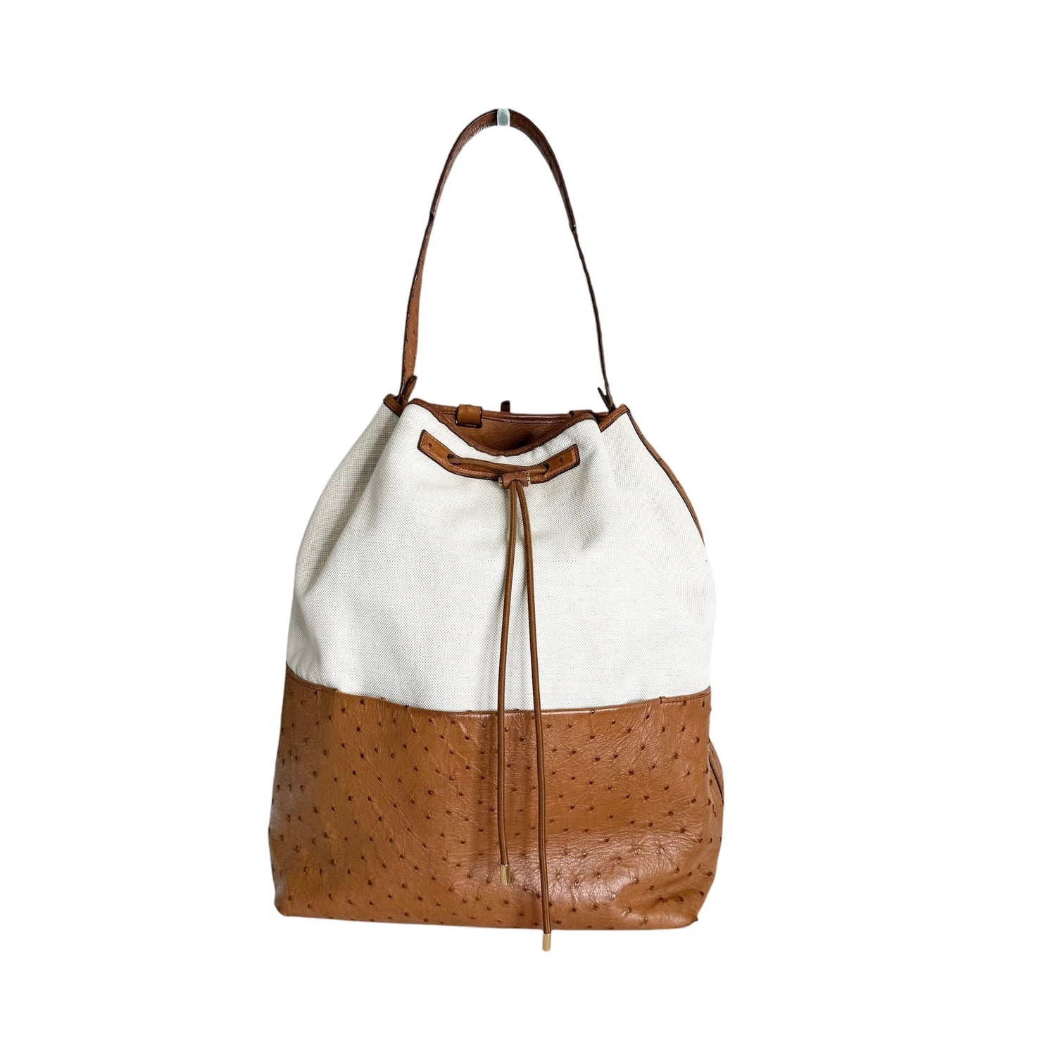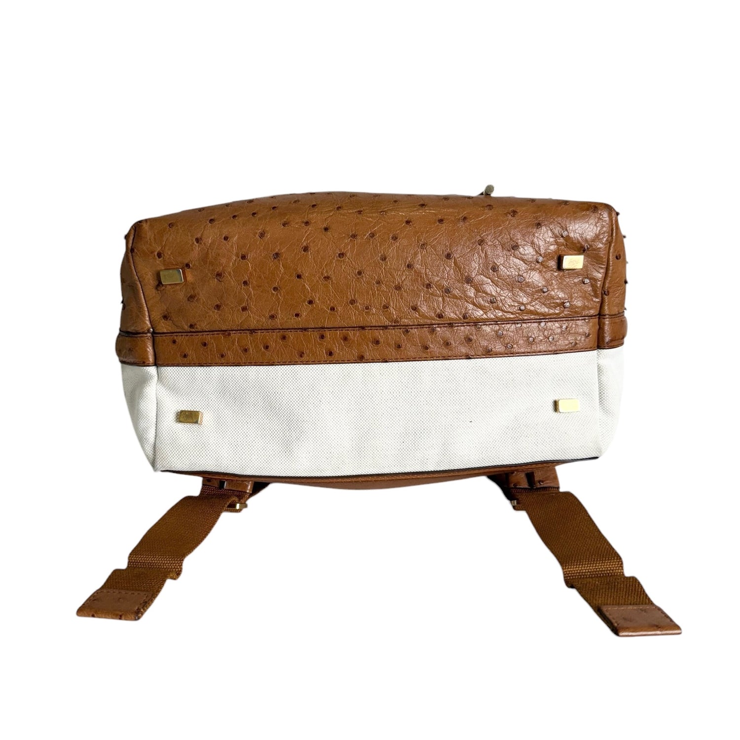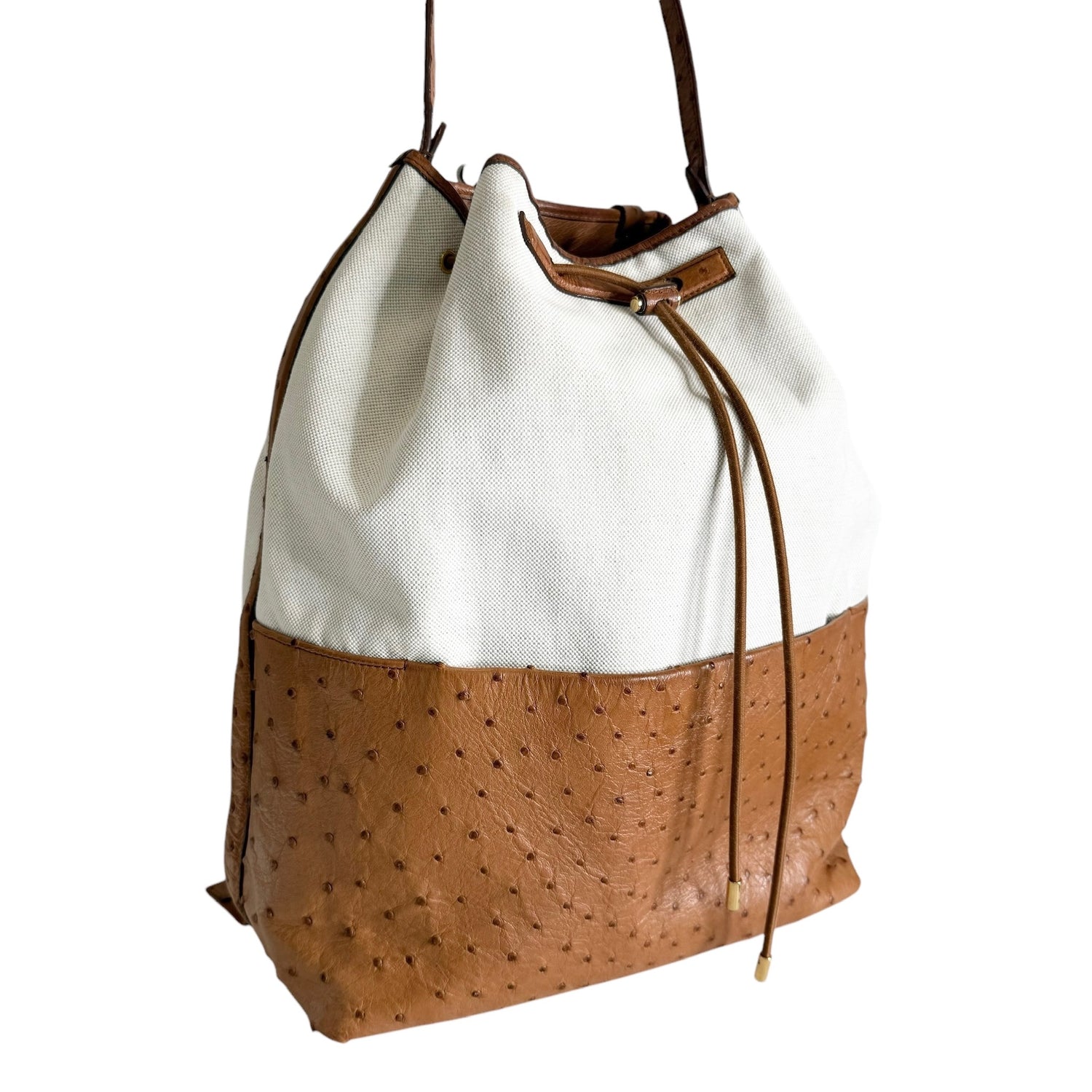 The Row backpack. Beige canvas. Brown Ostrich leather trims. Drawstring closure at top. Double brown canvas shoulder straps. One interior pocket. Two slit pockets at interior. Protective feet at base. Canvas lining.