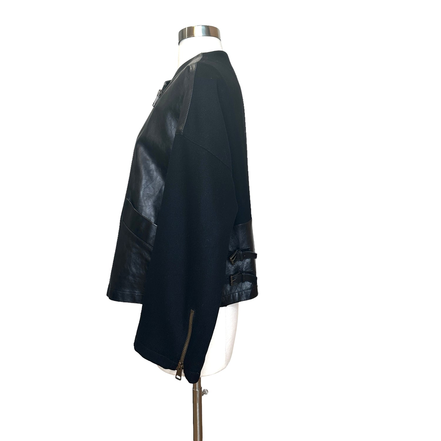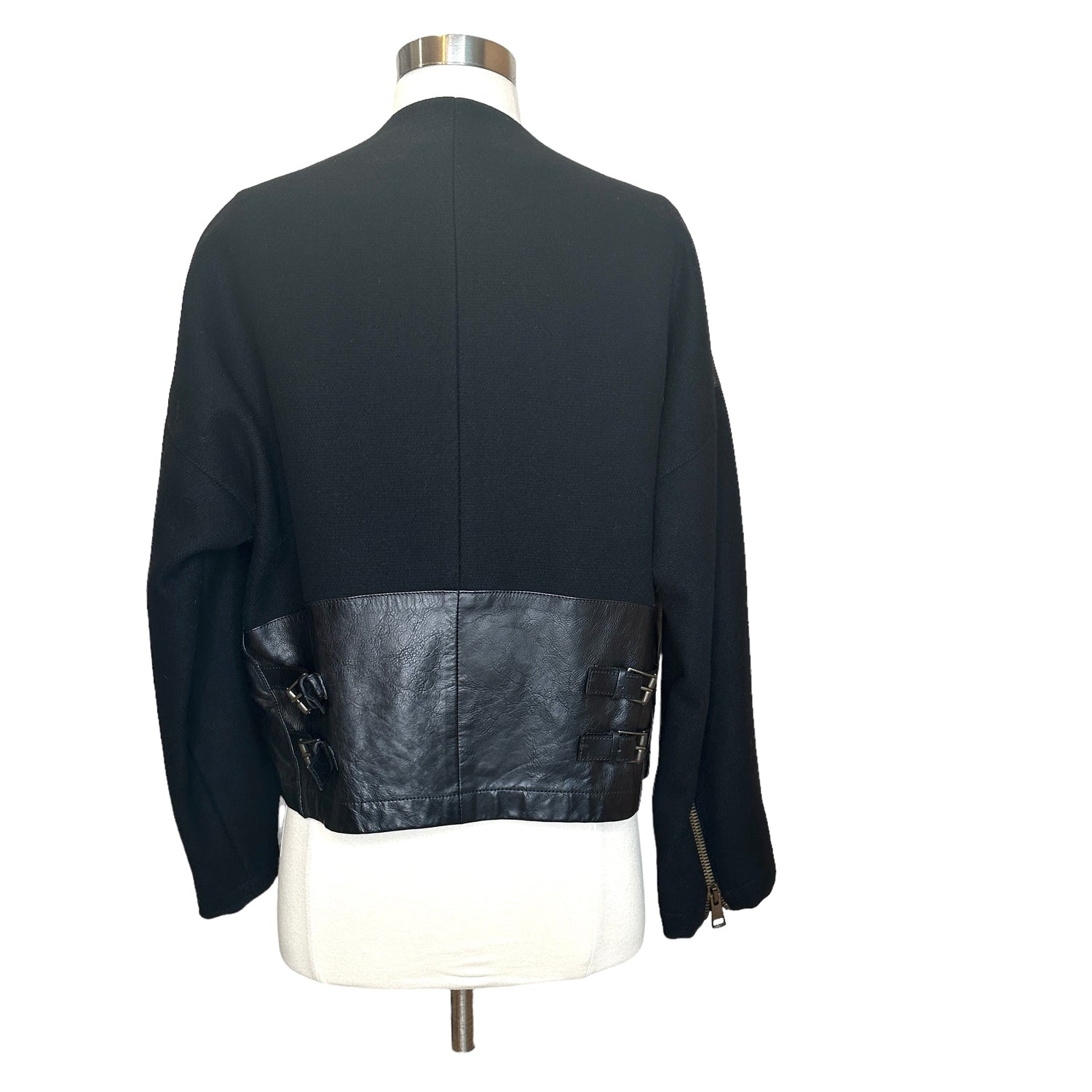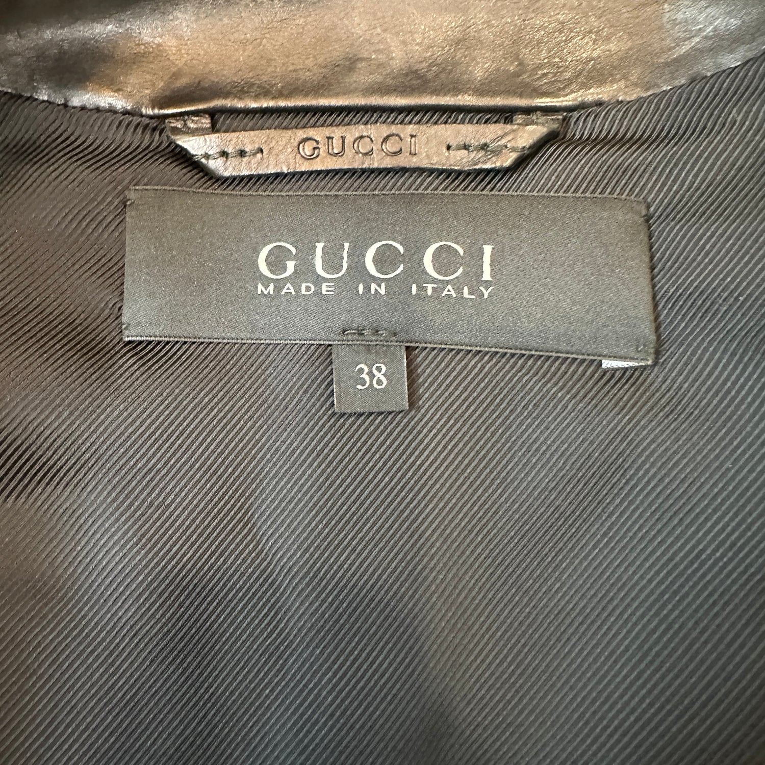 Gucci leather oversized jacket. Collection by Tom Ford. Black smooth leather front panel with black wool back and sleeves. Drop shoulders. Collarless. Large slit pockets. Zipper closure at front. Zippers at sleeves. Zipper at sleeves. Designer size 38.
