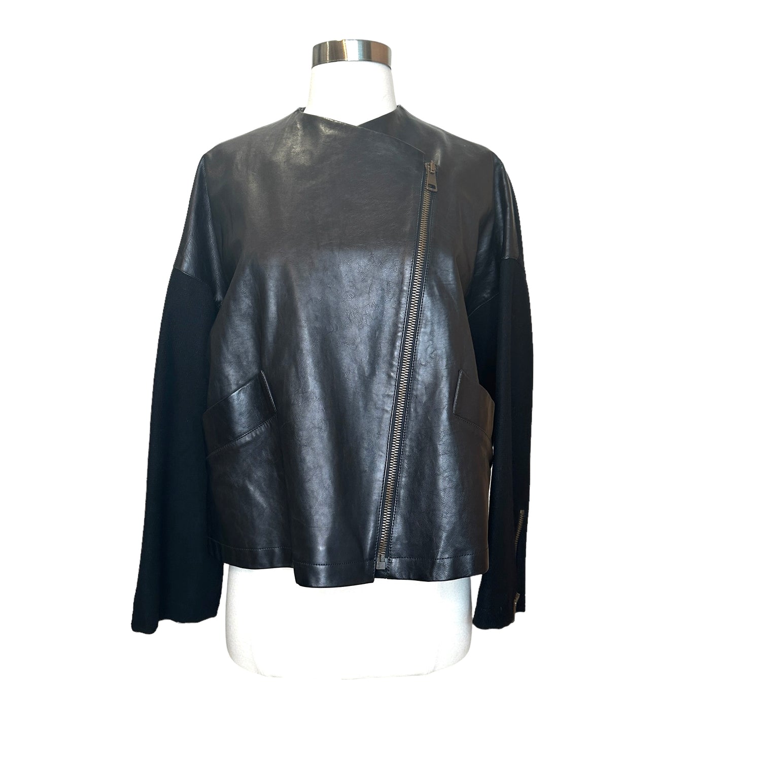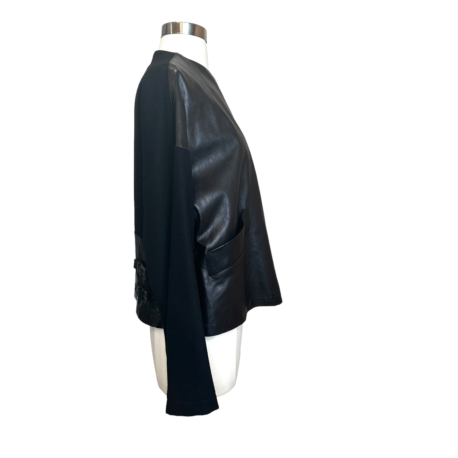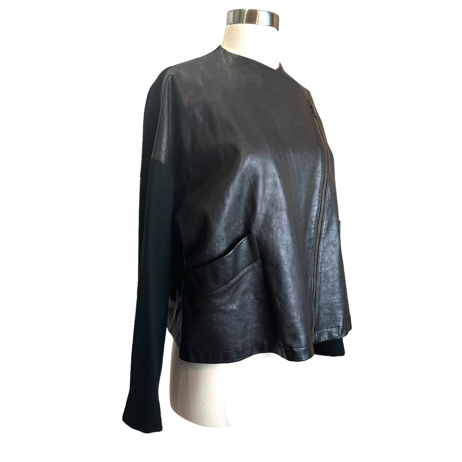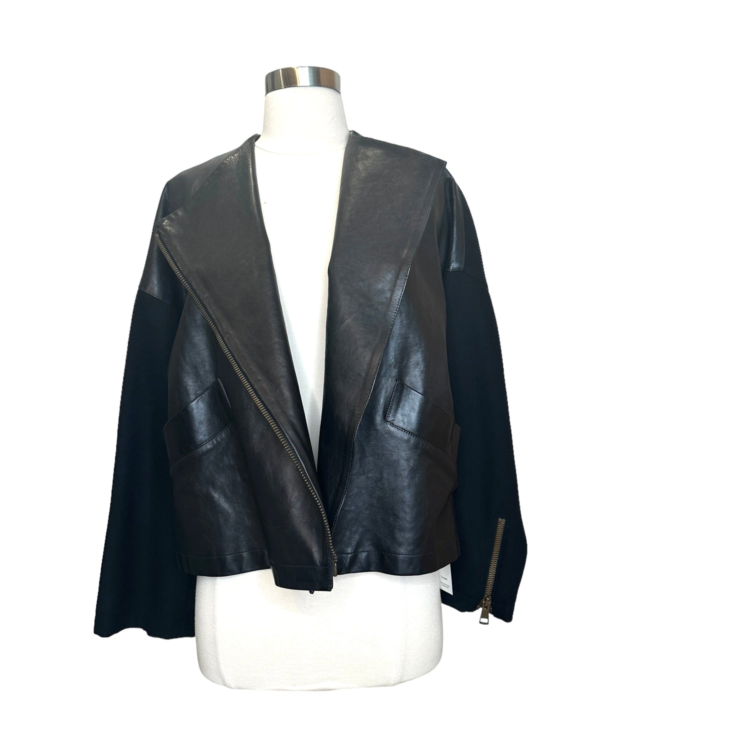 Gucci leather oversized jacket. Collection by Tom Ford. Black smooth leather front panel with black wool back and sleeves. Drop shoulders. Collarless. Large slit pockets. Zipper closure at front. Zippers at sleeves. Zipper at sleeves. Designer size 38.