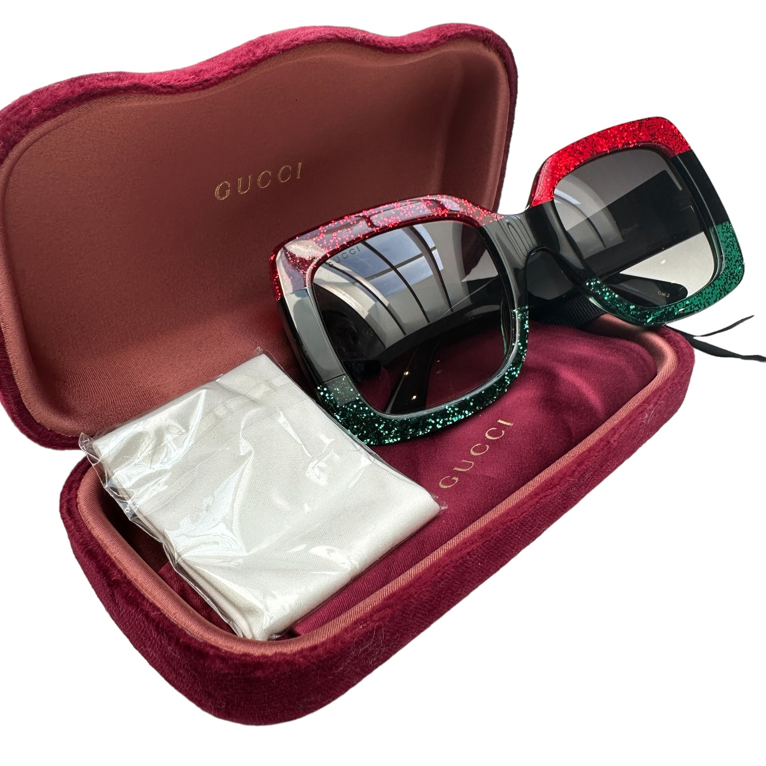 Gucci oversized square sunglasses. Iconic red and green Gucci colors with sparkles. Acetate frame. GG gold-tone logos at sides. Bee logo at branches.