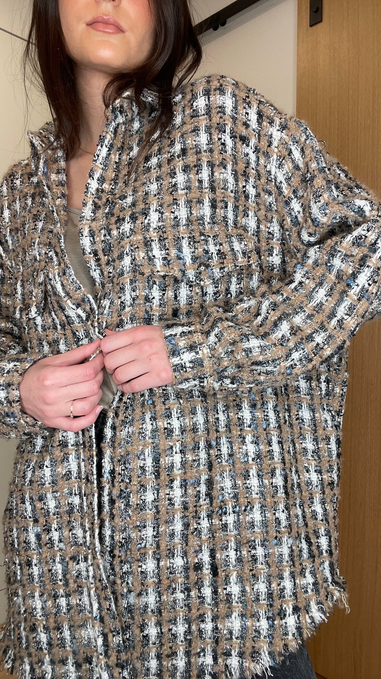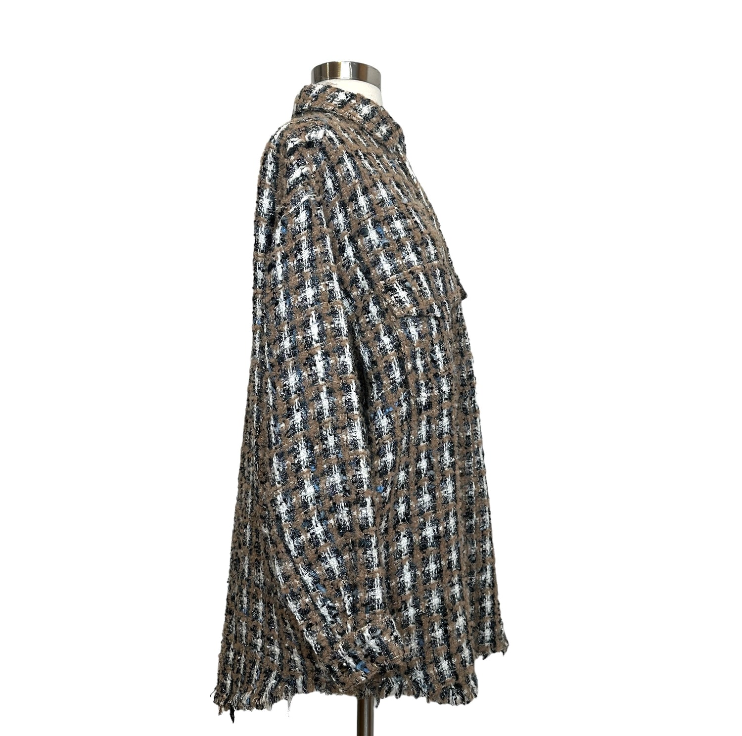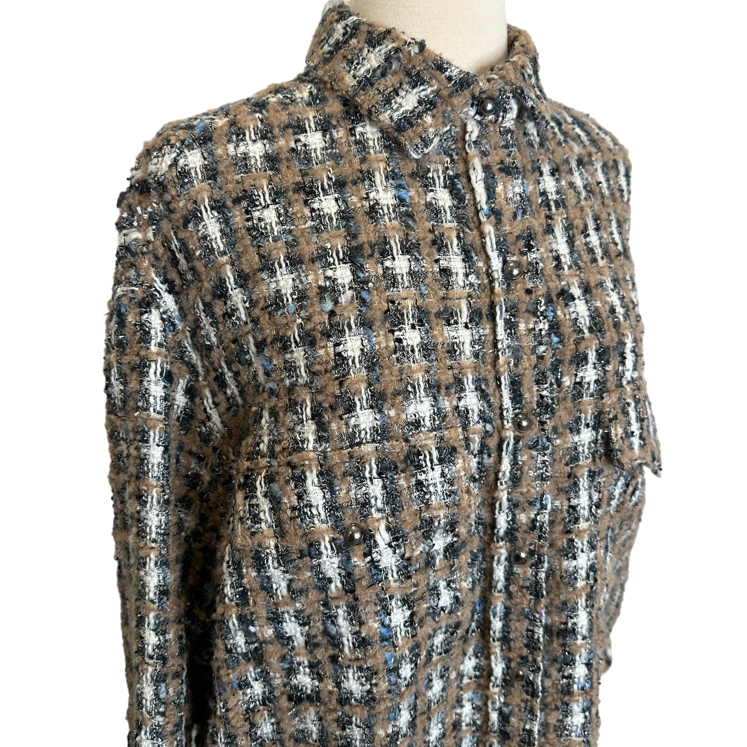 Iro Jacket. Black, camel and cream color tweed. Oversized. Pointed collar. Lightweight and great for layering. Snap button closure at front. Flap pockets. Designer 36.
