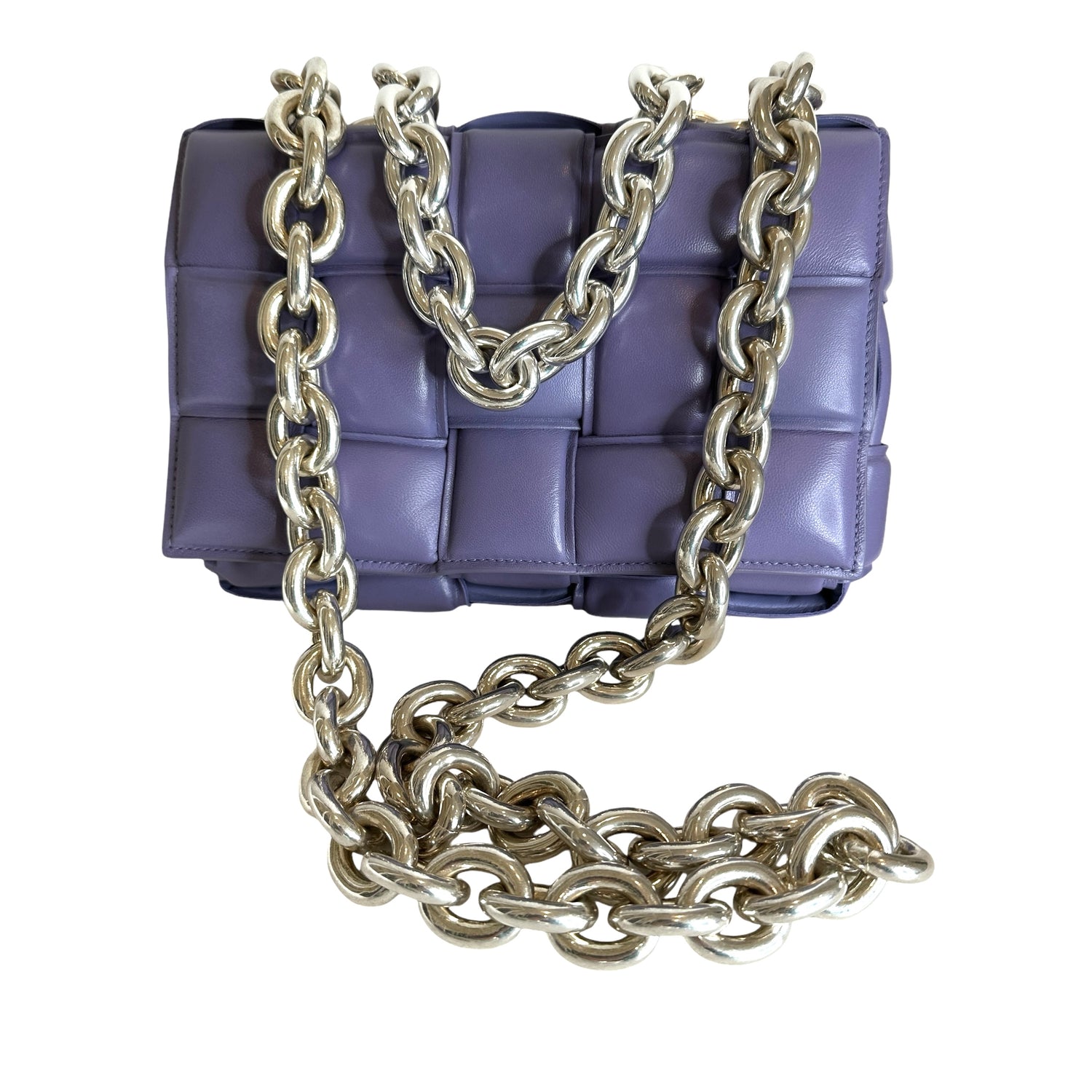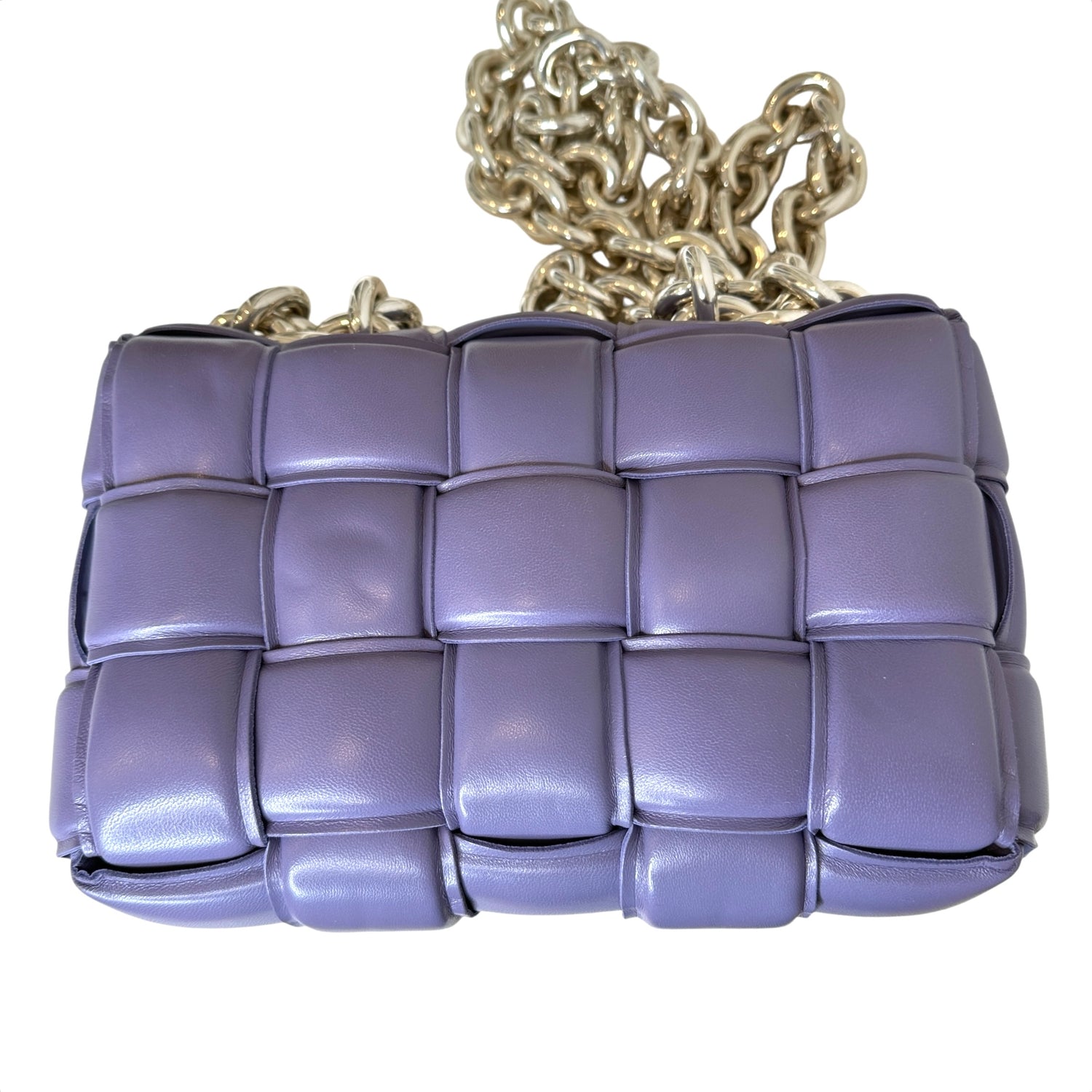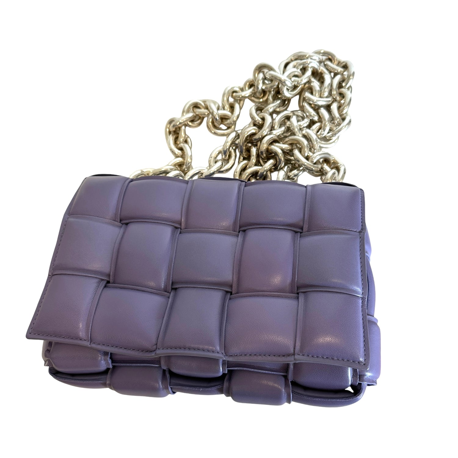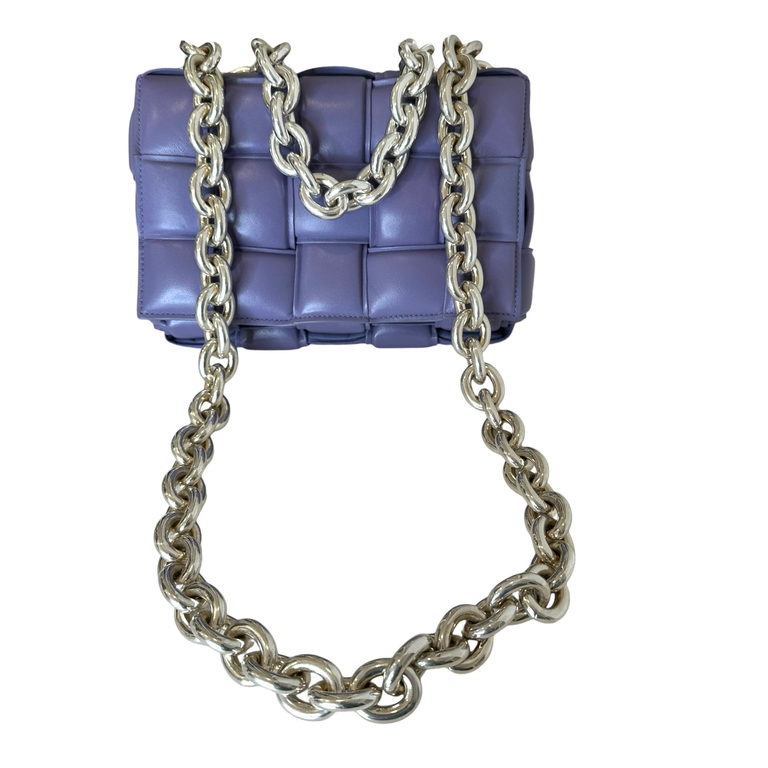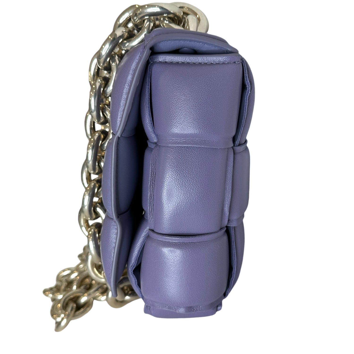 Bottega Veneta padded cassette bag with chain. Lilac leather with silver-tone chunky chain.