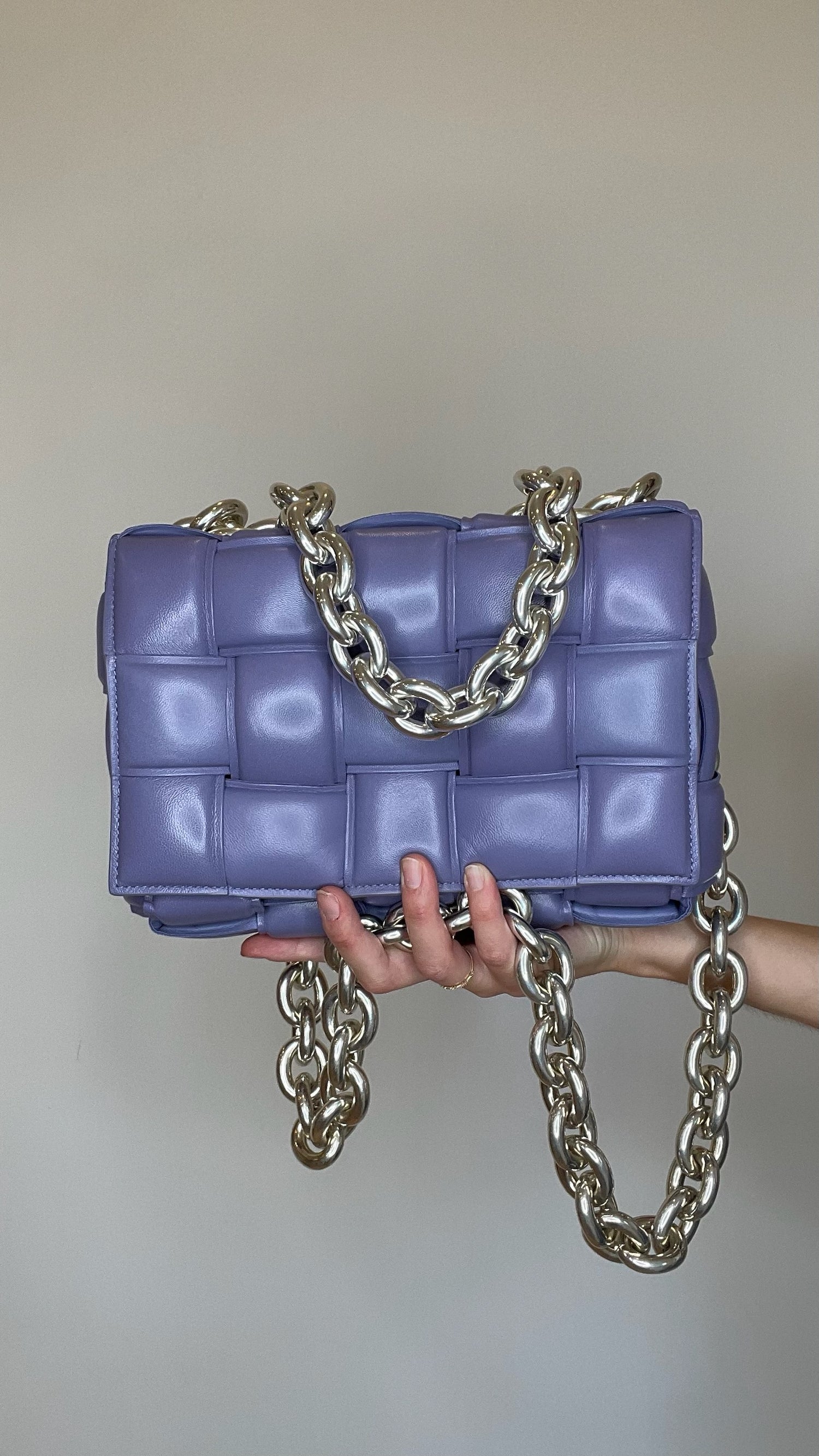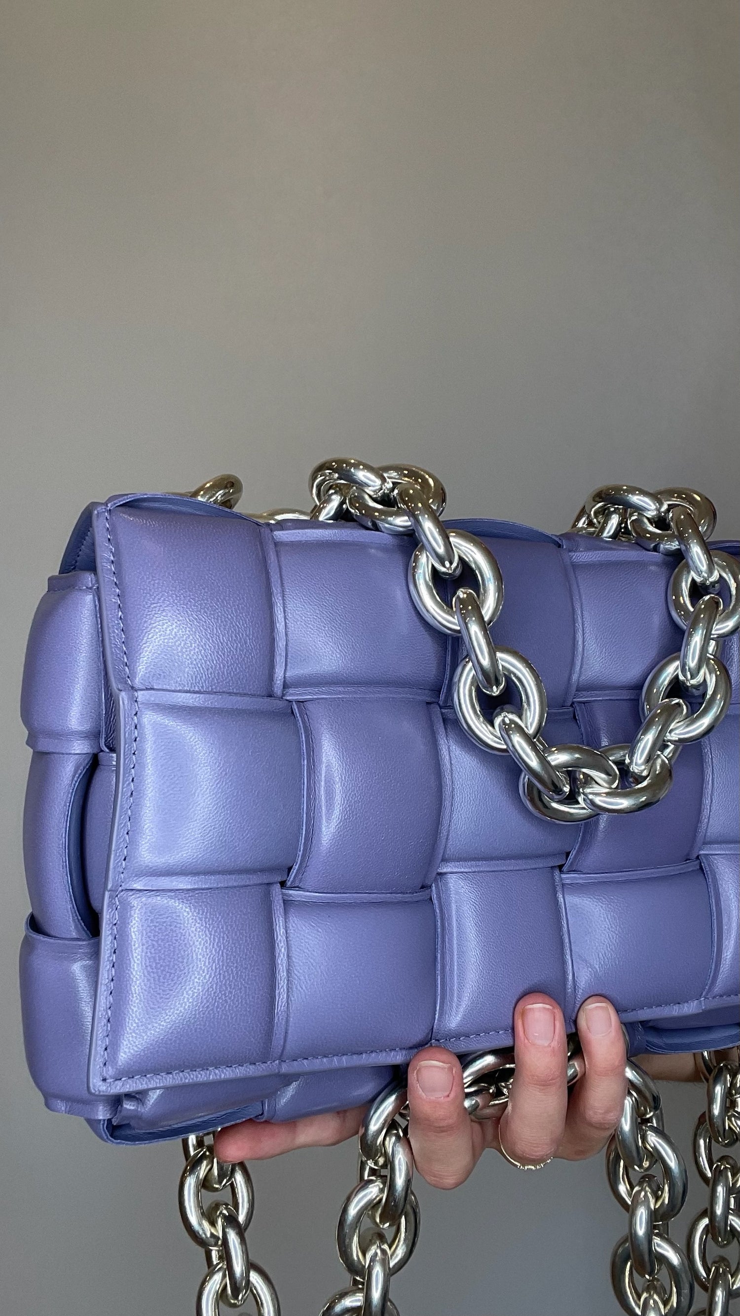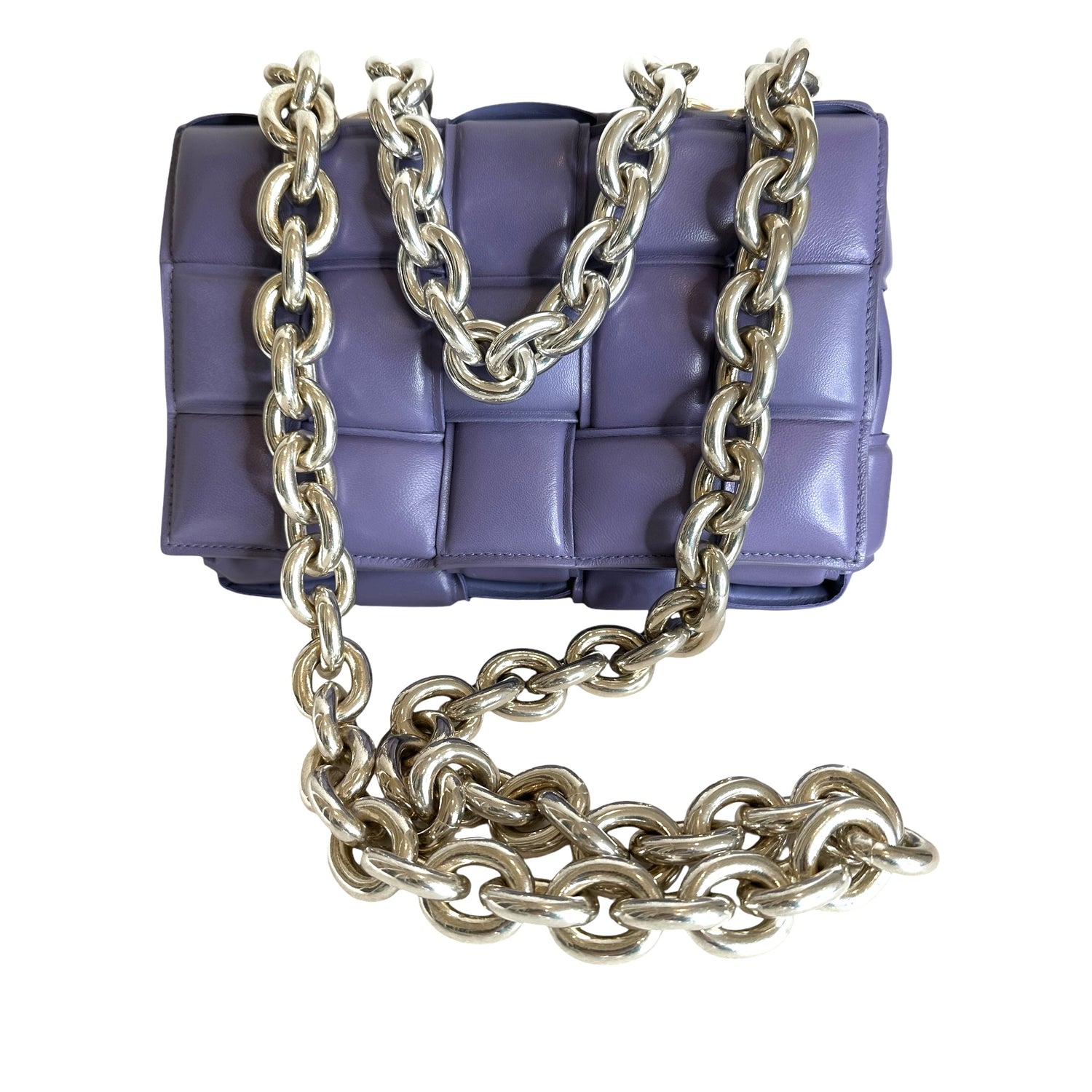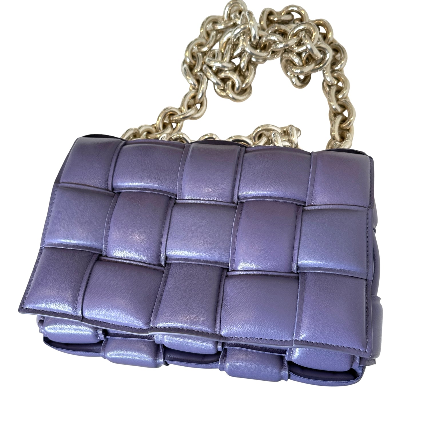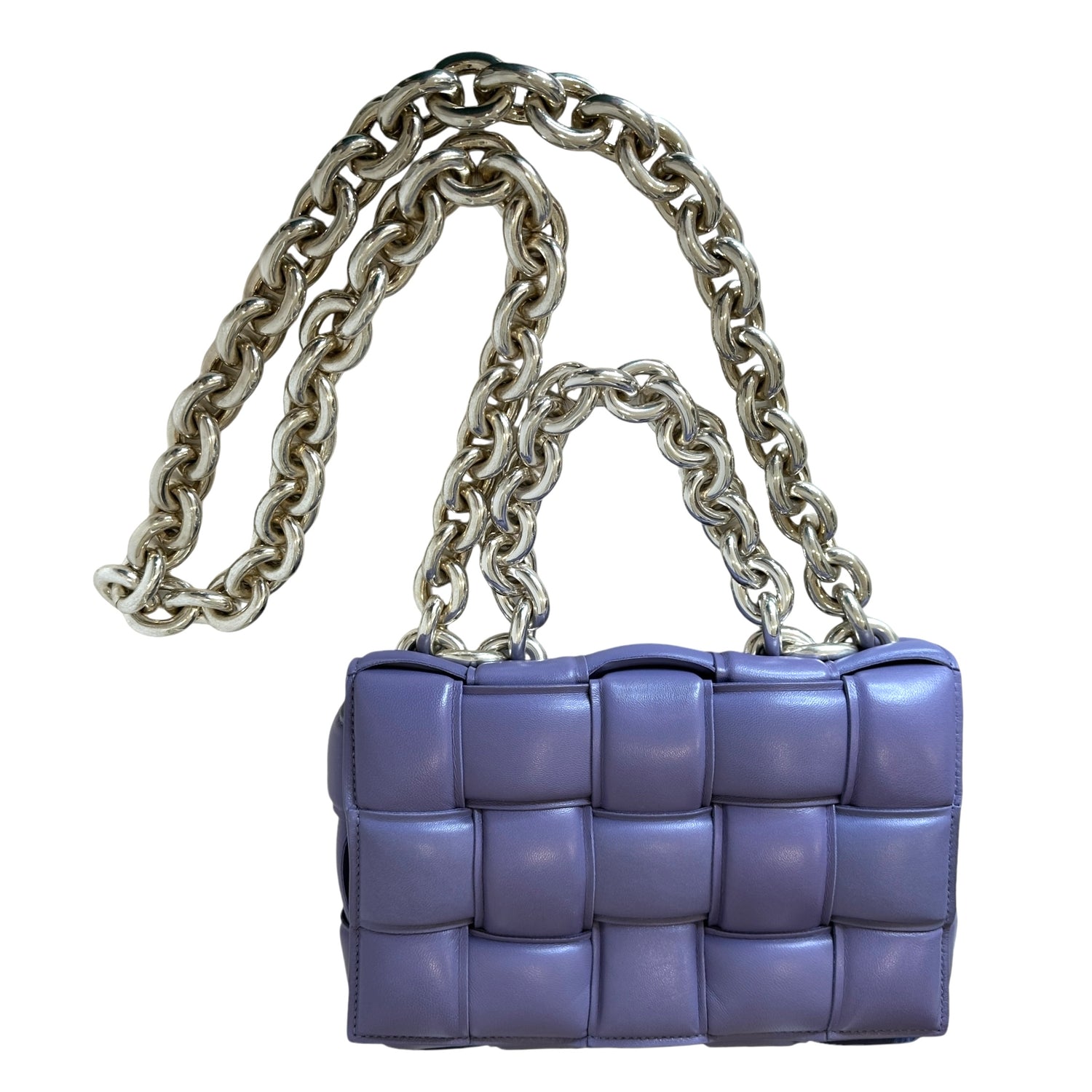 Bottega Veneta padded cassette bag with chain. Lilac leather with silver-tone chunky chain.