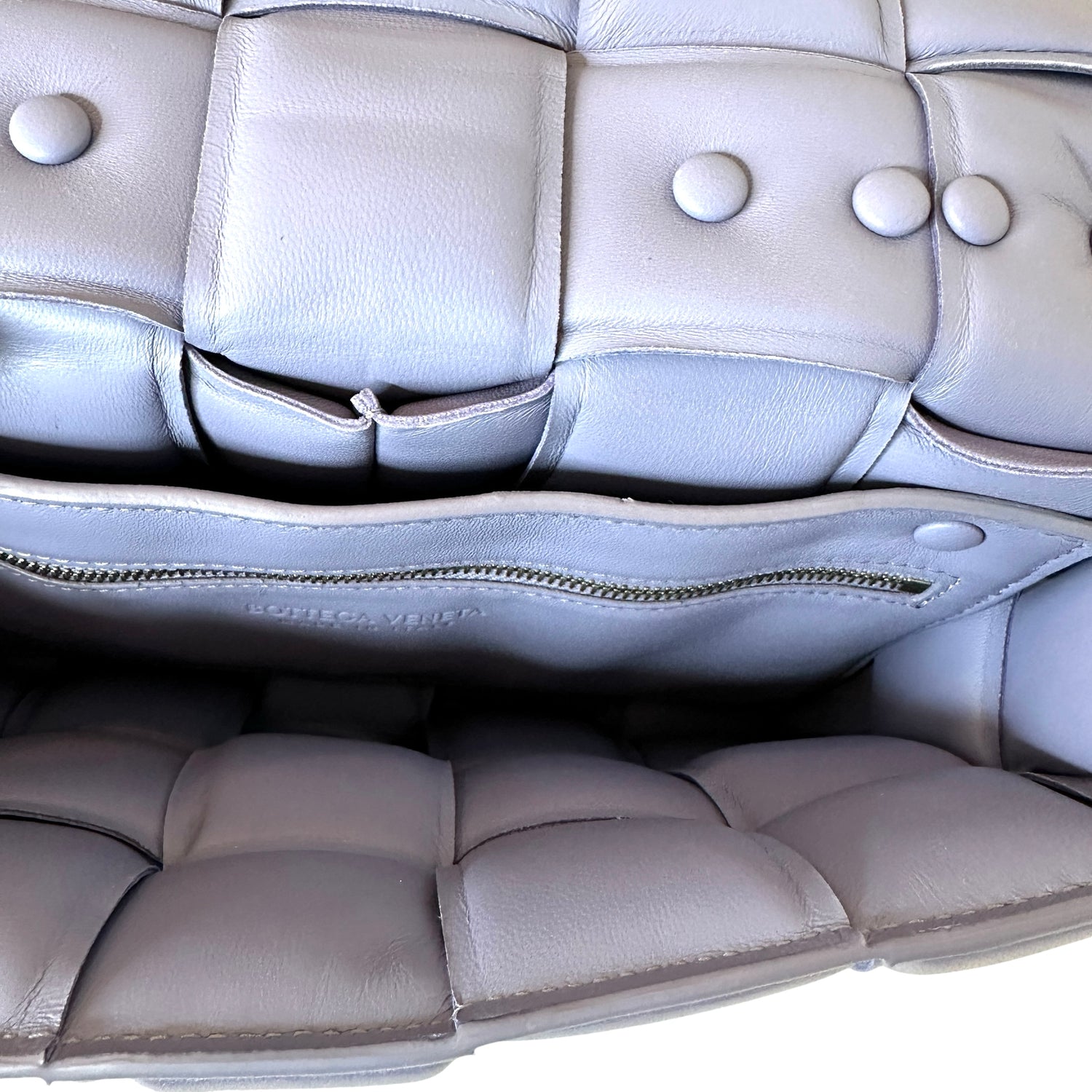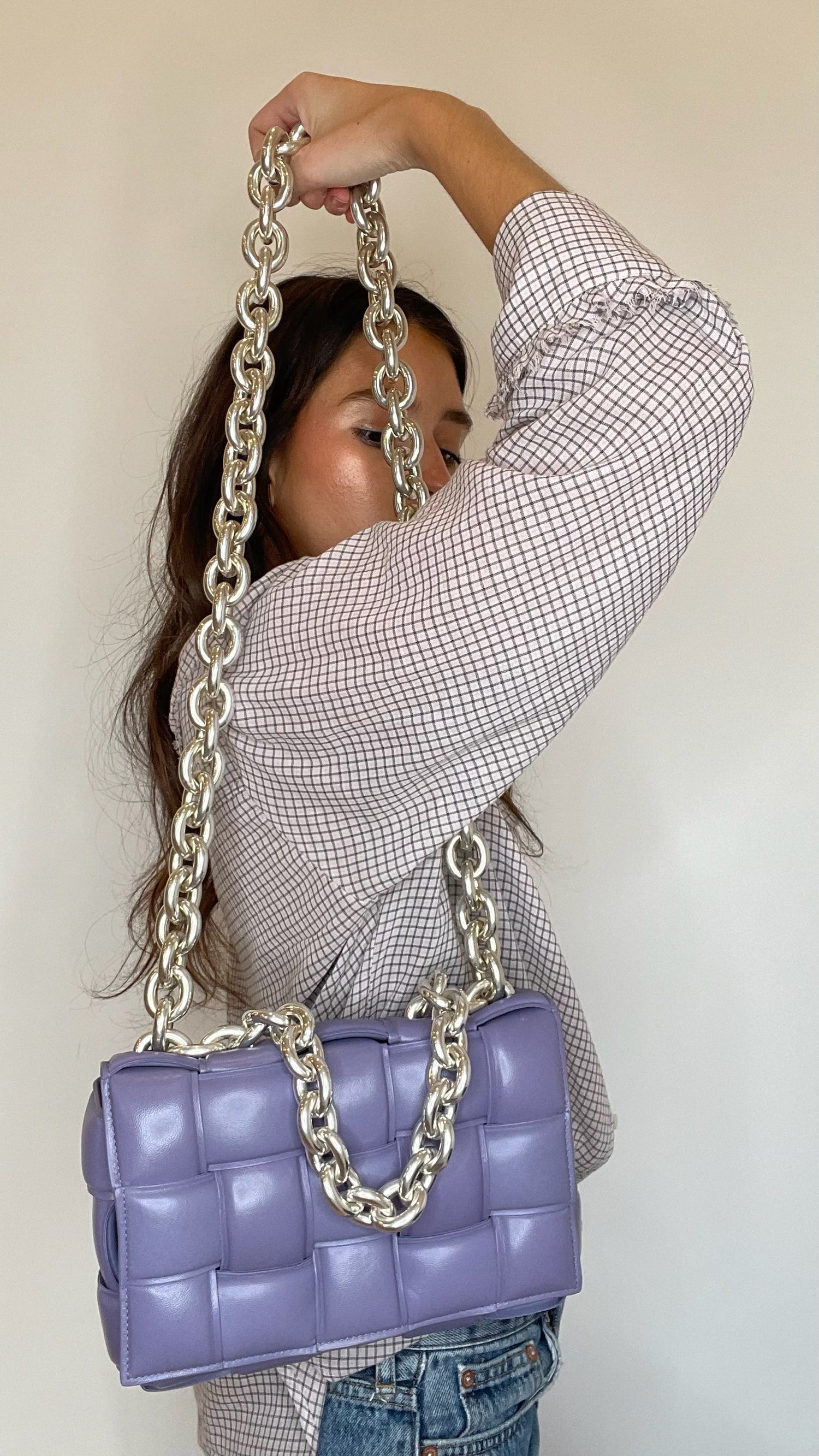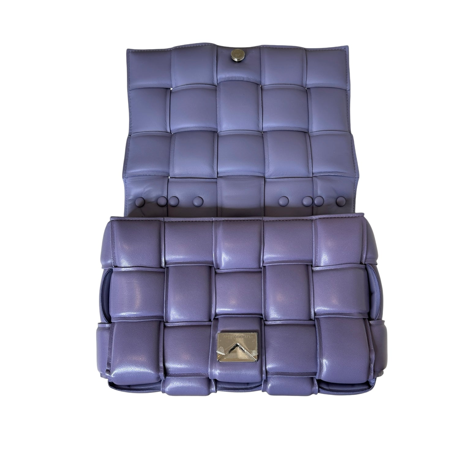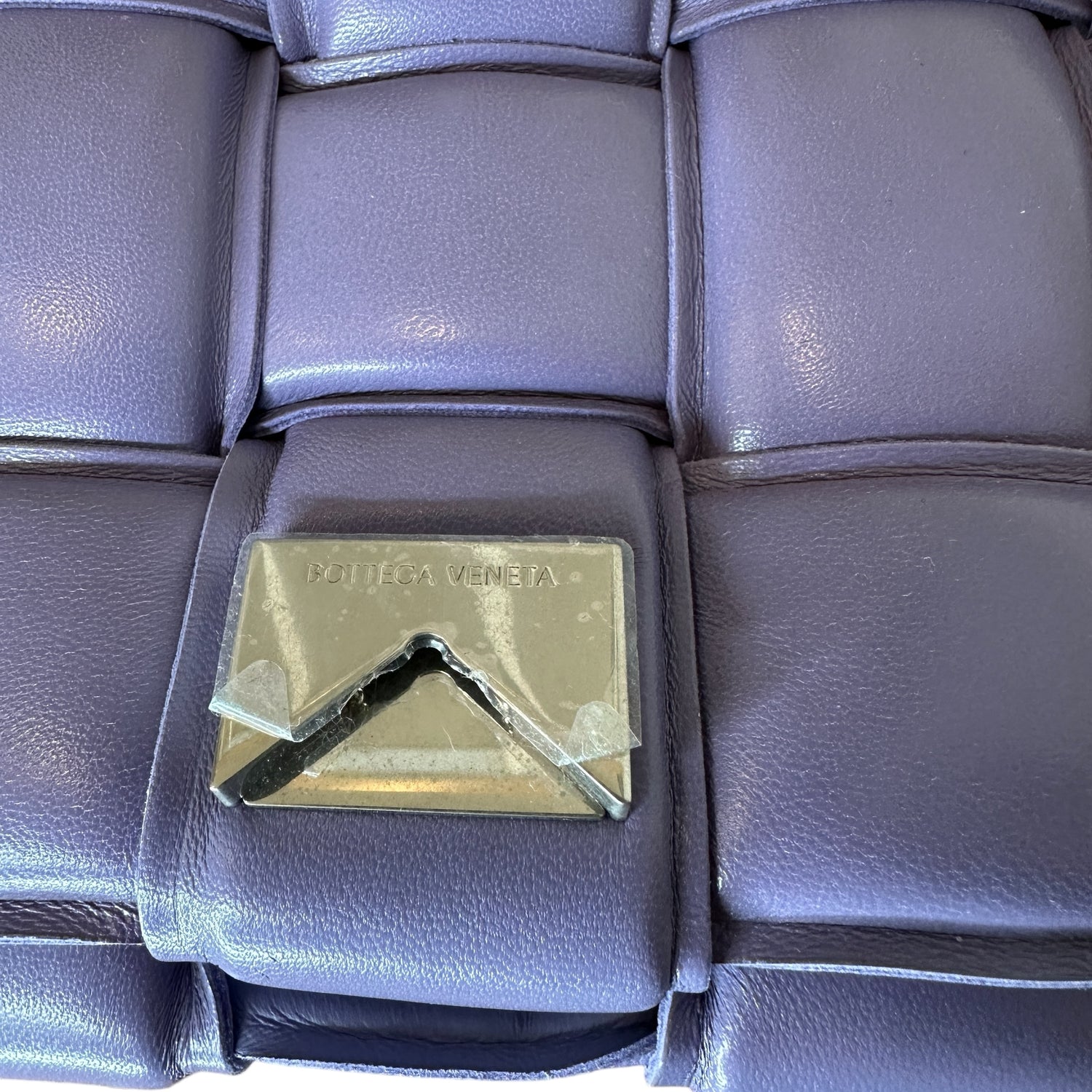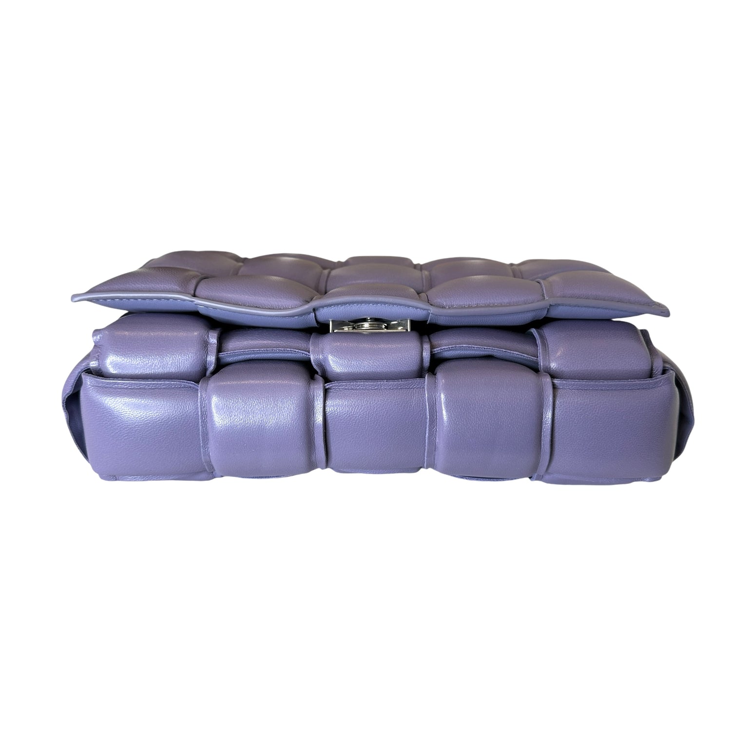 Bottega Veneta padded cassette bag with chain. Lilac leather with silver-tone chunky chain.