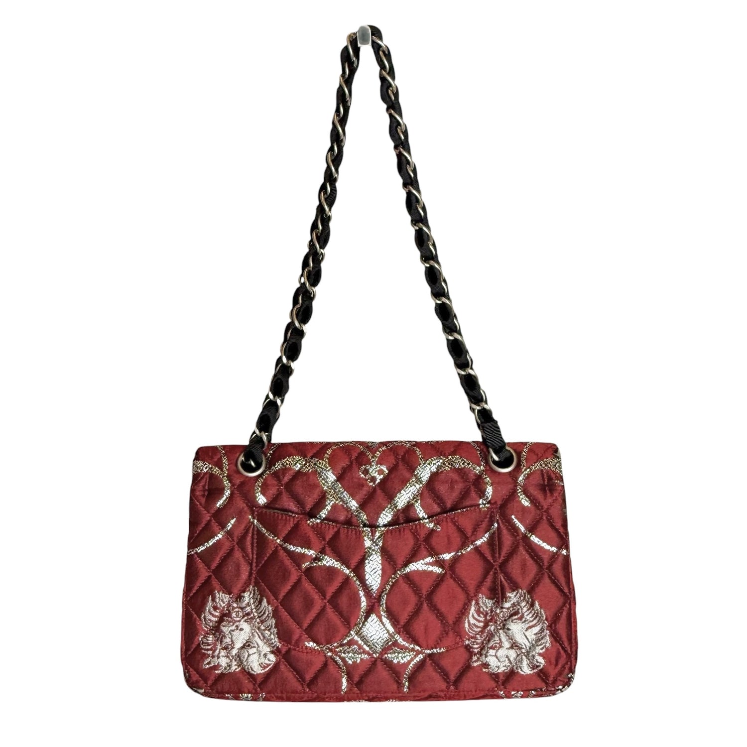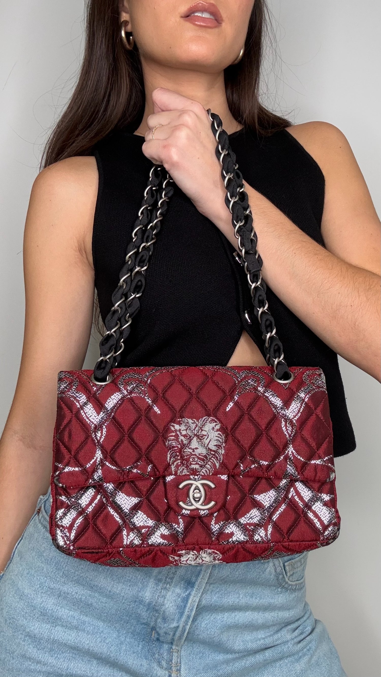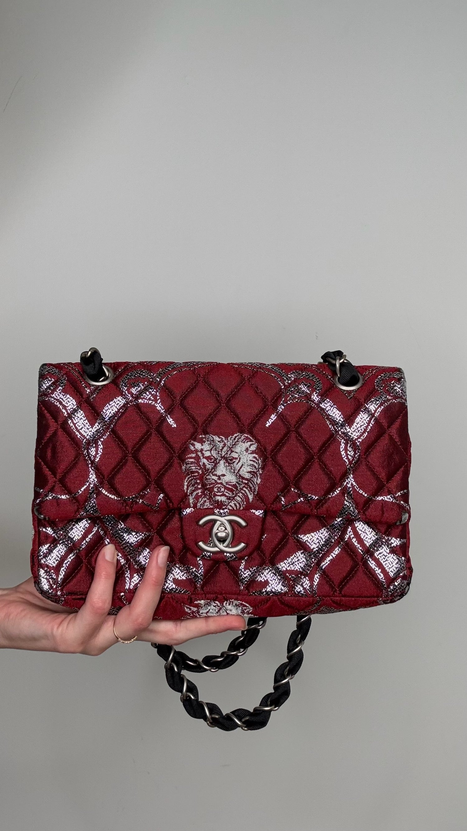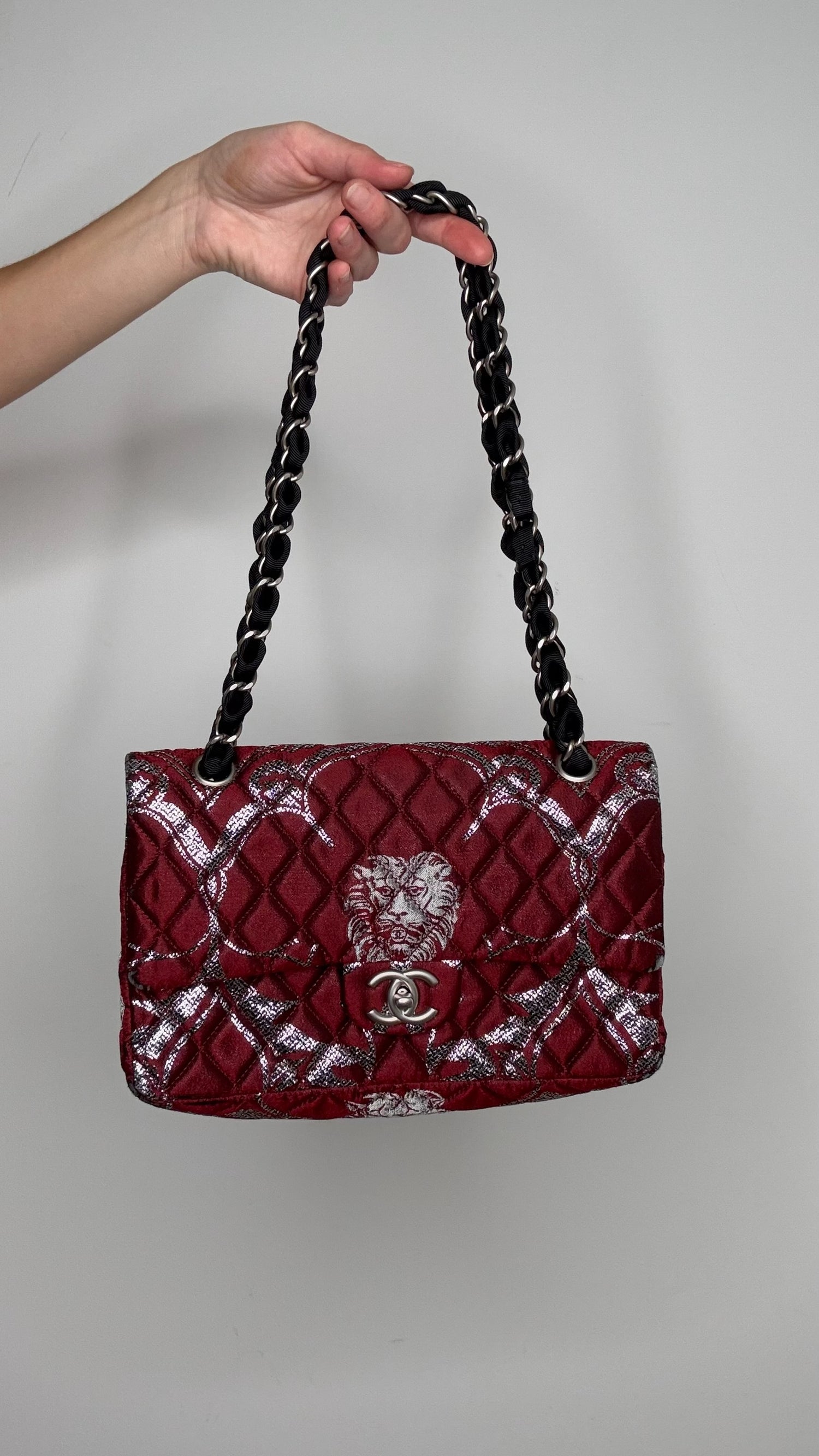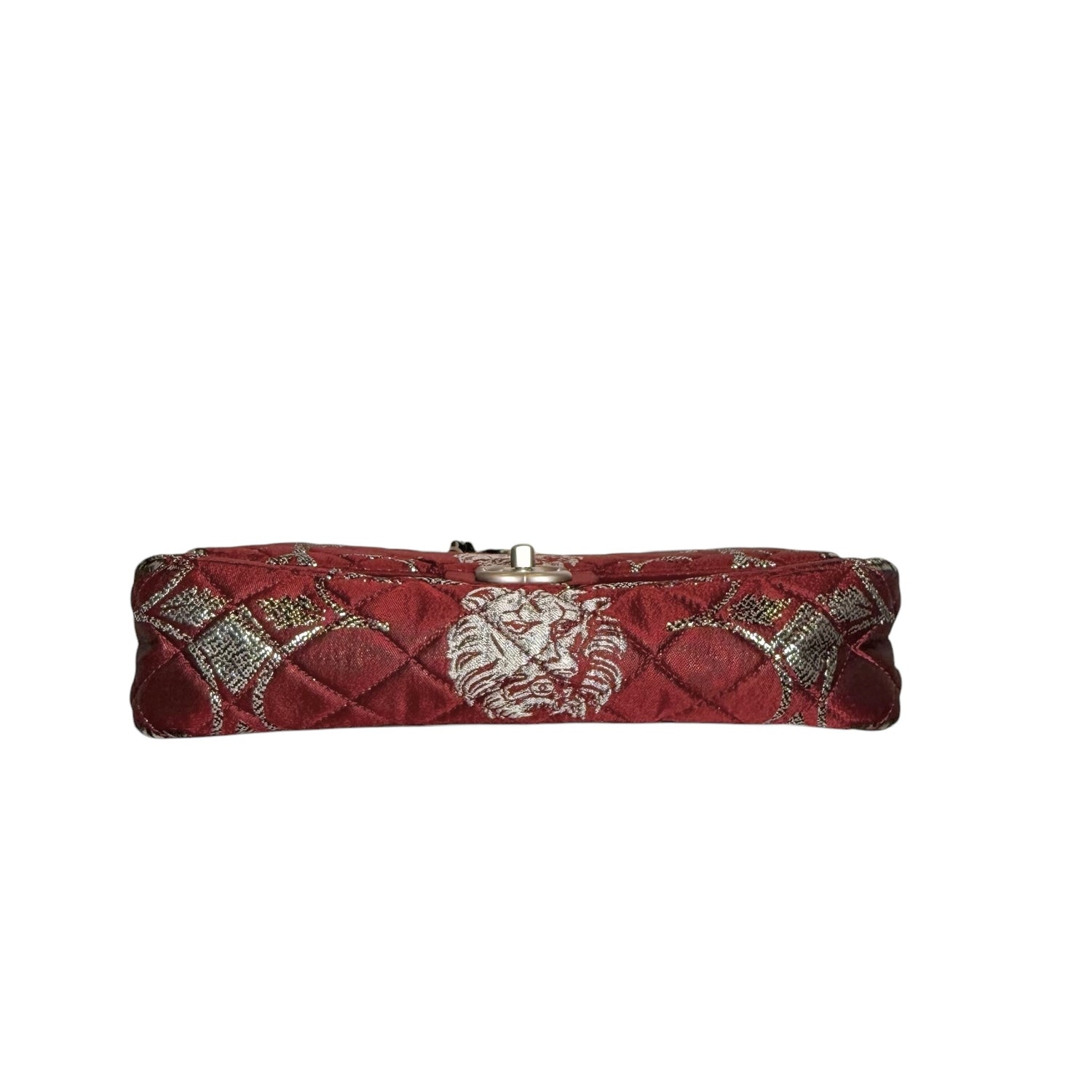 Chanel 2009 Paris Moscow brocade flap bag. Brushed silver hardware. Burgundy and silver canvas with lion and CC logo print. Red lambskin lining. Grosgrain straps.