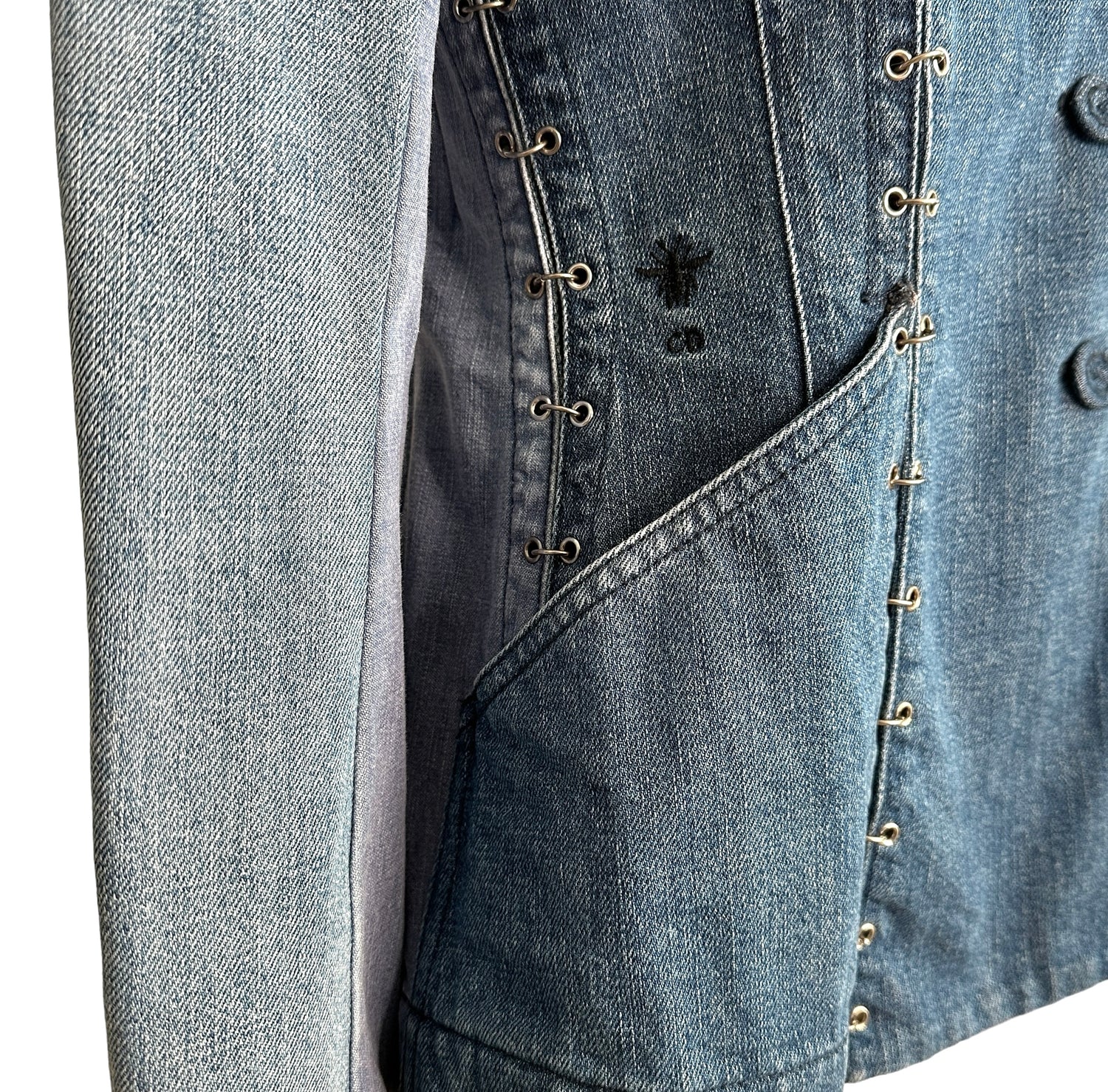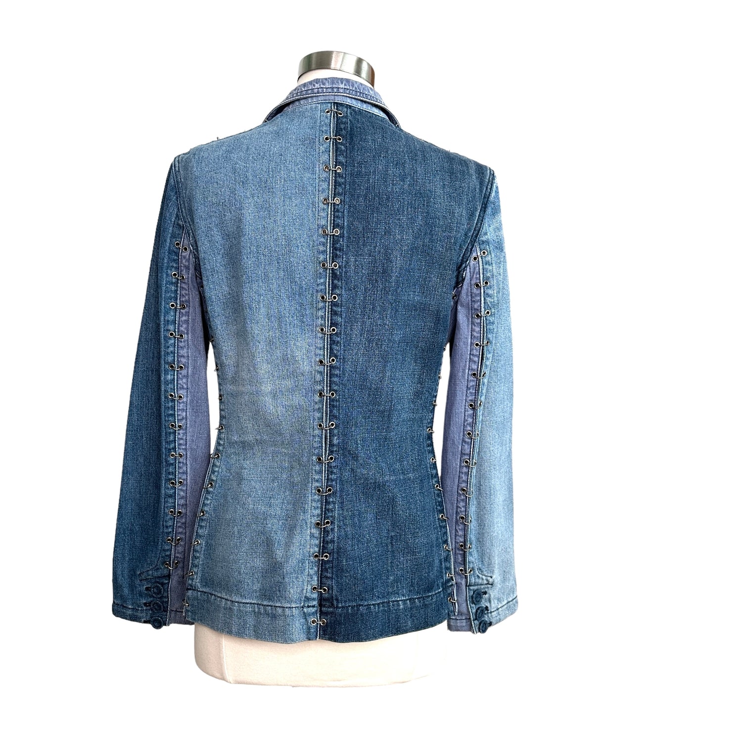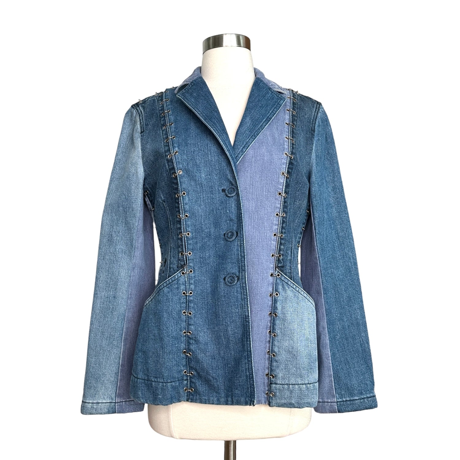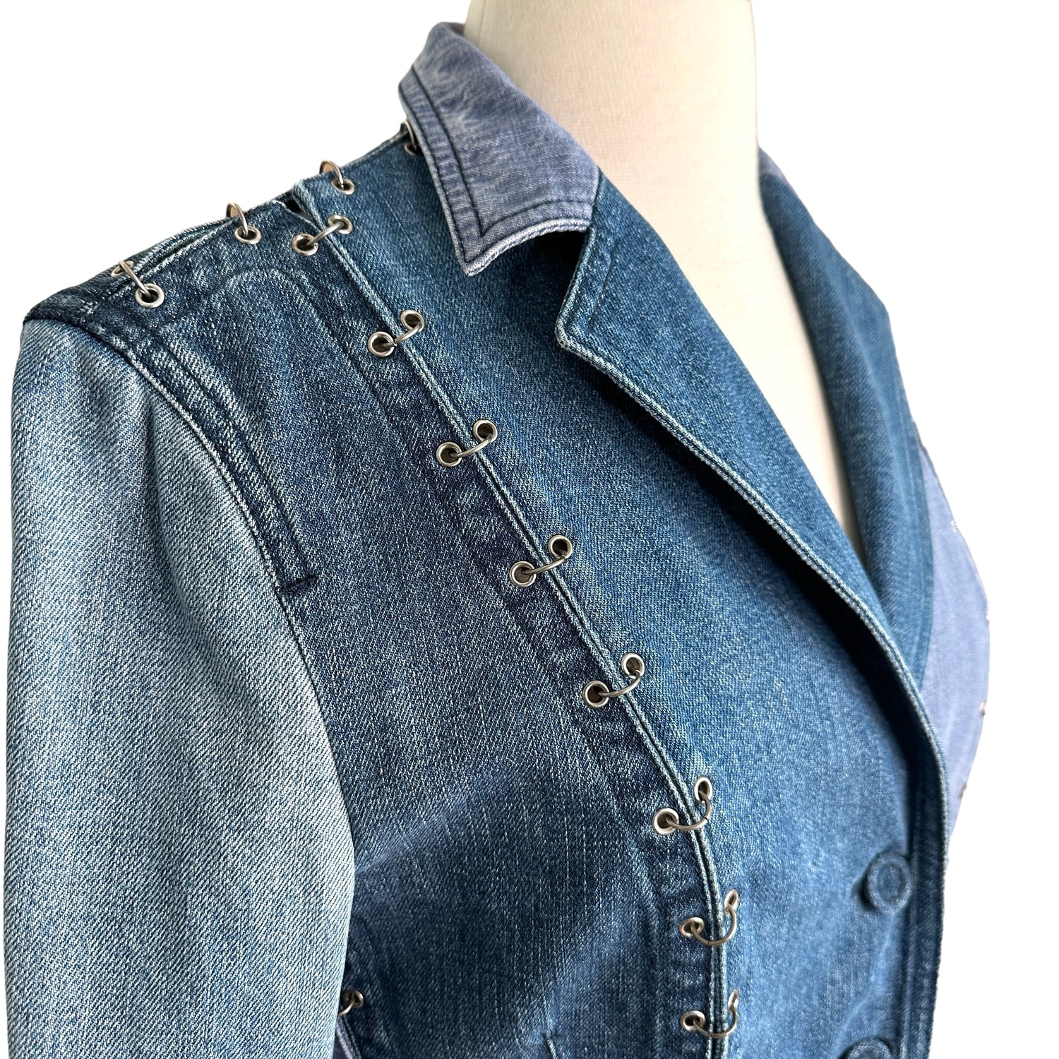 Christian Dior patchwork denim Jacket. Silver-tone eyelet throughout. Pointed collar. Patch pockets. Button closure at front.