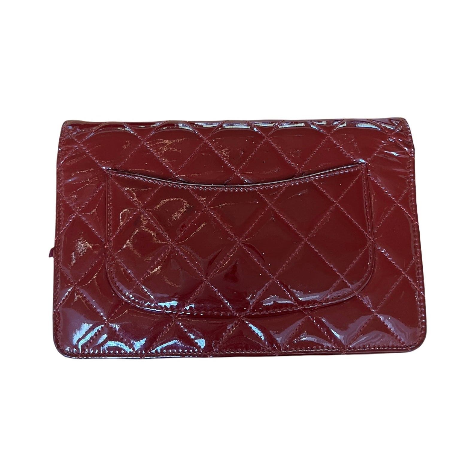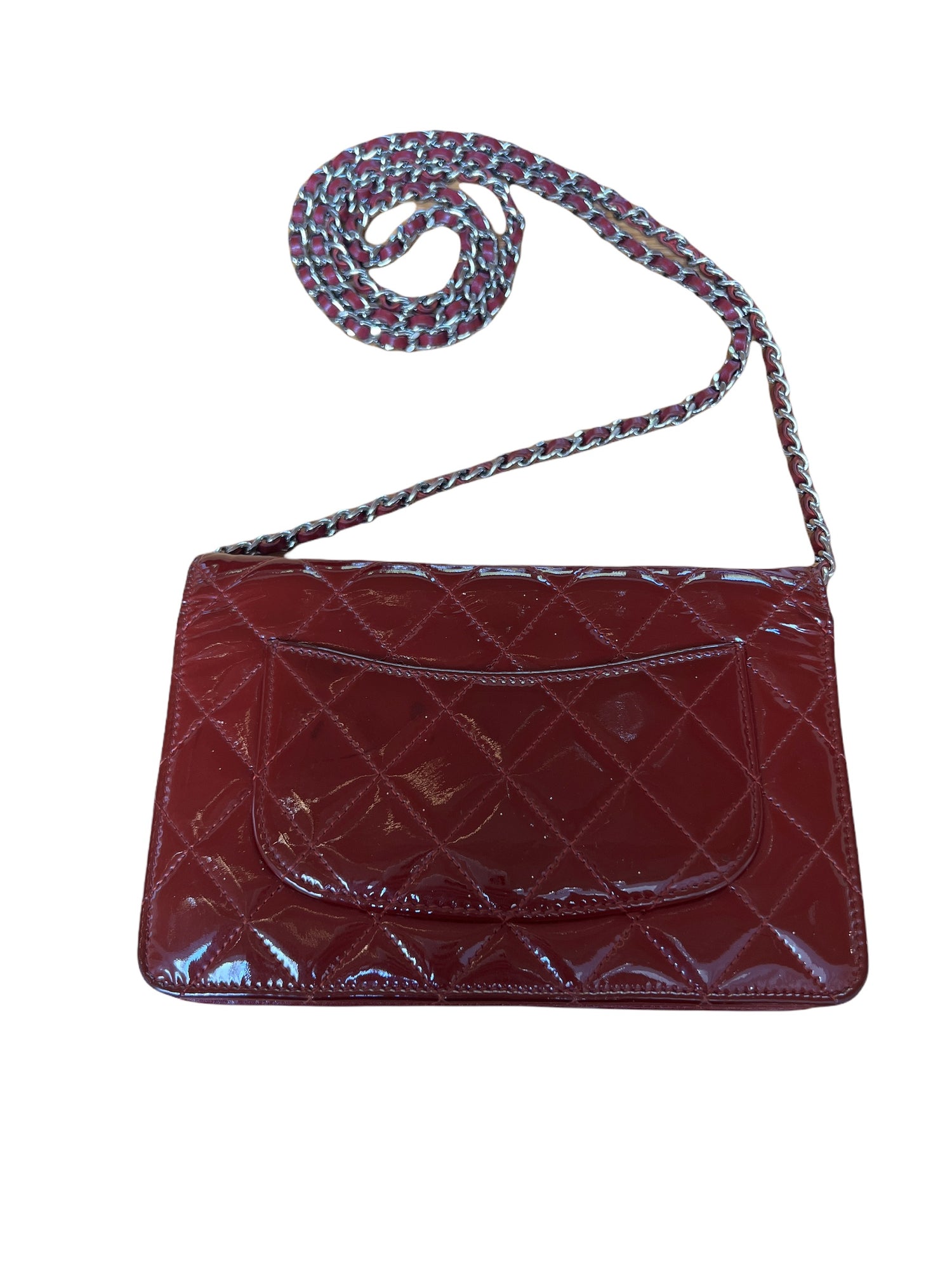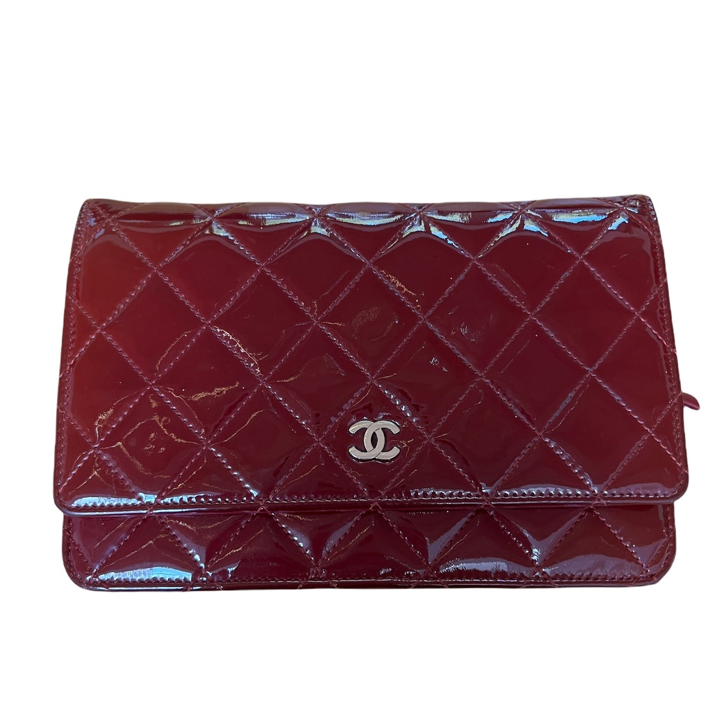 Chanel WOC from the Fall 2011 Collection by Karl Lagerfeld. Burgundy patent leather, Silver-tone hardware. Iconic chain-link shoulder strap. Canvas gros-grain lining. Four interior pockets. One zipper inside pocket. Six cards slots inside. Flap closure with snap button.