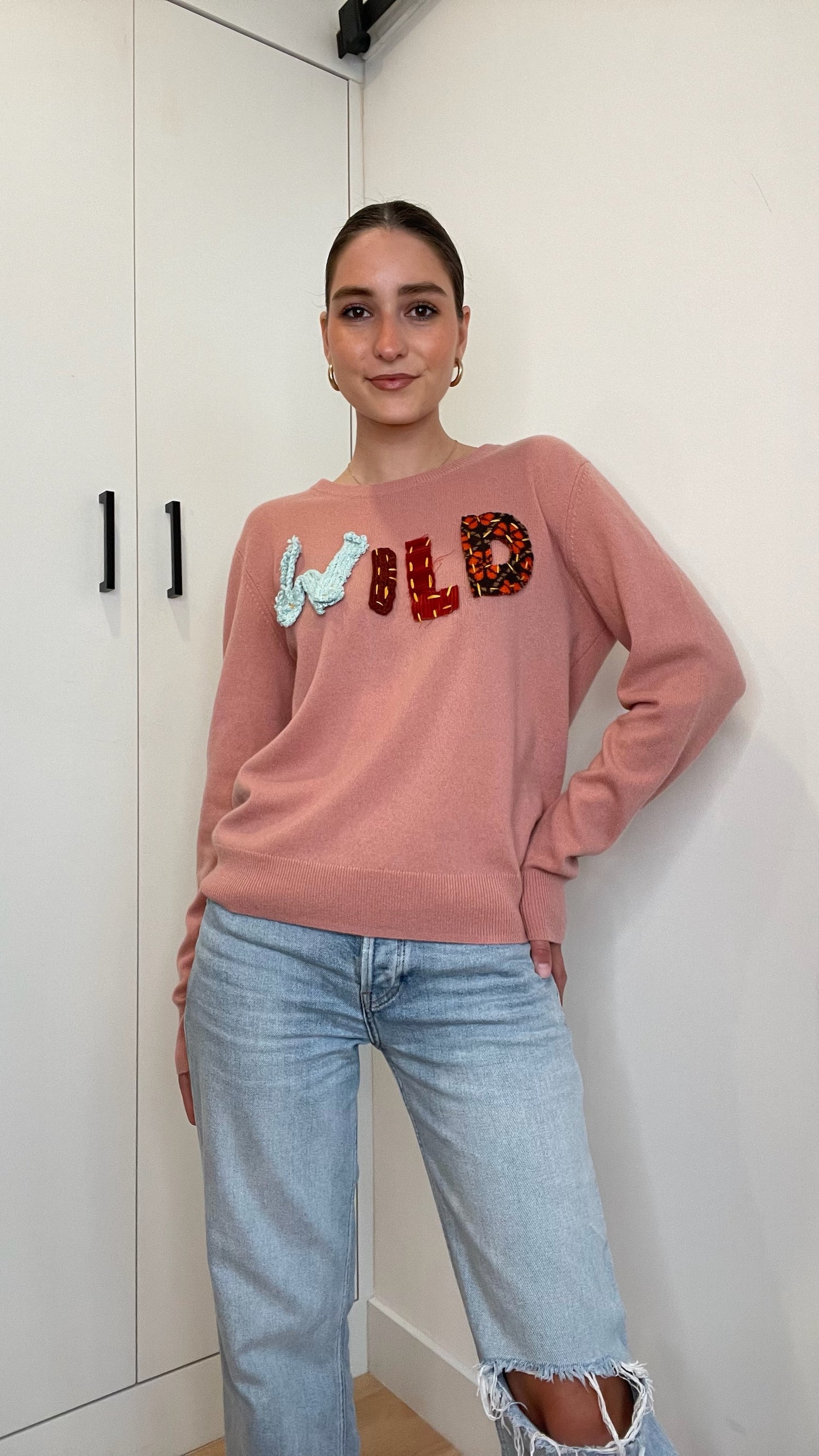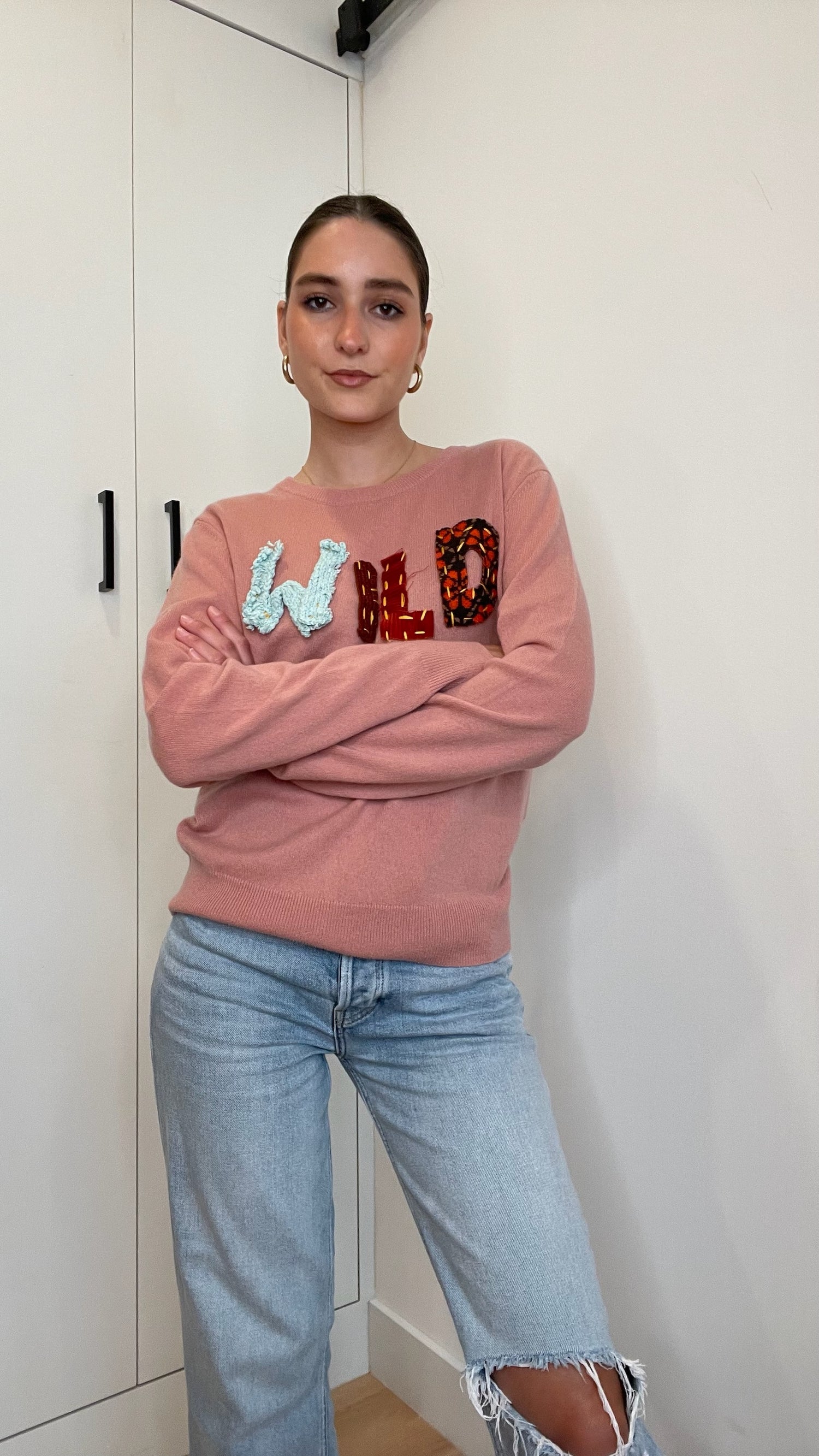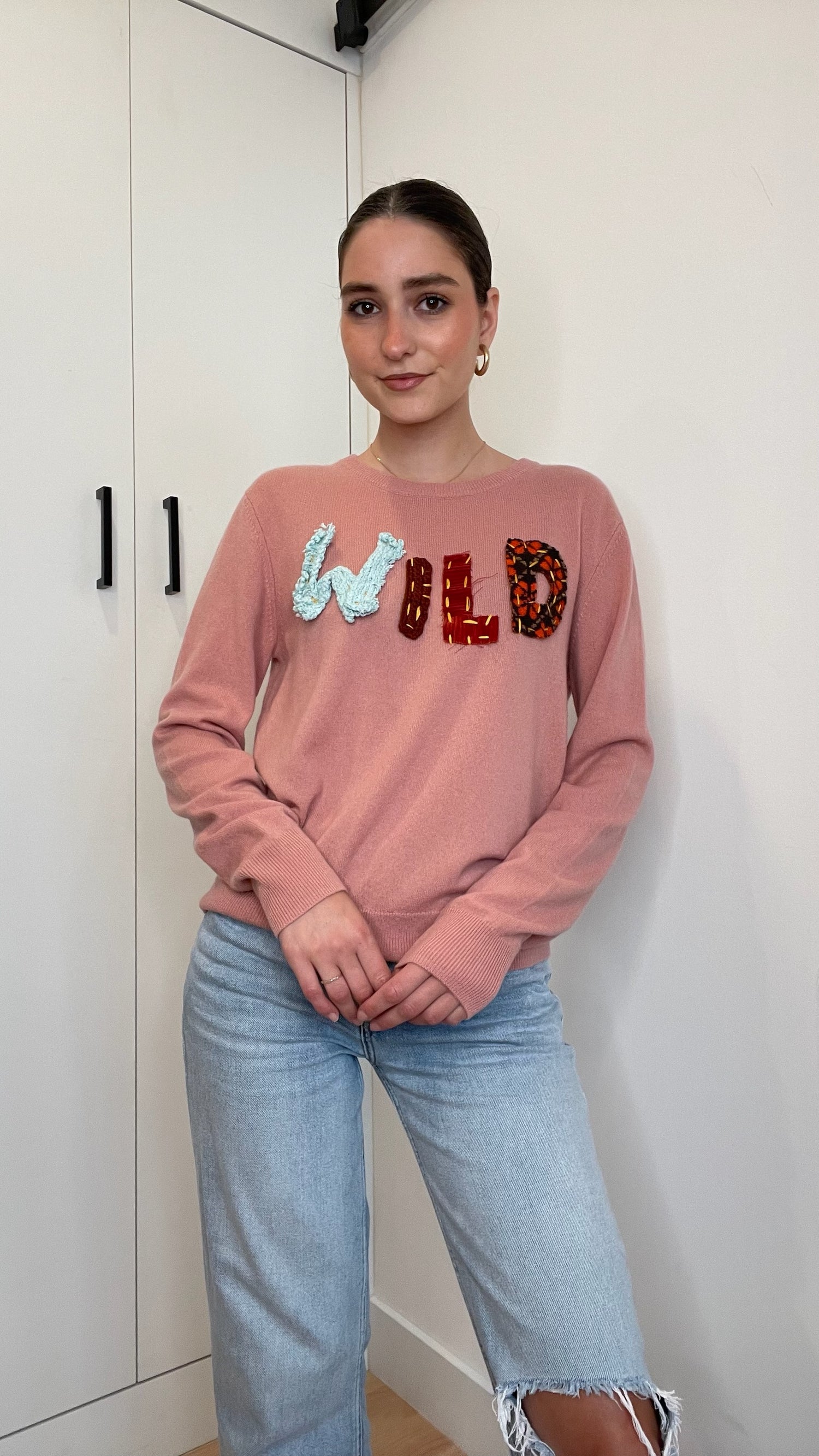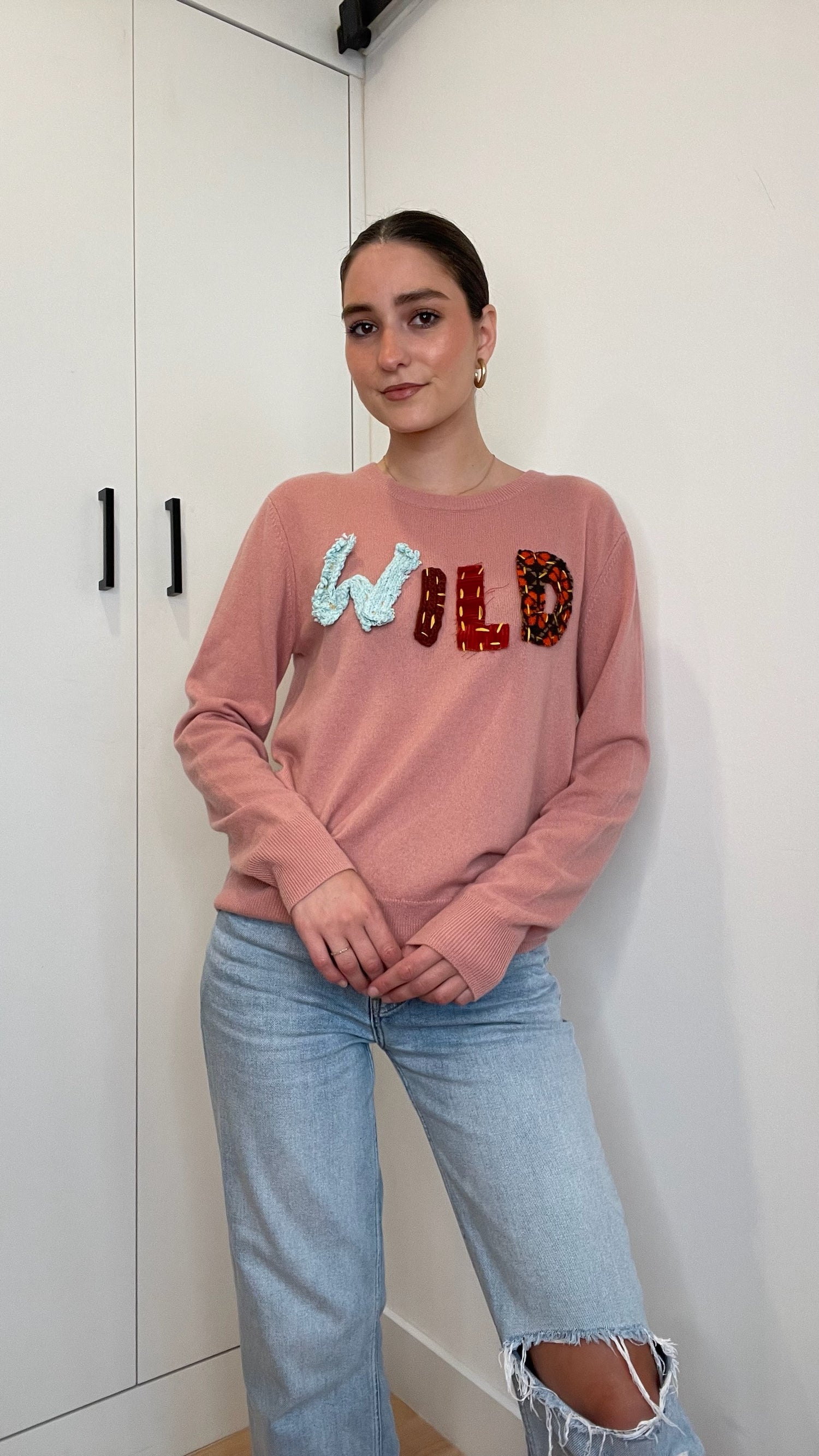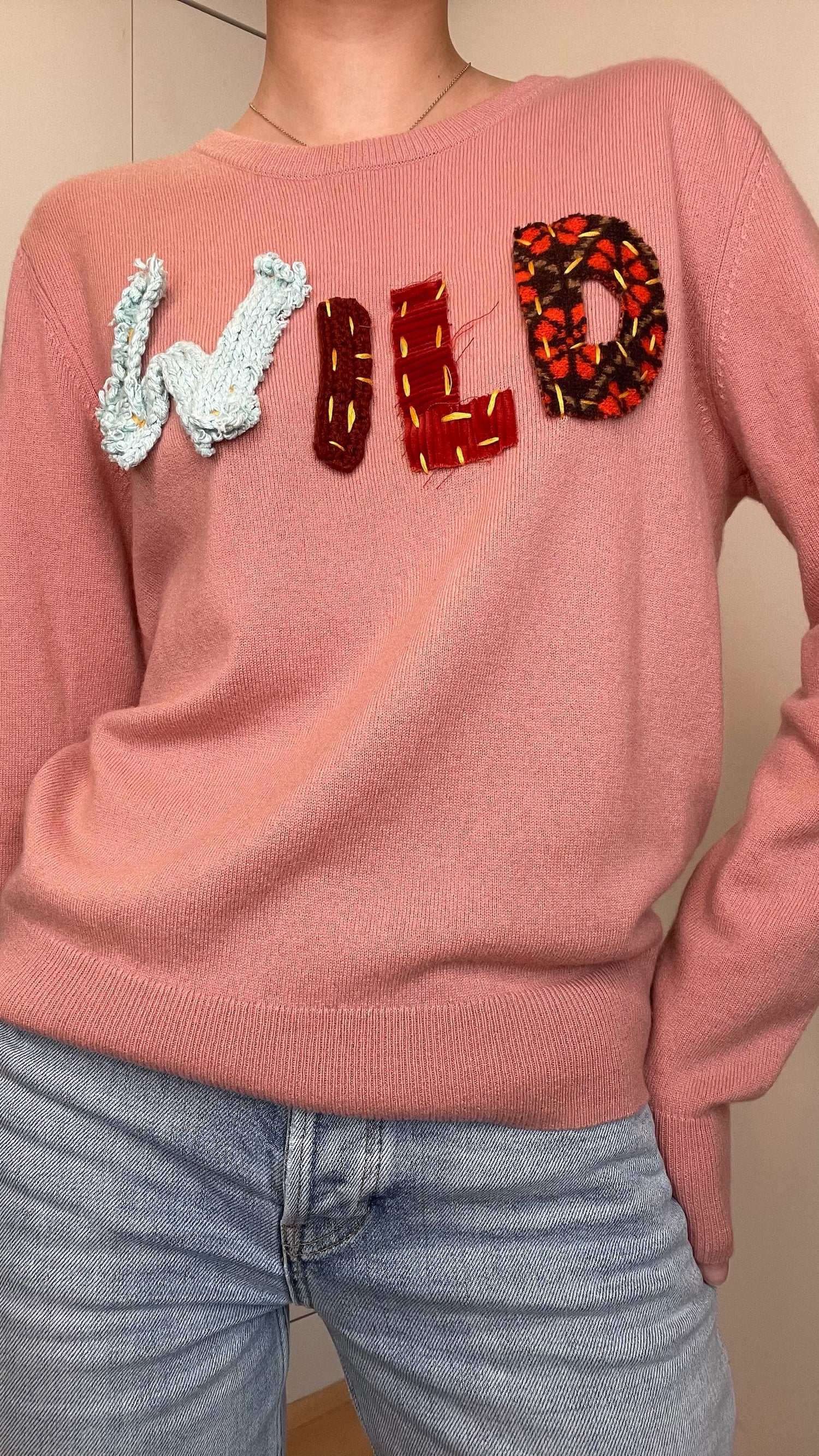 Lingua Franca cashmere sweater. Embroidered details at front with mixed fabric. Round neck. Designer size medium.