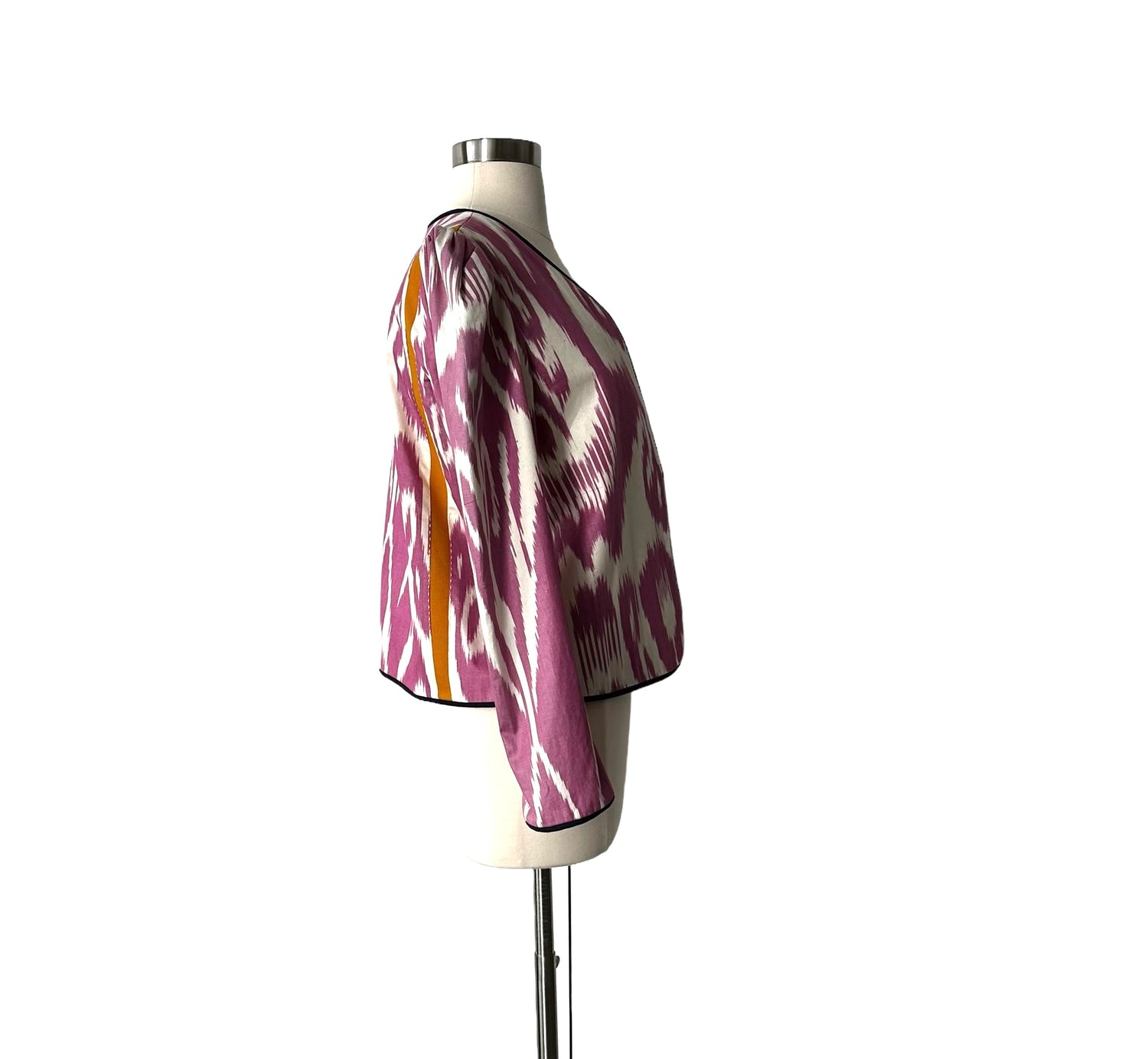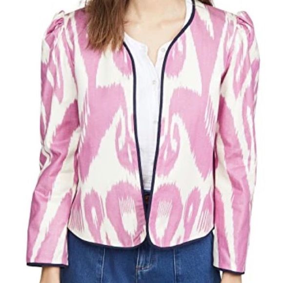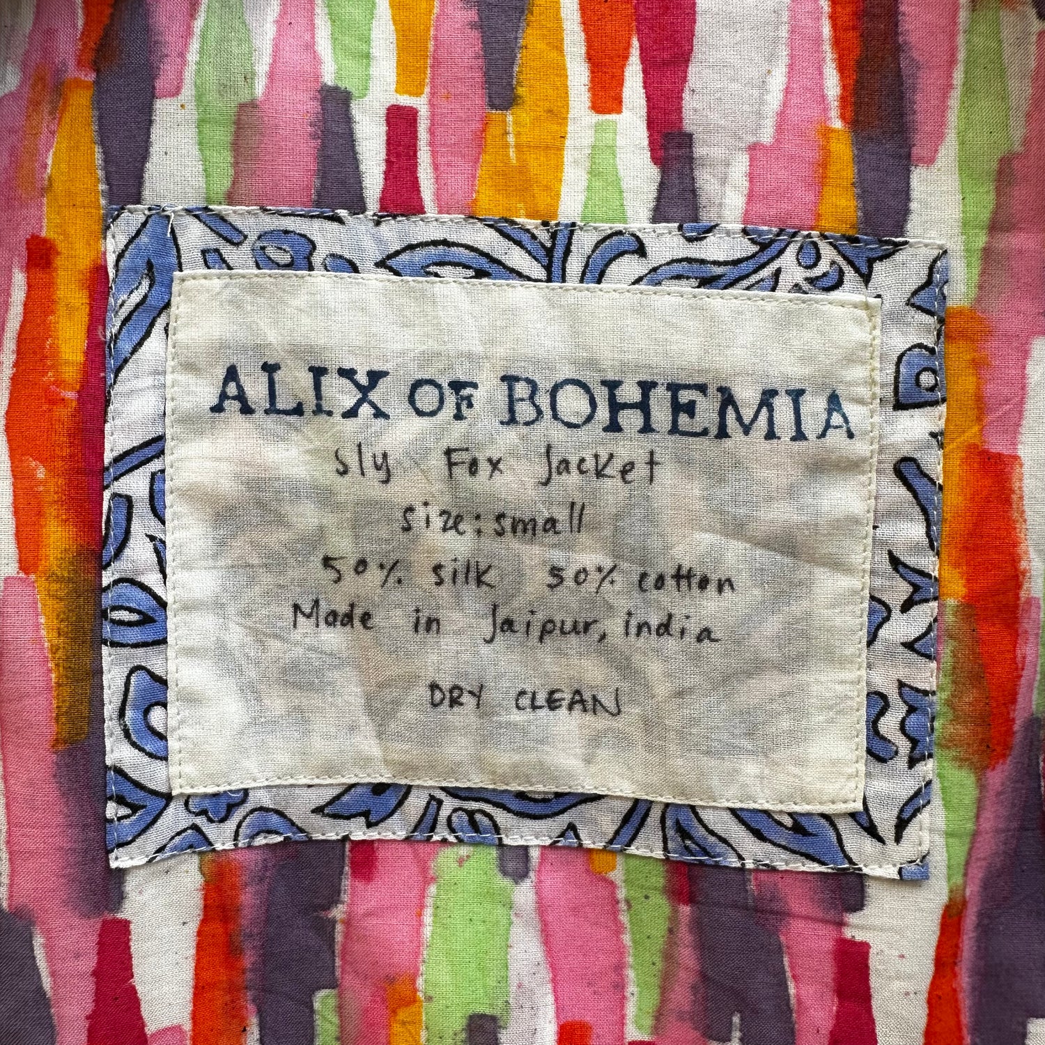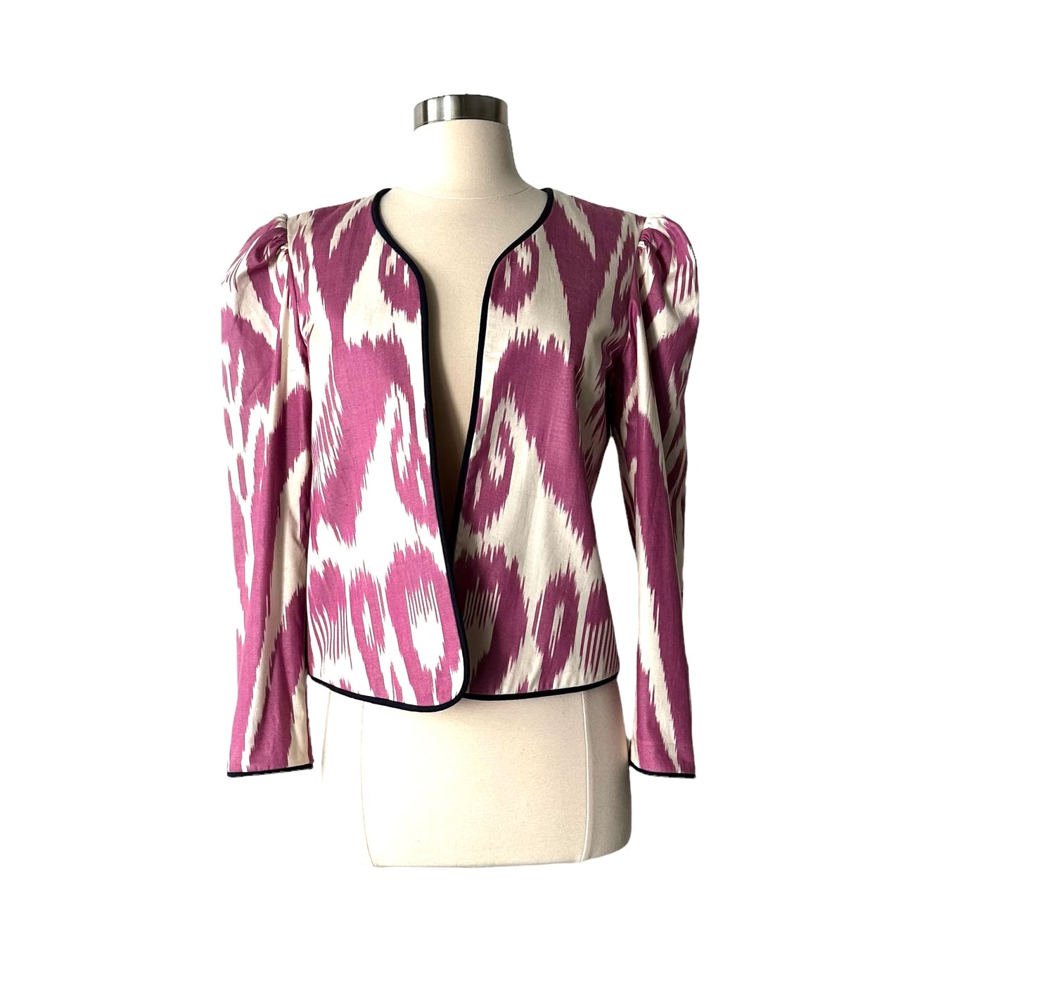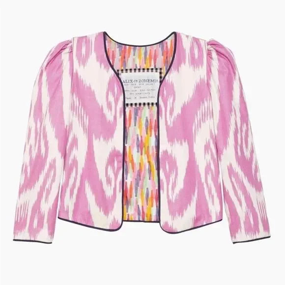 Alix of Bohemia jacket. Light pink and beige fabric. Open at front. Slightly puffy shoulders. Beautiful multicolor lining. These fabric are all imported from India and comes in such beautiful colors and textures. Slightly cropped silhouette. This Alix of Bohemia jacket is perfect for layering over clean white tees.Try cuffing the sleeves to show off the colorful interior pattern. Designer size Small.