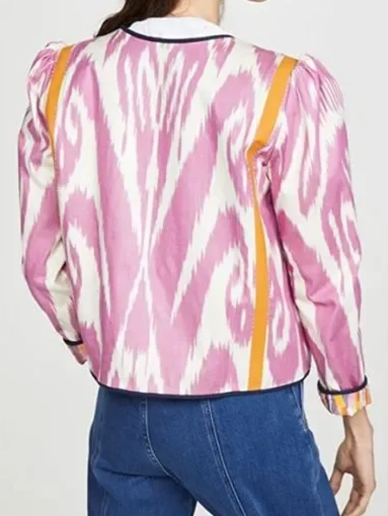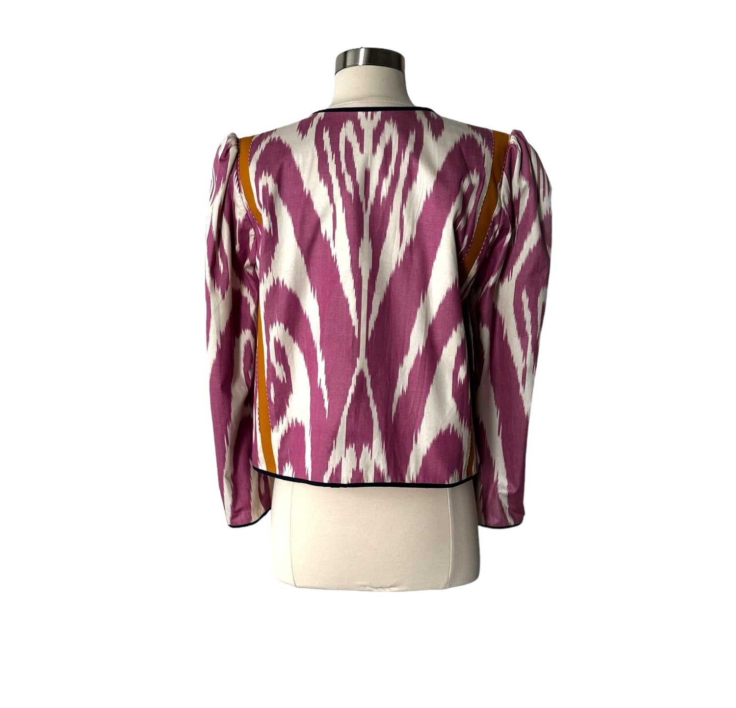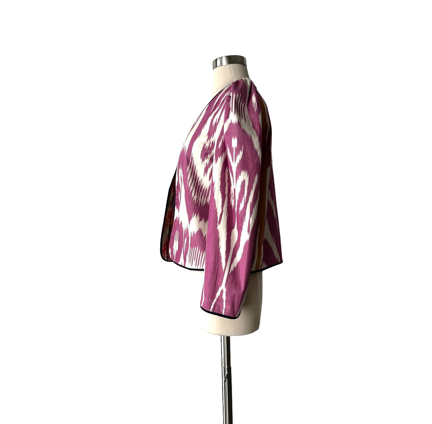 Alix of Bohemia jacket. Light pink and beige fabric. Open at front. Slightly puffy shoulders. Beautiful multicolor lining. These fabric are all imported from India and comes in such beautiful colors and textures. Slightly cropped silhouette. This Alix of Bohemia jacket is perfect for layering over clean white tees.Try cuffing the sleeves to show off the colorful interior pattern. Designer size Small.