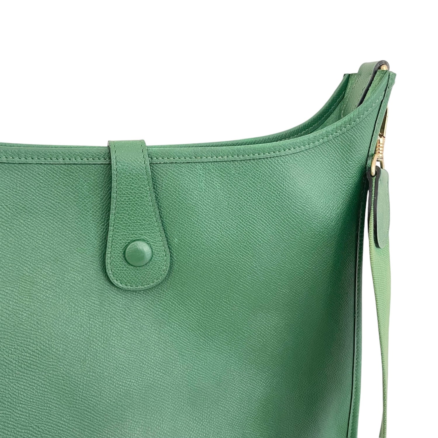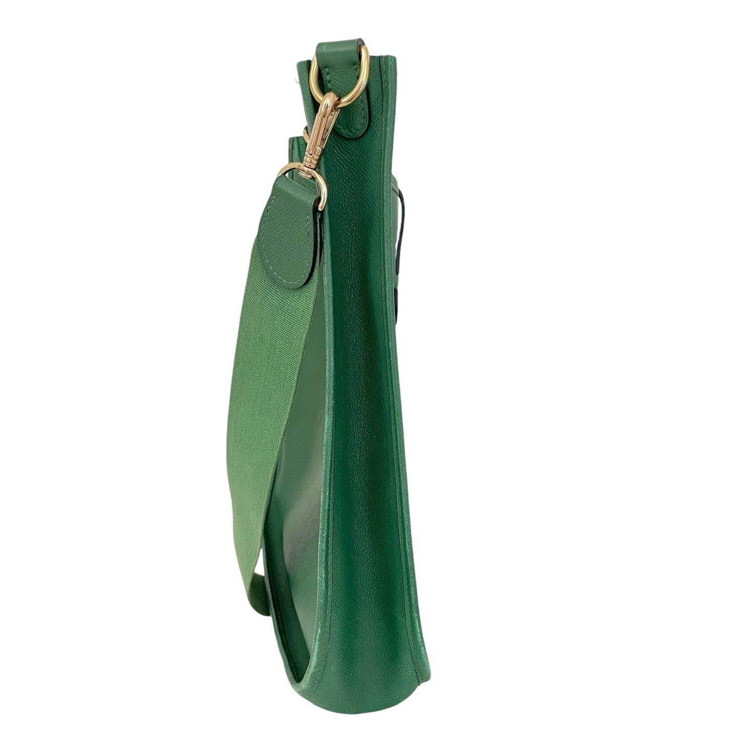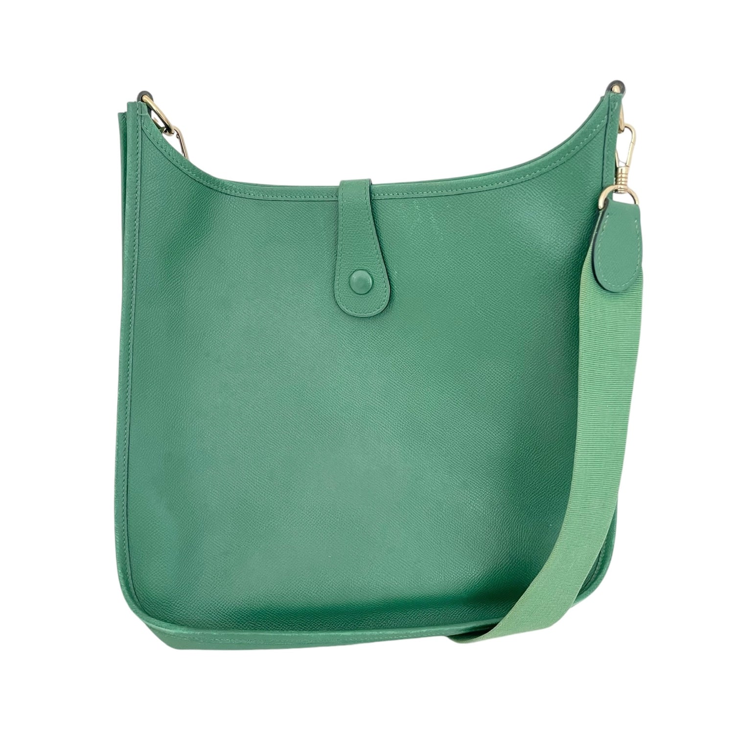 Hermes Evelyne crossbody bag. 1997 (A square) collection. Courchevel leather. Palladium plated hardware. Cotton strap. Unlined. Snap closure at top.