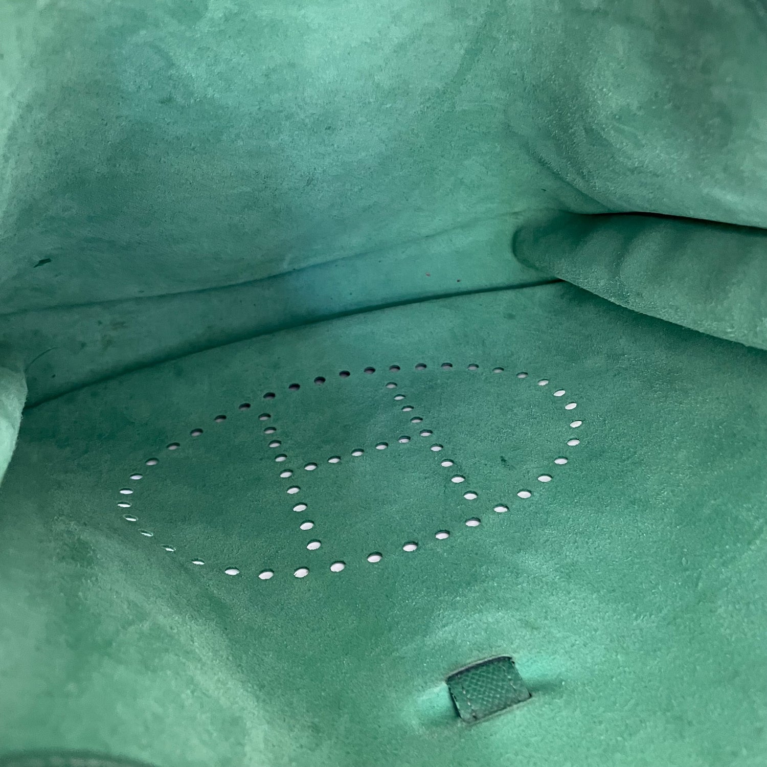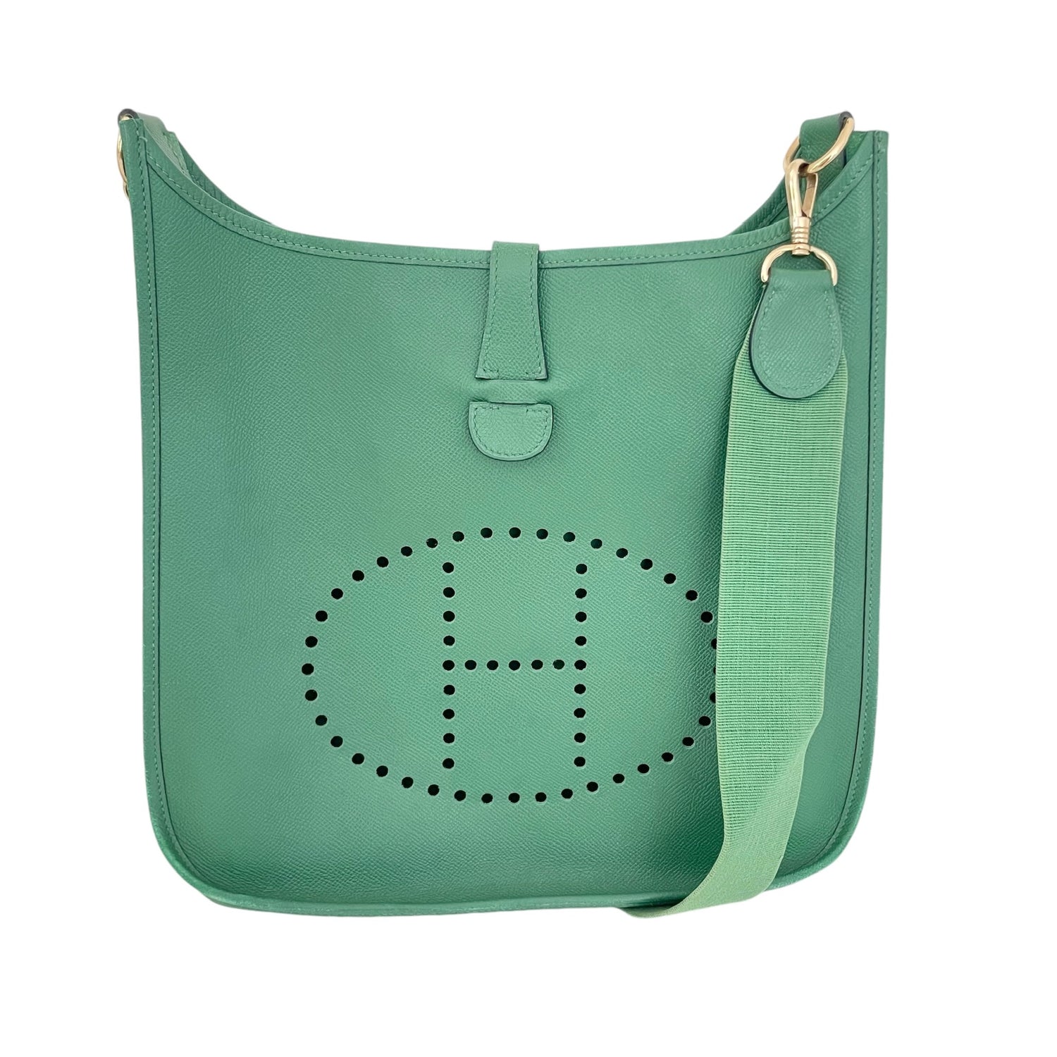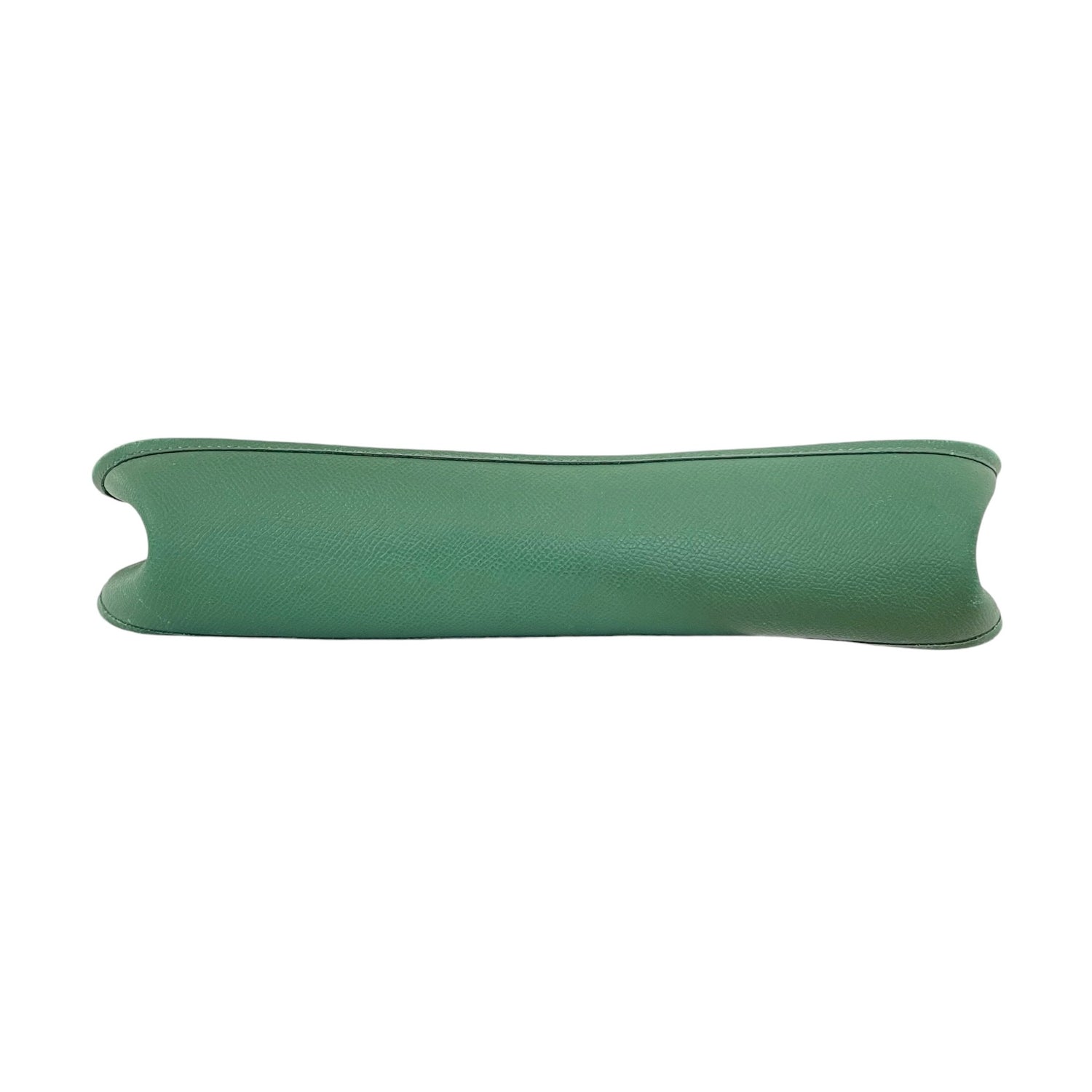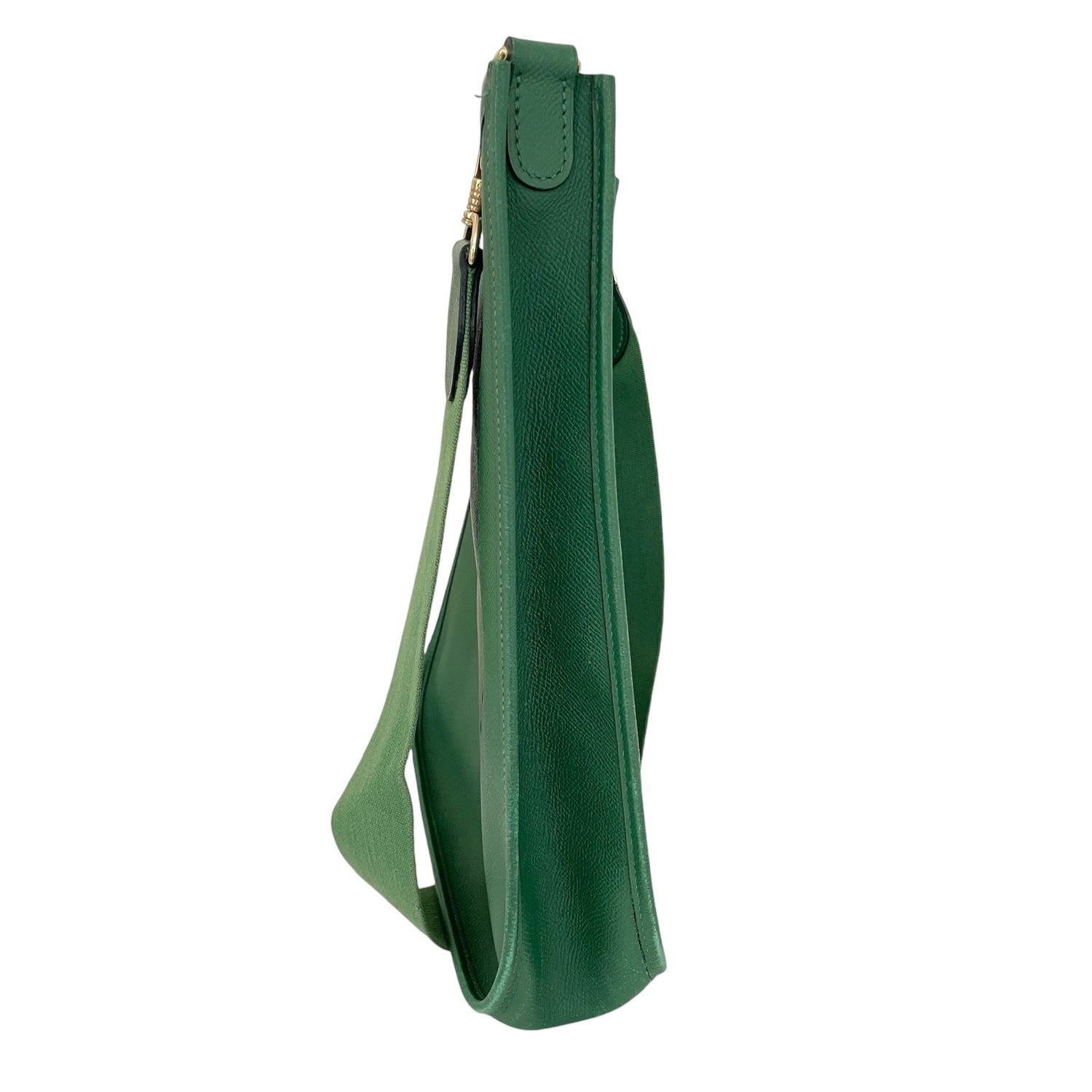 Hermes Evelyne crossbody bag. 1997 (A square) collection. Courchevel leather. Palladium plated hardware. Cotton strap. Unlined. Snap closure at top.