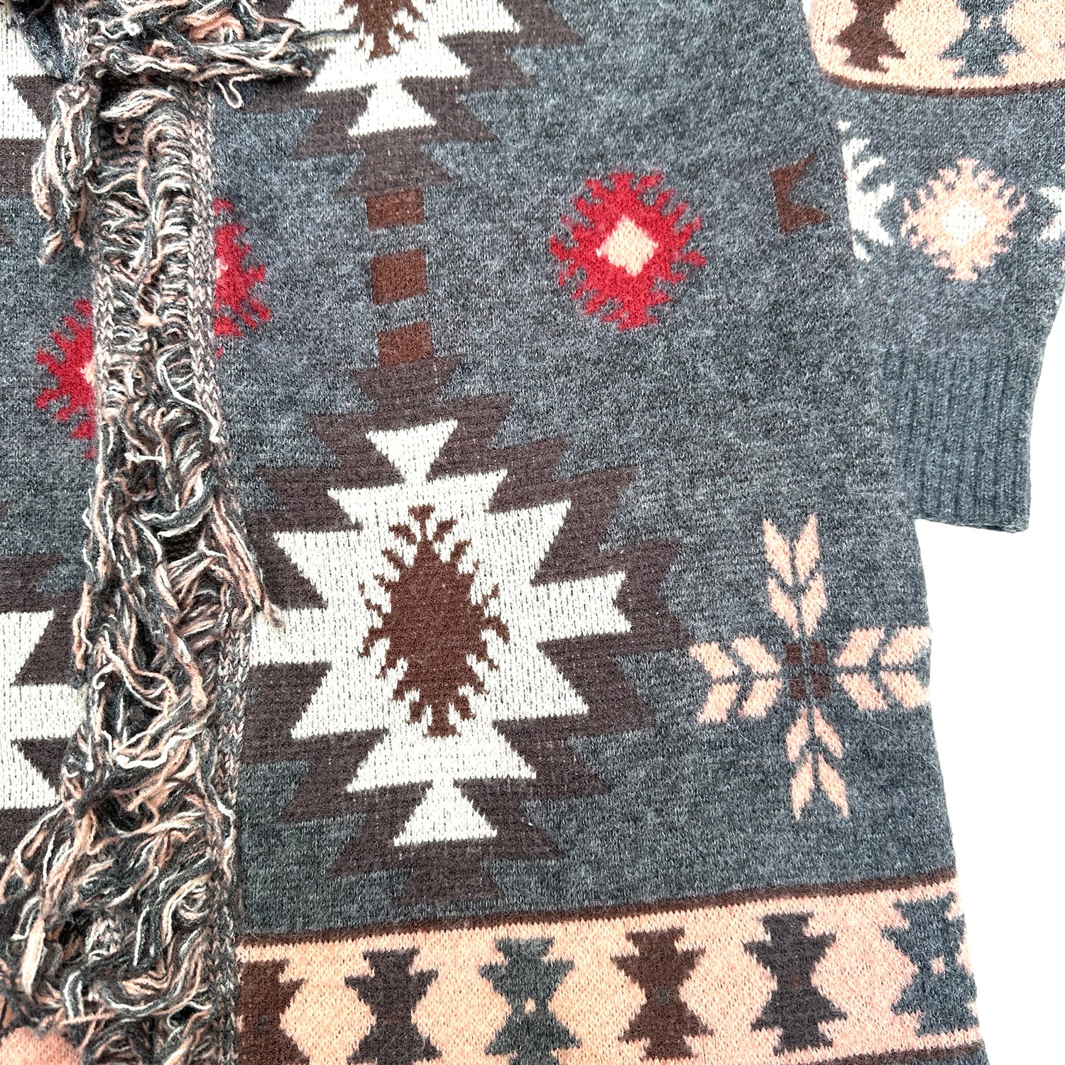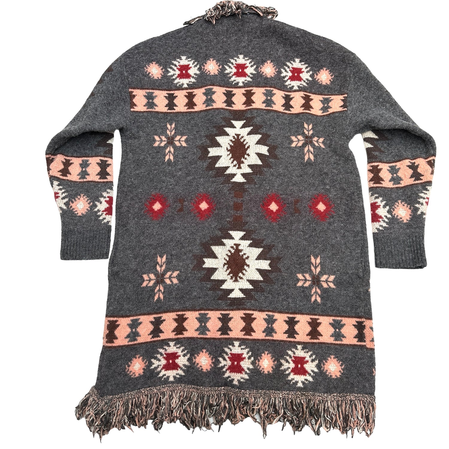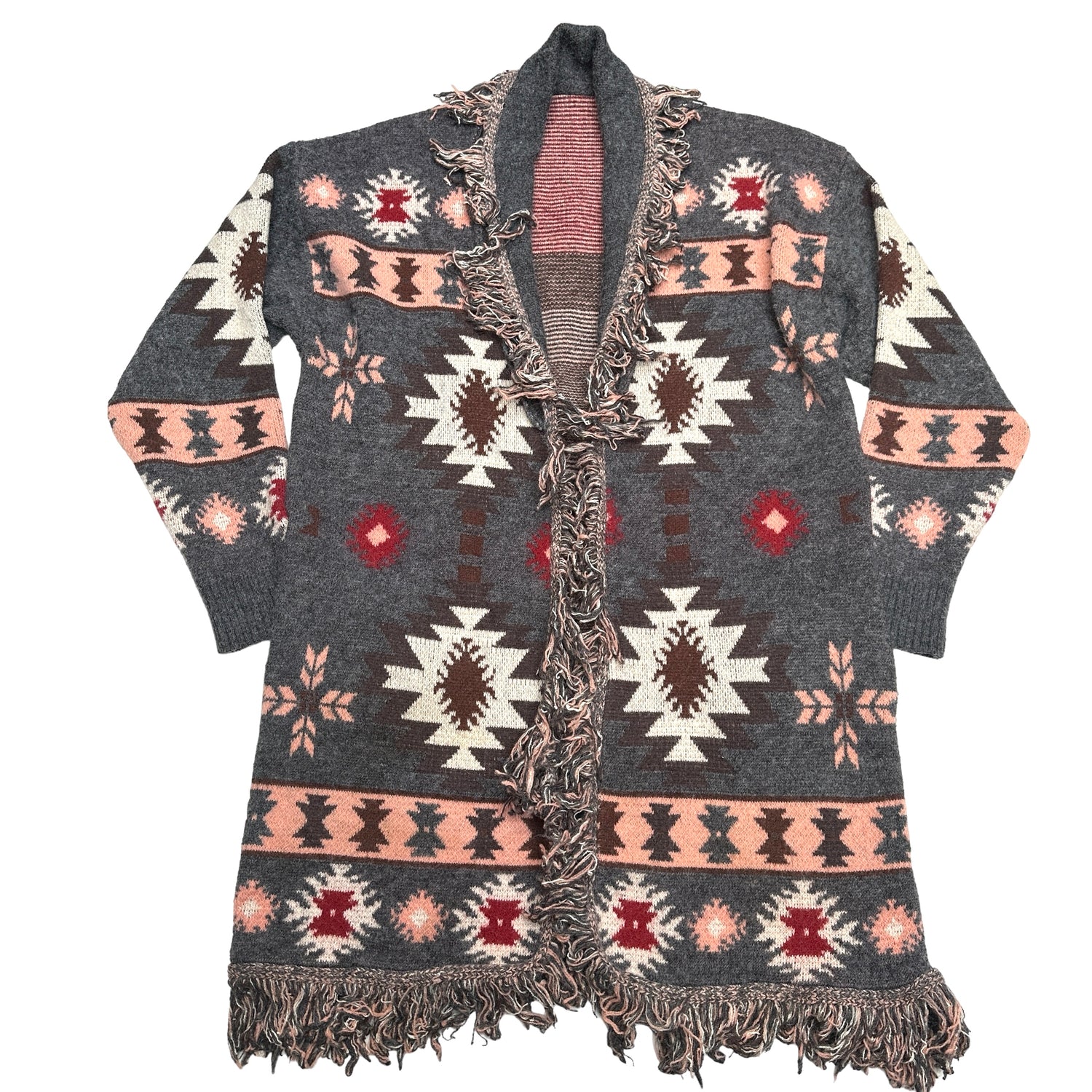 Grey and pink fringed sweater. Beautiful pattern. Long sleeves. Perfect for your late summer nights or fall.