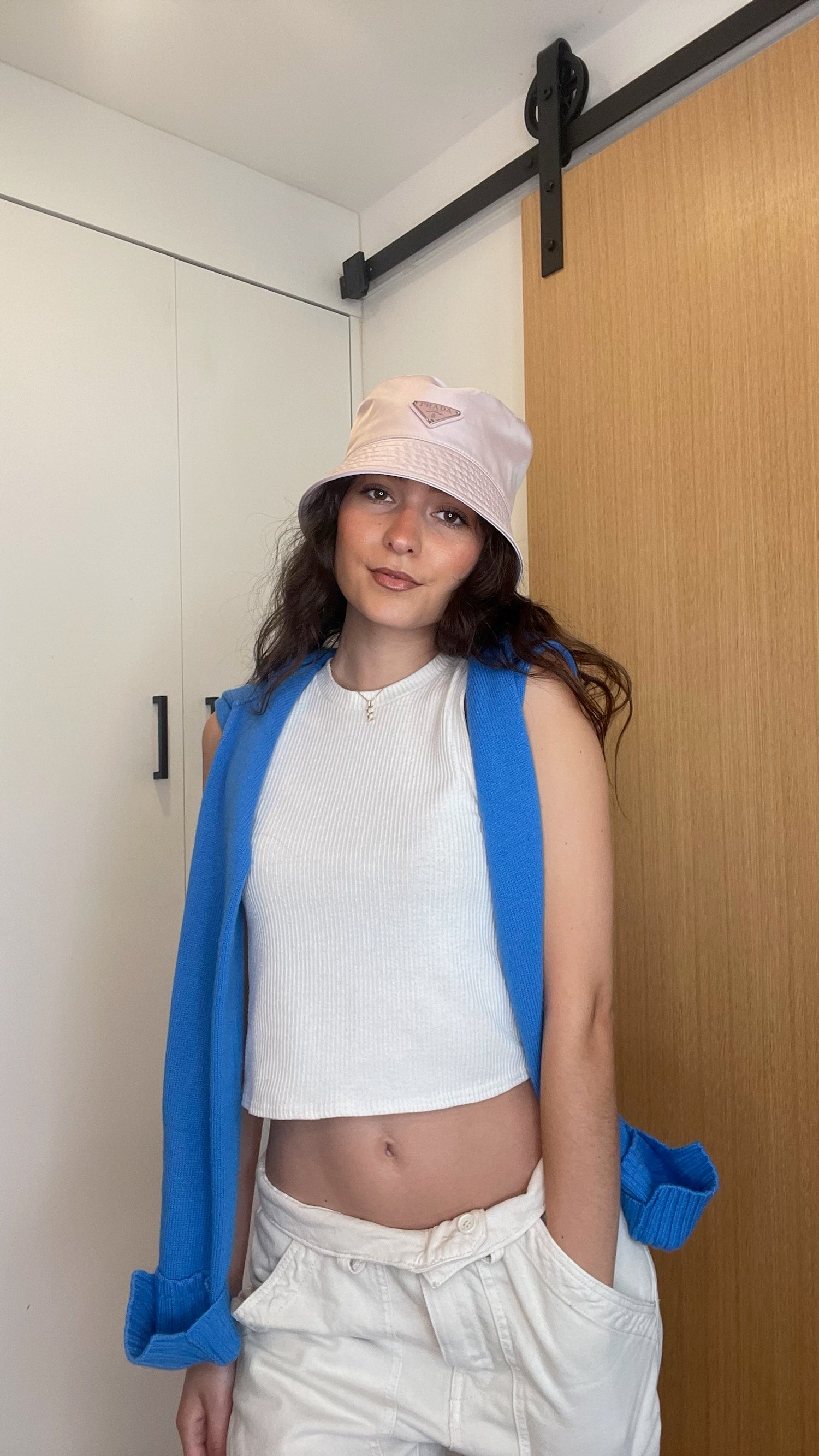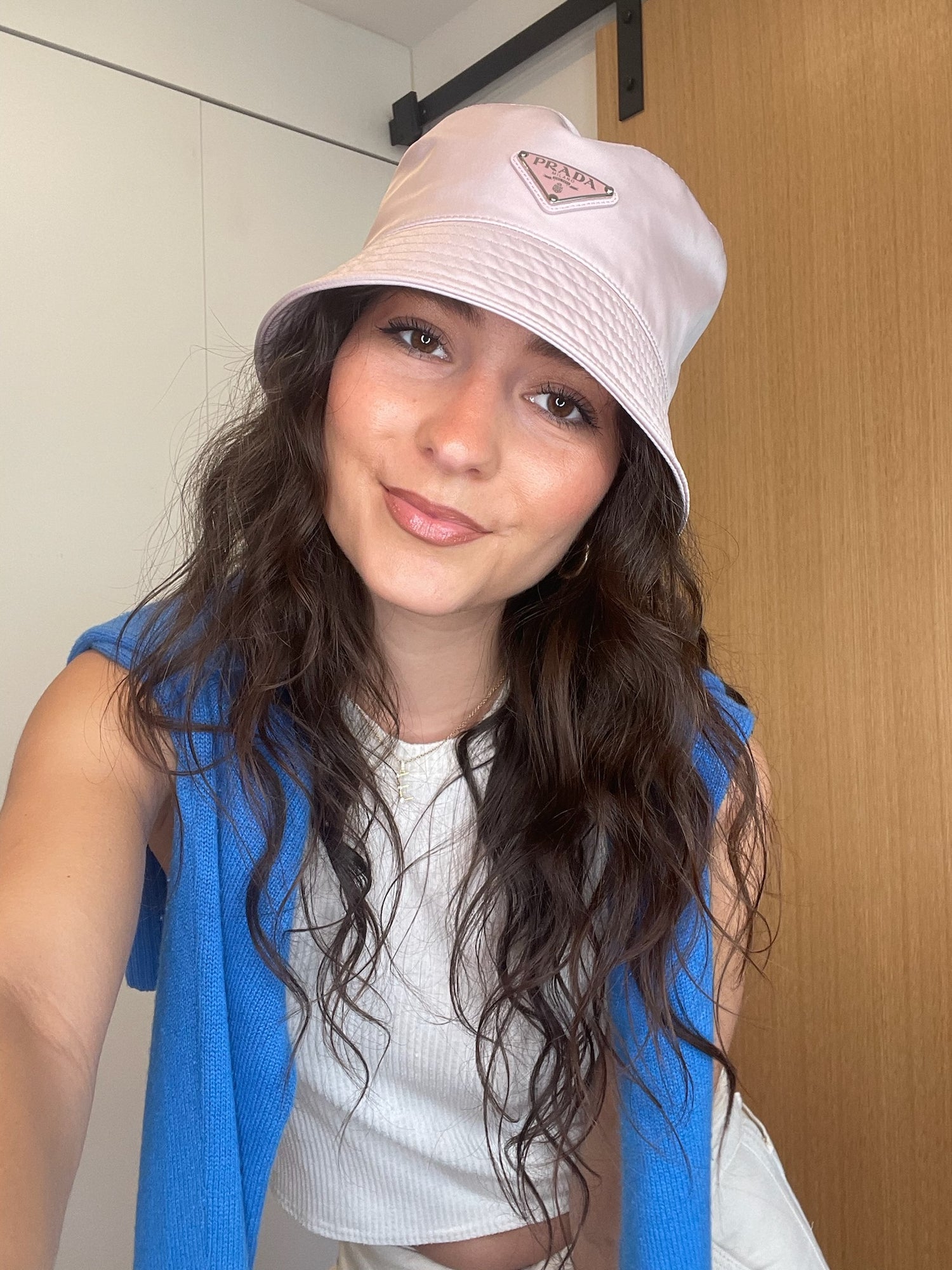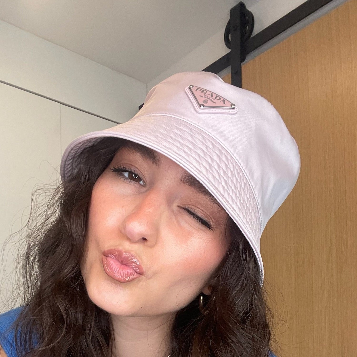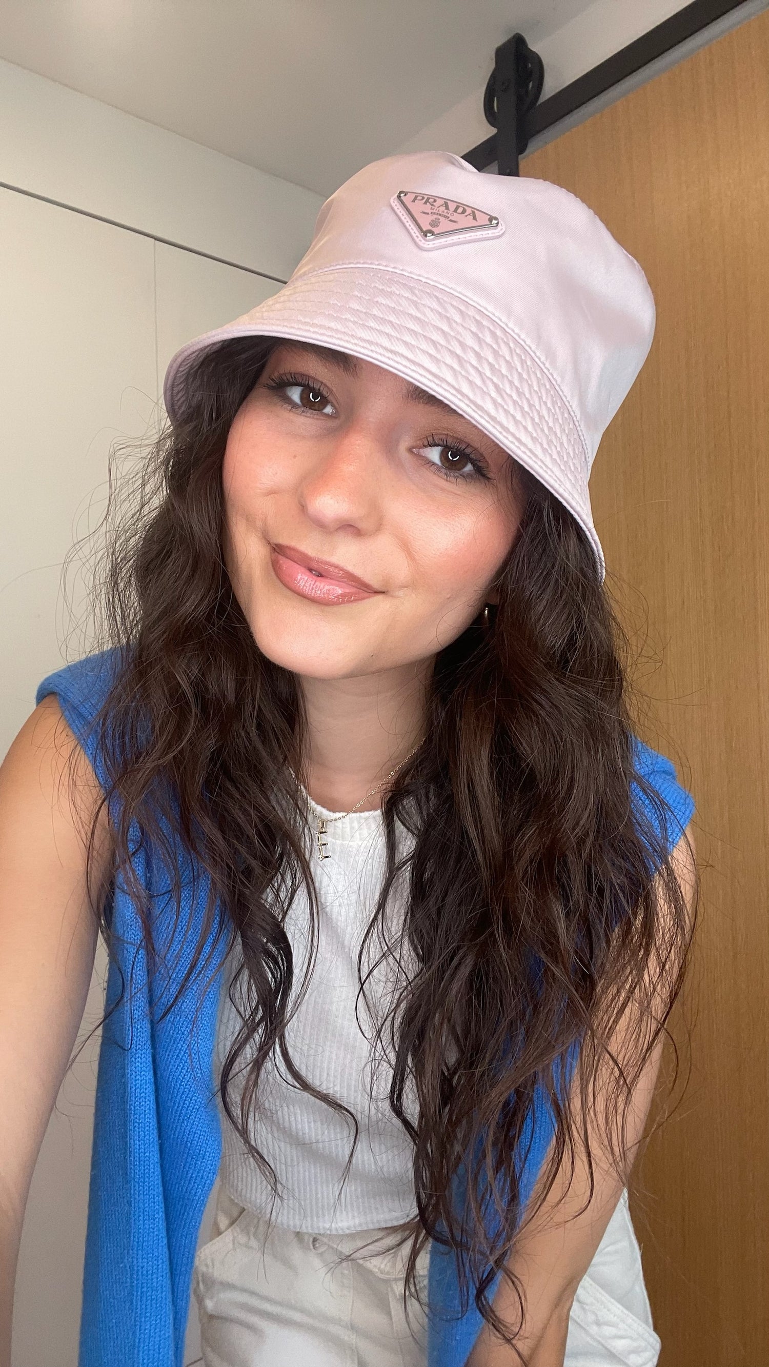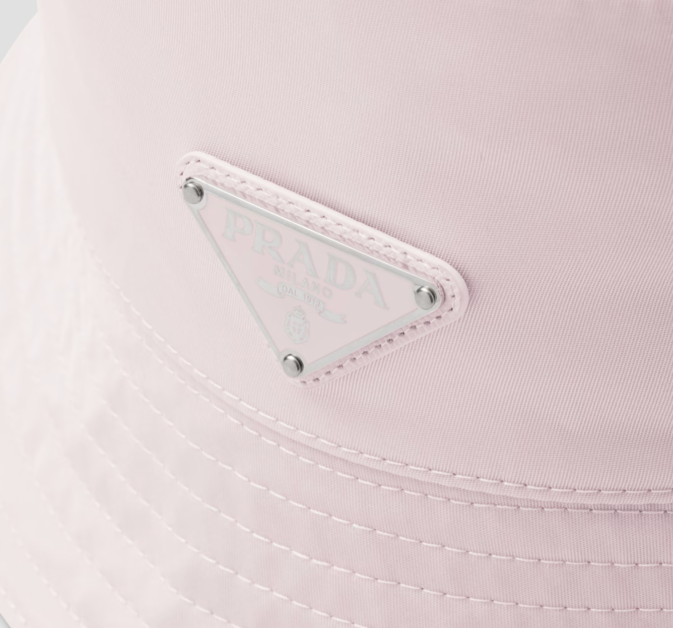 Prada pink nylon bucket hat. Silver and pink logo at front. Size medium.